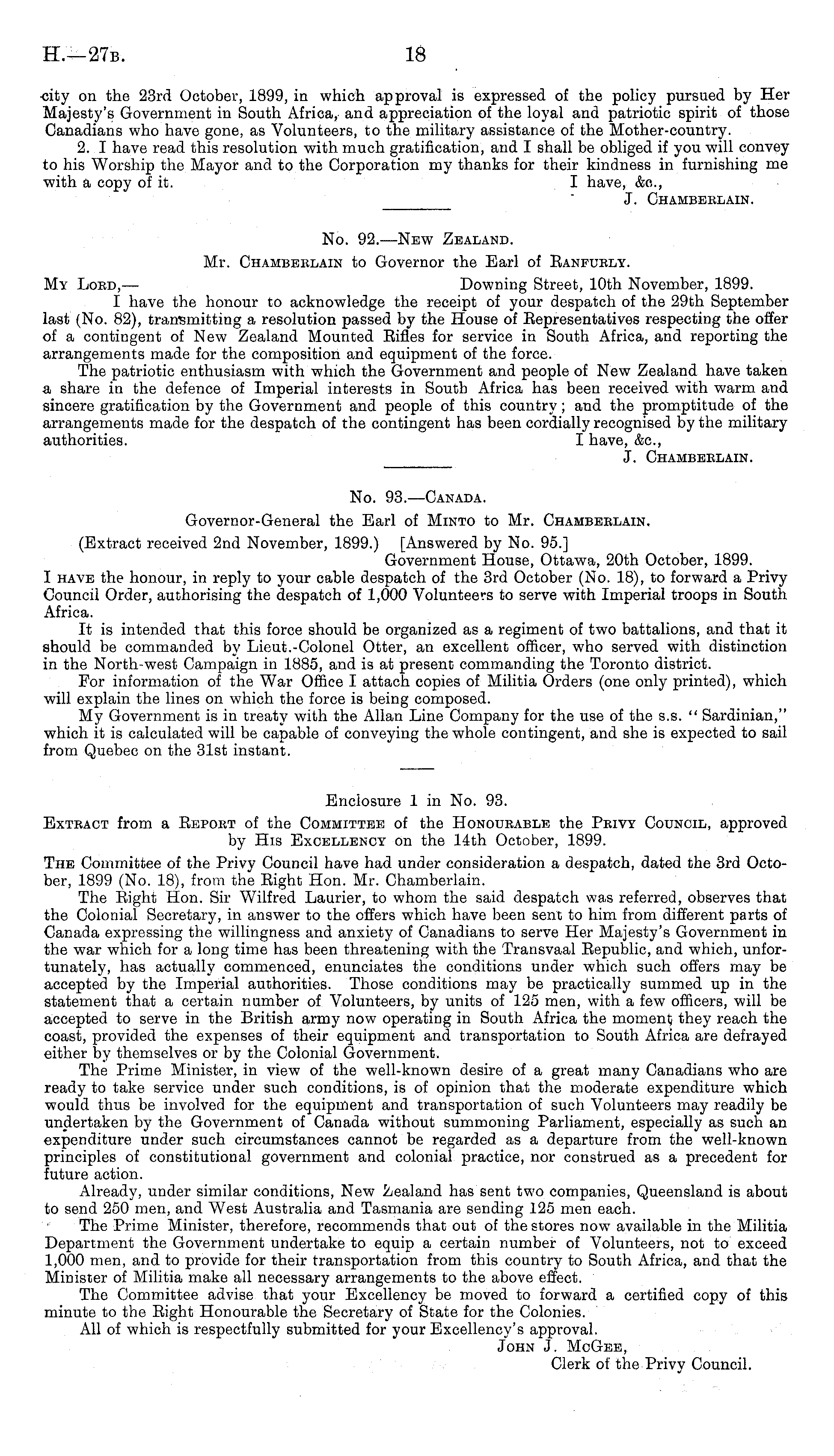 No. 93.—Canada. Governor-General the Earl of Minto to Mr. Chamberlain. (Extract received 2nd November, 1899.) [Answered by No. 95.] Government House, Ottawa, 20th October, 1899. I have the honour, in reply to your cable despatch of the 3rd October (No. 18), to forward a Privy Council Order, authorising the despatch of 1,000 Volunteers to serve with Imperial troops in South Africa. It is intended that this force should be organized as a regiment of two battalions, and that it should be commanded by Lieut.-Colonel Otter, an excellent officer, who served with distinction in the North-west Campaign in 1885, and is at present commanding the Toronto district. For information of the War Office I attach copies of Militia Orders (one only printed), which will explain the lines on which the force is being composed. My Government is in treaty with the Allan Line Company for the use of the s.s. " Sardinian," which it is calculated will be capable of conveying the whole contingent, and she is expected to sail from Quebec on the 31st instant.