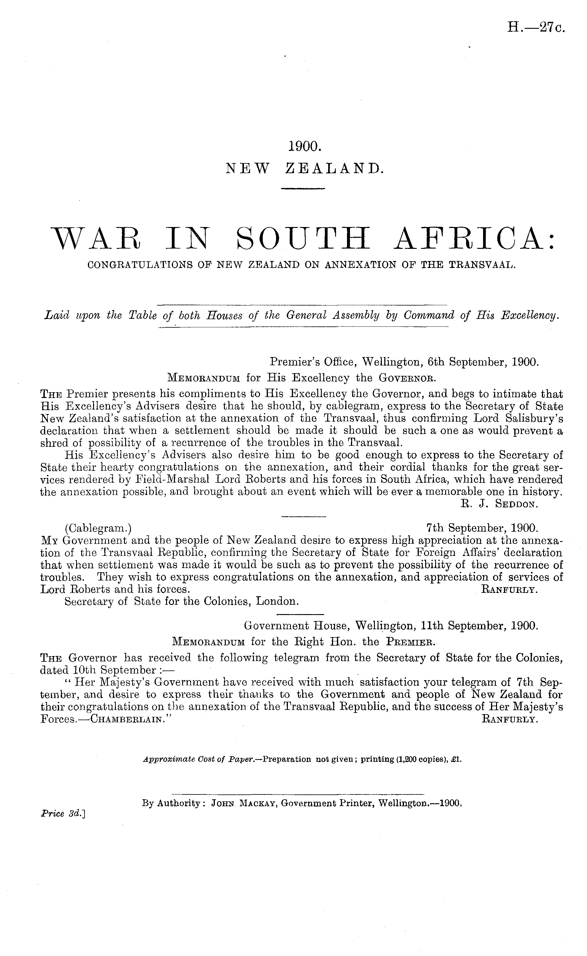 Premier's Office, Wellington, 6th September, 1900. Memorandum for His Excellency the Governor. The Premier presents his compliments to His Excellency the Governor, and begs to intimate that His Excellency's Advisers desire that he should, by cablegram, express to the Secretary of State New Zealand's satisfaction at the annexation of the Transvaal, thus confirming Lord Salisbury's declaration that when a settlement should be made it should be such a one as would prevent a shred of possibility of a recurrence of the troubles in the Transvaal. His Excellency's Advisers also desire him to be good enough to express to the Secretary of State their hearty congratulations on the annexation, and their cordial thanks for the great services rendered by Field-Marshal Lord Eoberts and his forces in South Africa, which have rendered the annexation possible, and brought about an event which will be ever a memorable one in history. E. J. Seddon.