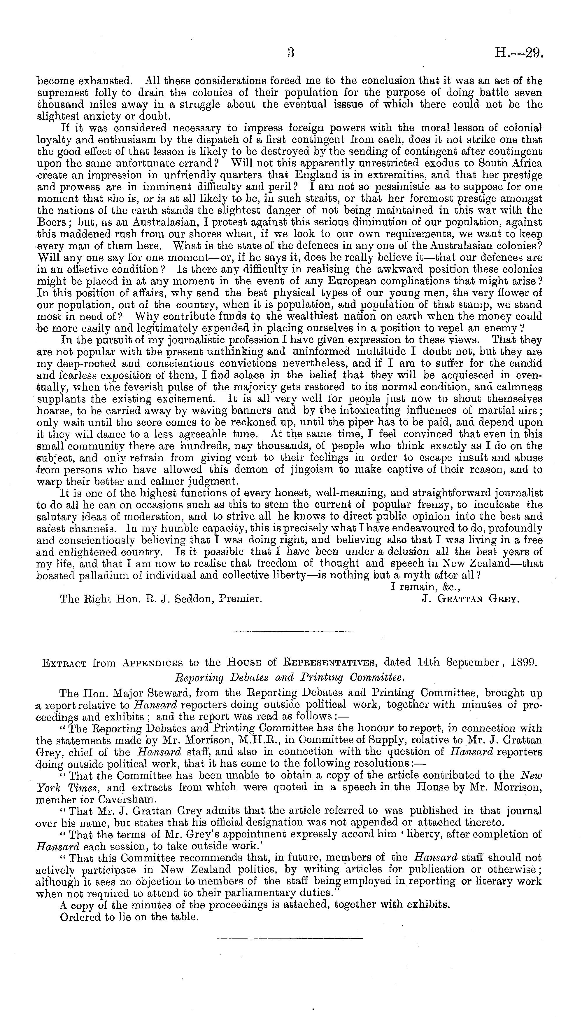 Exteact from Appendices to the House of Eepeesentatives, dated 14th September, 1899. Beporting Debates and Printing Committee. The Hon. Major Steward, from the Eeporting Debates and Printing Committee, brought up a report relative to Hansard reporters doing outside political work, together with minutes of proceedings and exhibits ; and the report was read as follows : — "The Eeporting Debates and Printing Committee has the honour to report, in connection with the statements made by Mr. Morrison, M.H.E., in Committee of Supply, relative to Mr. J. Grattan Grey, chief of the Hansard staff, and also in connection with the question of Hansard reporters doing outside political work, that it has come to the following resolutions:— '' That the Committee has been unable to obtain a copy of the article contributed to the New York Times, and extracts from which were quoted in a speech in the House by Mr. Morrison, member for Caversham. " That Mr. J. Grattan Grey admits that the article referred to was published in that journal over his name, but states that his official designation was not appended or attached thereto. " That the terms of Mr. Grey's appointment expressly accord him ' liberty, after completion of Hansard each session, to take outside work.' " That this Committee recommends that, in future, members of the Hansard staff should not actively participate in New Zealand politics, by writing articles for publication or otherwise; although it sees no objection to members of the staff being employed in reporting or literary work when not required to attend to their parliamentary duties." A copy of the minutes of the proceedings is attached, together with exhibits. Ordered to lie on the table.