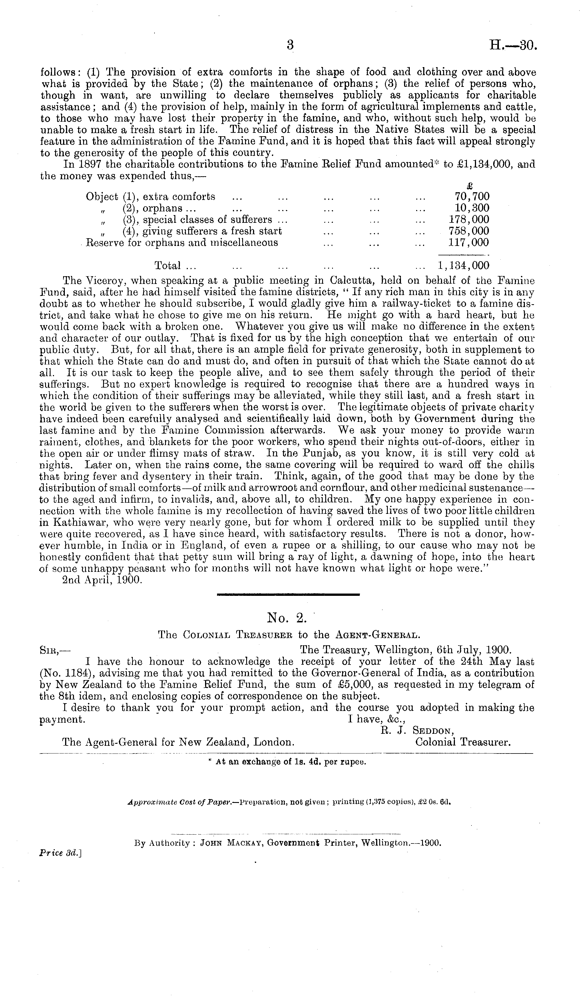 No. 2. The Colonial Treasures to the Agent-General. Sib,— The Treasury, Wellington, 6th July, 1900. I have the honour to acknowledge the receipt of your letter of the 24th May last (No. 1184), advising me that you had remitted to the Governor-General of India, as a contribution by New Zealand to the Famine Belief Fund, the sum of £5,000, as requested in my telegram of the Bth idem, and enclosing copies of correspondence on the subject. I desire to thank you for your prompt action, and the course you adopted in making the payment. I have, &c, R. J. Seddon, The Agent-General for New Zealand, London. Colonial Treasurer.