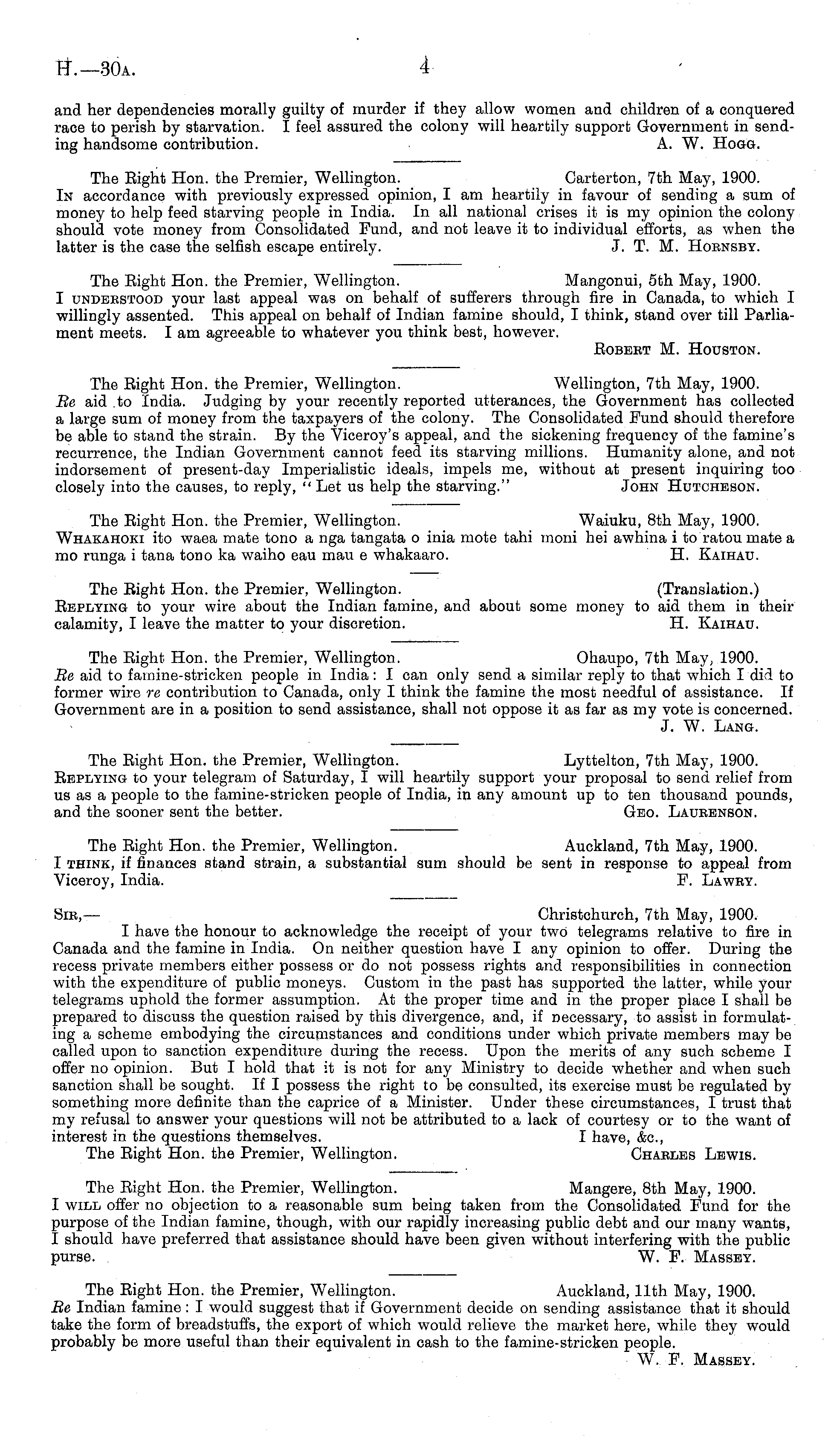 The Eight Hon. the Premier, Wellington. Lyttelton, 7th May, 1900. Eeplying to your telegram of Saturday, I will heartily support your proposal to send relief from us as a people to the famine-stricken people of India, in any amount up to ten thousand pounds, and the sooner sent the better. Geo. Laueenson.