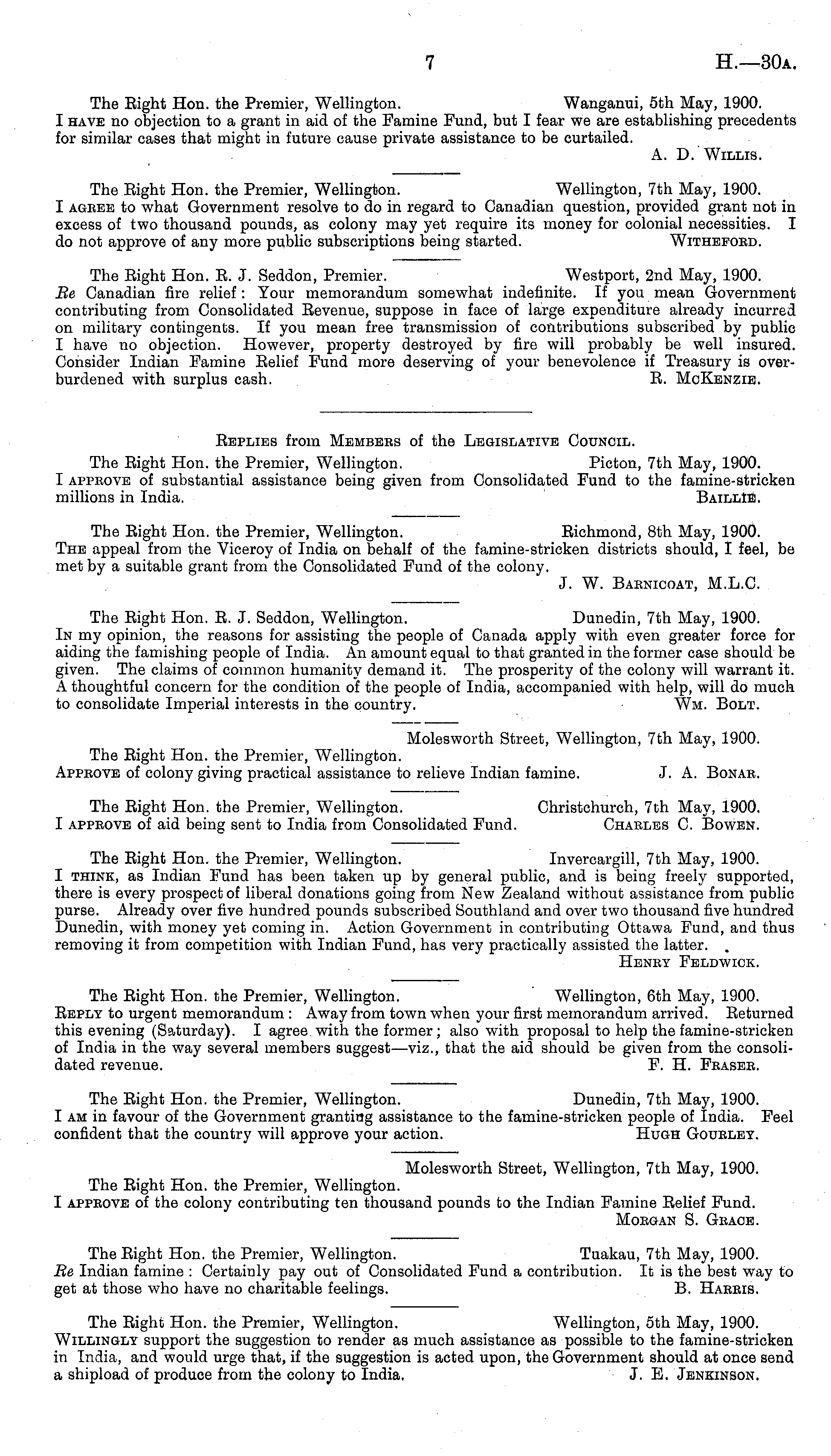 Eeplies from Membees of the Legislative Council. The Eight Hon. the Premier, Wellington. Picton, 7th May, 1900. I approve of substantial assistance being given from Consolidated Fund to the famine-stricken millions in India. Baillie.