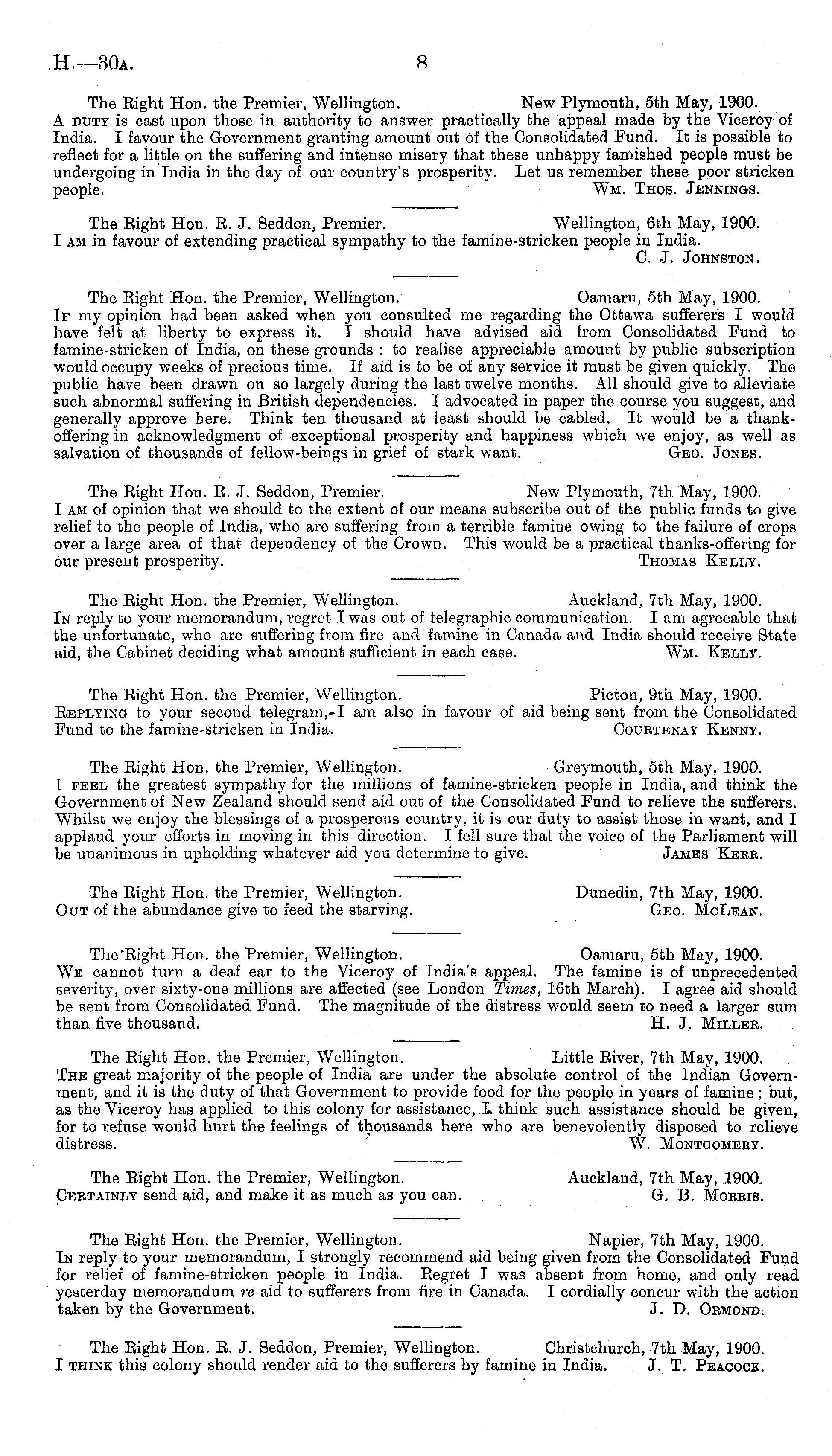 The Eight Hon. E. J. Seddon, Premier. New Plymouth, 7th May, 1900. I am of opinion that we should to the extent of our means subscribe out of the public funds to give relief to the people of India, who are suffering from a terrible famine owing to the failure of crops over a large area of that dependency of the Crown. This would be a practical thanks-offering for our present prosperity. Thomas Kelly.