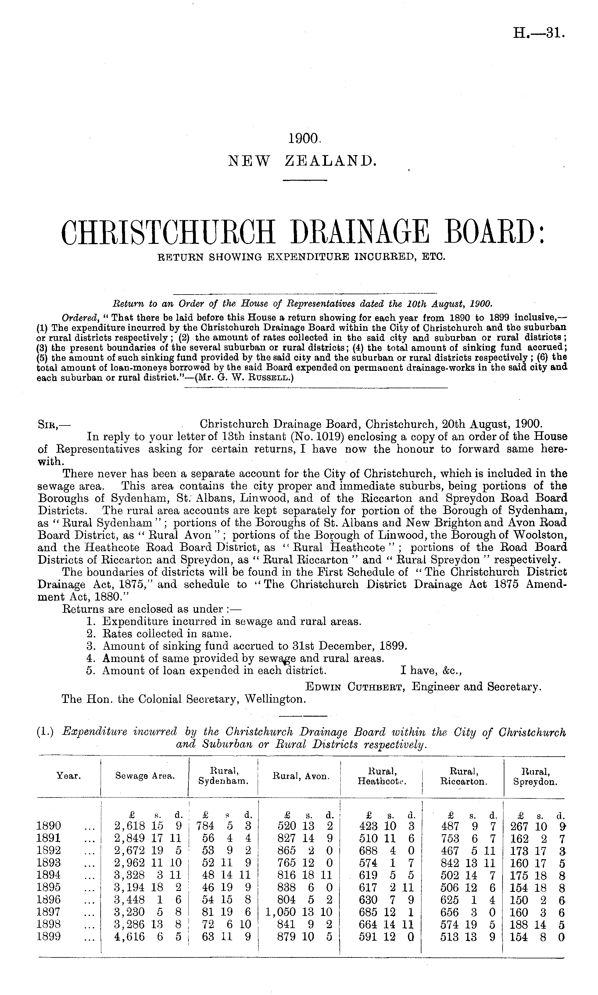 Sik, — Christchurch Drainage Board, Christchurch, 20th August, 1900. In reply to your letter of 13th instant (No. 1019) enclosing a copy of an order of the House of Bepresentatives asking for certain returns, I have now the honour to forward same herewith. There never has been a separate account for the City of Christchurch, which is included in the sewage area. This area contains the city proper and immediate suburbs, being portions of the Boroughs of Sydenham, St. Albans, Linwood, and of the Biccarton and Spreydon Boad Board Districts. The rural area accounts are kept separately for portion of the Borough of Sydenham, as " Bural Sydenham " ; portions of the Boroughs of St. Albans and New Brighton and Avon Boad Board District, as " Bural Avon " ; portions of the Borough of Linwood, the Borough of Woolston, and the Heathcote Boad Board District, as "Bural Heathcote"; portions of the Boad Board Districts of Biccarton and Spreydon, as " Bural Biccarton " and " Bural Spreydon " respectively. The boundaries of districts will be found in the First Schedule of "The Christchurch District Drainage Act, 1875," and schedule to " The Christchurch District Drainage Act 1875 Amendment Act, 1880." Beturns are enclosed as under :— 1. Expenditure incurred in sewage and rural areas. 2. Bates collected in same. 3. Amount of sinking fund accrued to 31st December, 1899. 4. Amount of same provided by sewage and rural areas. 5. Amount of loan expended in each district. I have, &c, Edwin Cuthbeet, Engineer and Secretary. The Hon. the Colonial Secretary, Wellington.