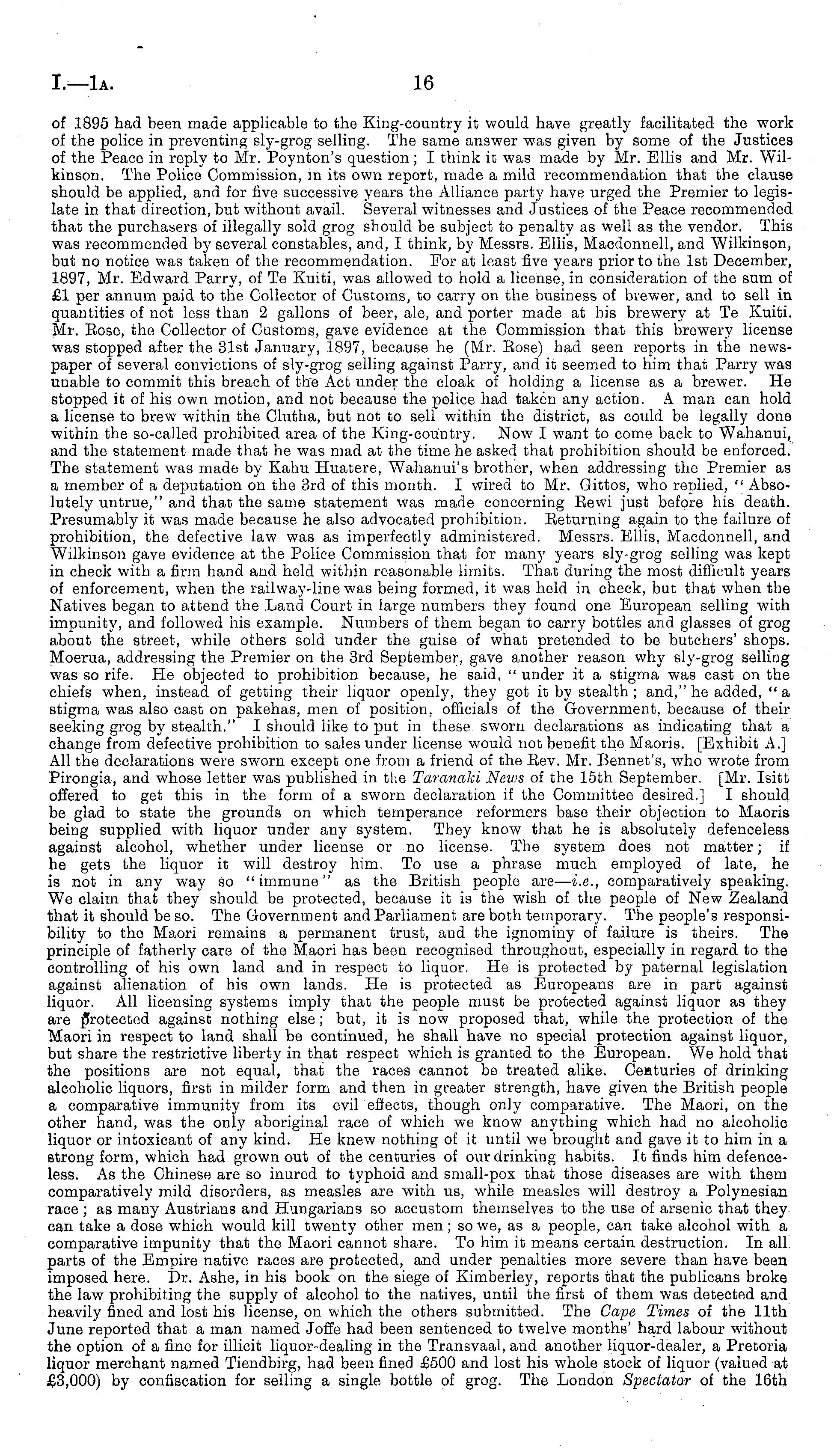 of 1895 had been made applicable to the King-country it would have greatly facilitated the work of the police in preventing sly-grog selling. The same answer was given by some of the Justices of the Peace in reply to Mr. Poynton's question; I think it was made by Mr. Ellis and Mr. Wilkinson. The Police Commission, in its own report, made a mild recommendation that the clause should be applied, and for five successive years the Alliance party have urged the Premier to legislate in that direction, but without avail. Several witnesses and Justices of the Peace recommended that the purchasers of illegally sold grog should be subject to penalty as well as the vendor. This was recommended by several constables, and, I think, by Messrs. Ellis, Macdonnell, and Wilkinson, but no notice was taken of the recommendation. For at least five years prior to the Ist December, 1897, Mr. Edward Parry, of Te Kuiti, was allowed to hold a license, in consideration of the sum of £1 per annum paid to the Collector of Customs, to carry on the business of brewer, and to sell in quantities of not less than 2 gallons of beer, ale, and porter made at his brewery at Te Kuiti. Mr. Eose, the Collector of Customs, gave evidence at the Commission that this brewery license was stopped after the 31st January, 1897, because he (Mr. Eose) had seen reports in the newspaper of several convictions of sly-grog selling against Parry, and it seemed to him that Parry was unable to commit this breach of the Act under the cloak of holding a license as a brewer. He stopped it of his own motion, and not because the police had taken any action. A man can hold a license to brew within the Clutha, but not to sell within the district, as could be legally done within the so-called prohibited area of the King-country. Now I want to come back to Wahanui, and the statement made that he was mad at the time he asked that prohibition should be enforced. The statement was made by Kahu Huatere, Wahanui's brother, when addressing the Premier as a member of a deputation on the 3rd of this month. I wired to Mr. Gittos, who replied, " Absolutely untrue," and that the same statement was made concerning Eewi just before his death. Presumably it was made because he also advocated prohibition. Eeturning again to the failure of prohibition, the defective law was as imperfectly administered. Messrs. Ellis, Macdonnell, and Wilkinson gave evidence at the Police Commission that for many years sly-grog selling was kept in check with a firm hand and held within reasonable limits. That during the most difficult years of enforcement, when the railway-line was being formed, it was held in check, but that when the Natives began to attend the Land Court in large numbers they found one European selling with impunity, and followed his example. Numbers of them began to carry bottles and glasses of grog about the street, while others sold under the guise of what pretended to be butchers' shops. Moerua, addressing the Premier on the 3rd September, gave another reason why sly-grog selling was so rife. He objected to prohibition because, he said, " under it a stigma was cast on the chiefs when, instead of getting their liquor openly, they got it by stealth ; and," he added, " a stigma was also cast on pakehas, men of position, officials of the Government, because of their seeking grog by stealth." 1 should like to put in these sworn declarations as indicating that a change from defective prohibition to sales under license would not benefit the Maoris. [Exhibit A.] All the declarations were sworn except one from a friend of the Eev. Mr. Bennet's, who wrote from Pirongia, and whose letter was published in the Taranaki News of the 15th September. [Mr. Isitt offered to get this in the form of a sworn declaration if the Committee desired.] I should be glad to state the grounds on which temperance reformers base their objection to Maoris being supplied with liquor under any system. They know that he is absolutely defenceless against alcohol, whether under license or no license. The system does not matter; if he gets the liquor it will destroy him. To use a phrase much employed of late, he is not in any way so "immune" as the British people are— i.e., comparatively speaking. We claim that they should be protected, because it is the wish of the people of New Zealand that it should be so. The Government and Parliament are both temporary. The people's responsibility to the Maori remains a permanent trust, and the ignominy of failure is theirs. The principle of fatherly care of the Maori has been recognised throughout, especially in regard to the controlling of his own land and in respect to liquor. He is protected by paternal legislation against alienation of his own lands. He is protected as Europeans are in part against liquor. All licensing systems imply that the people must be protected against liquor as they are protected against nothing else; but, it is now proposed that, while the protection of the Maori in respect to land shall be continued, he shall have no special protection against liquor, but share the restrictive liberty in that respect which is granted to the European. We hold that the positions are not equal, that the races cannot be treated alike. Ceuturies of drinking alcoholic liquors, first in milder form and then in greater strength, have given the British people a comparative immunity from its evil effects, though only comparative. The Maori, on the other hand, was the only aboriginal race of which we know anything which had no alcoholic liquor or intoxicant of any kind. He knew nothing of it until we brought and gave it to him in a strong form, which had grown out of the centuries of our drinking habits. It finds him defenceless. As the Chinese are so inured to typhoid and small-pox that those diseases are with them comparatively mild disorders, as measles are with us, while measles will destroy a Polynesian race ; as many Austrians and Hungarians so accustom 