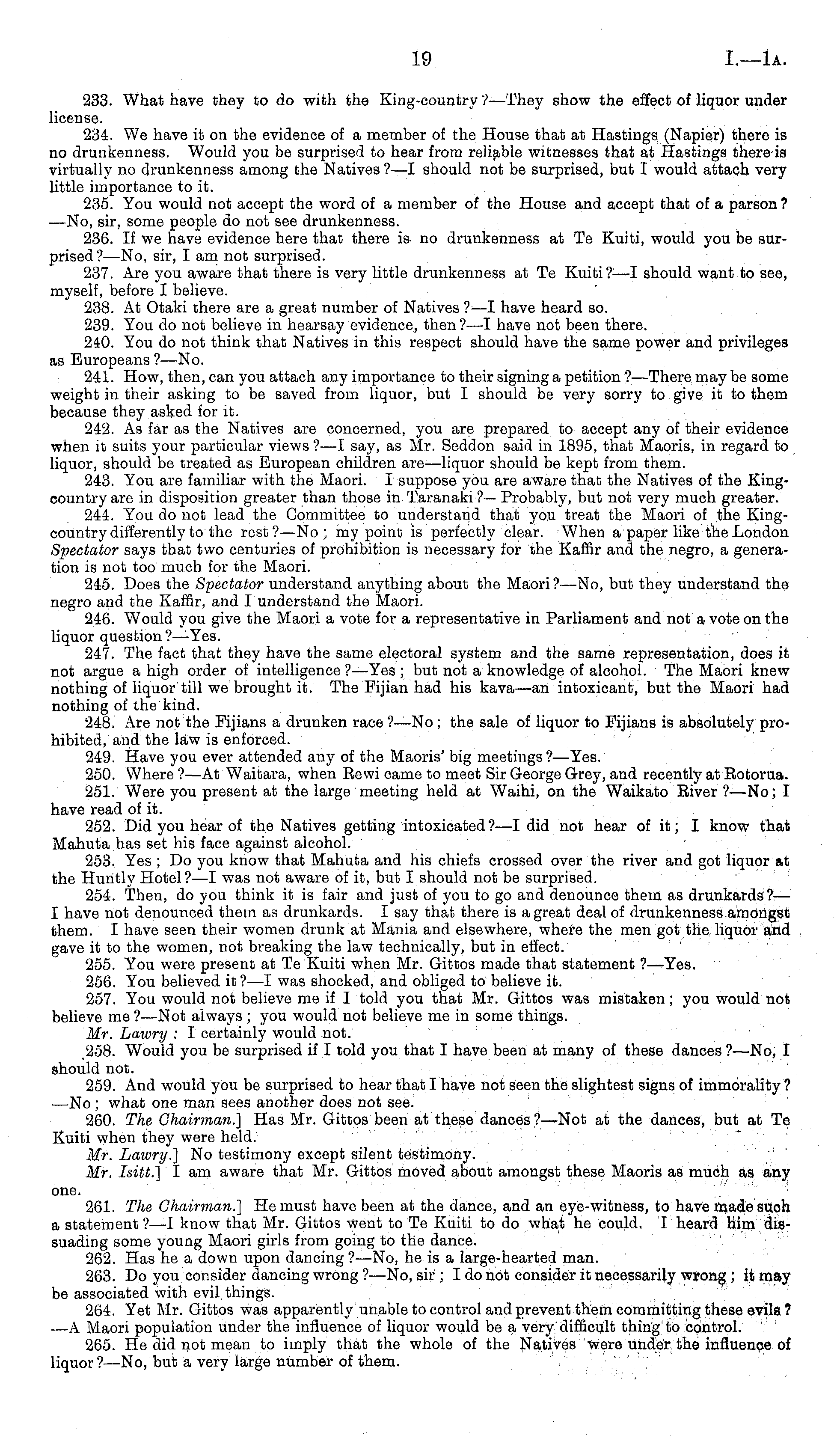 233. What have they to do with the King-country ?—They show the effect of liquor under license. 234. We have it on the evidence of a member of the House that at Hastings (Napier) there is no drunkenness. Would you be surprised to hear from reliable witnesses that at Hastings there is virtually no drunkenness among the Natives ?—I should not be surprised, but I would attach very little importance to it. 235. You would not accept the word of a member of the House and accept that of a parson ? —-No, sir, some people do not see drunkenness. 236. If we have evidence here that there is no drunkenness at Te Kuiti, would you be surprised ? —No, sir, I am not surprised. 237. Are you aware that there is very little drunkenness at Te Kuiti?—l should want to see, myself, before I believe. 238. At Otaki there are a great number of Natives ?■ —I have heard so. 239. You do not believe in hearsay evidence, then?—l have not been there. 240. You do not think that Natives in this respect should have the same power and privileges as Europeans ?—No. 241. How, then, can you attach any importance to their signing a petition ? —There may be some weight in their asking to be saved from liquor, but I should be very sorry to give it to them because they asked for it. 242. As far as the Natives are concerned, you are prepared to accept any of their evidence when it suits your particular views ?—I say, as Mr. Seddon said in 1895, that Maoris, in regard to liquor, should be treated as European children are—liquor should be kept from them. 243. You are familiar with the Maori. I suppose you are aware that the Natives of the Kingcountry are in disposition greater than those in Taranaki ?— Probably, but not very much greater. 244. You do not lead the Committee to understand that you treat the Maori of the Kingcountry differently to the rest?—No; my point is perfectly clear. When a paper like the London Spectator says that two centuries of prohibition is necessary for the Kaffir and the negro, a generation is not too much for the Maori. 245. Does the Spectator understand anything about the Maori ?—No, but they understand the negro and the Kaffir, and I understand the Maori. 246. Would you give the Maori a vote for a representative in Parliament and not a vote on the liquor question?— Yes. 247. The fact that they have the same electoral system and the same representation, does it not argue a high order of intelligence ?—Yes ; but not a knowledge of alcohol. The Maori knew nothing of liquor till we brought it. The Fijian had his kava—an intoxicant, but the Maori had nothing of the kind. 248. Are not the Fijians a drunken race ?—No ; the sale of liquor to Fijians is absolutely prohibited, and the law is enforced. 249. Have you ever attended any of the Maoris' big meetings?— Yes. 250. Where ?—At Waitara, when Rewi came to meet Sir George Grey, and recently at Botorua. 251. Were you present at the large meeting held at Waihi, on the Waikato River ?—No; I have read of it. 252. Did you hear of the Natives getting intoxicated?—l did not hear of it; I know that Mahuta has set his face against alcohol. 253. Yes ; Do you know that Mahuta and his chiefs crossed over the river and got liquor at the Huntly Hotel ?—I was not aware of it, but I should not be surprised. 254. Then, do you think it is fair and just of you to go and denounce them as drunkards?— I have not denounced them as drunkards. I say that there is a great deal of drunkenness amongst them. I have seen their women drunk at Mania and elsewhere, where the men got the liquor and gave it to the women, not breaking the law technically, but in effect. 255. You were present at Te Kuiti when Mr. Gittos made that statement ?—Yes. 256. You believed it ?—I was shocked, and obliged to believe it. 257. You would not believe me if I told you that Mr. Gittos was mistaken; you would not believe me ?—Not always ; you would not believe me in some things. Mr. Lawry : I certainly would not. ,258. Would you be surprised if I told you that I have been at many of these dances ?—No, I should not. 259. And would you be surprised to hear that I have not seen the slightest signs of immorality ? —No; what one man sees another does not see. 260. The Chairman.] Has Mr. Gittos been at these dances?— Not at the dances, but at Te Kuiti when they were held. Mr. Lawry.] No testimony except silent testimony. Mr. Isitt.] I am aware that Mr. Gittos moved about amongst these Maoris as much as any one. 261. The Chairman.] He must have been at the dance, and an eye-witness, to have made such a statement?—l know that Mr. Gittos went to Te Kuiti to do what he could. I heard him dissuading some young Maori girls from going to the dance. 262. Has he a down upon dancing?—No, he is a large-hearted man. 263. Do you consider dancing wrong ?—No, sir ;I do not consider it necessarily wrong ;it may be associated with evil things. 264. Yet Mr. Gittos was apparently unable to control and prevent them committing these evils ? —A Maori population under the influence of liquor would be a very difficult thing to control. 265. He did not mean to imply that the whole of the Natives were under the influence of liquor? —No, but a very large number of them.