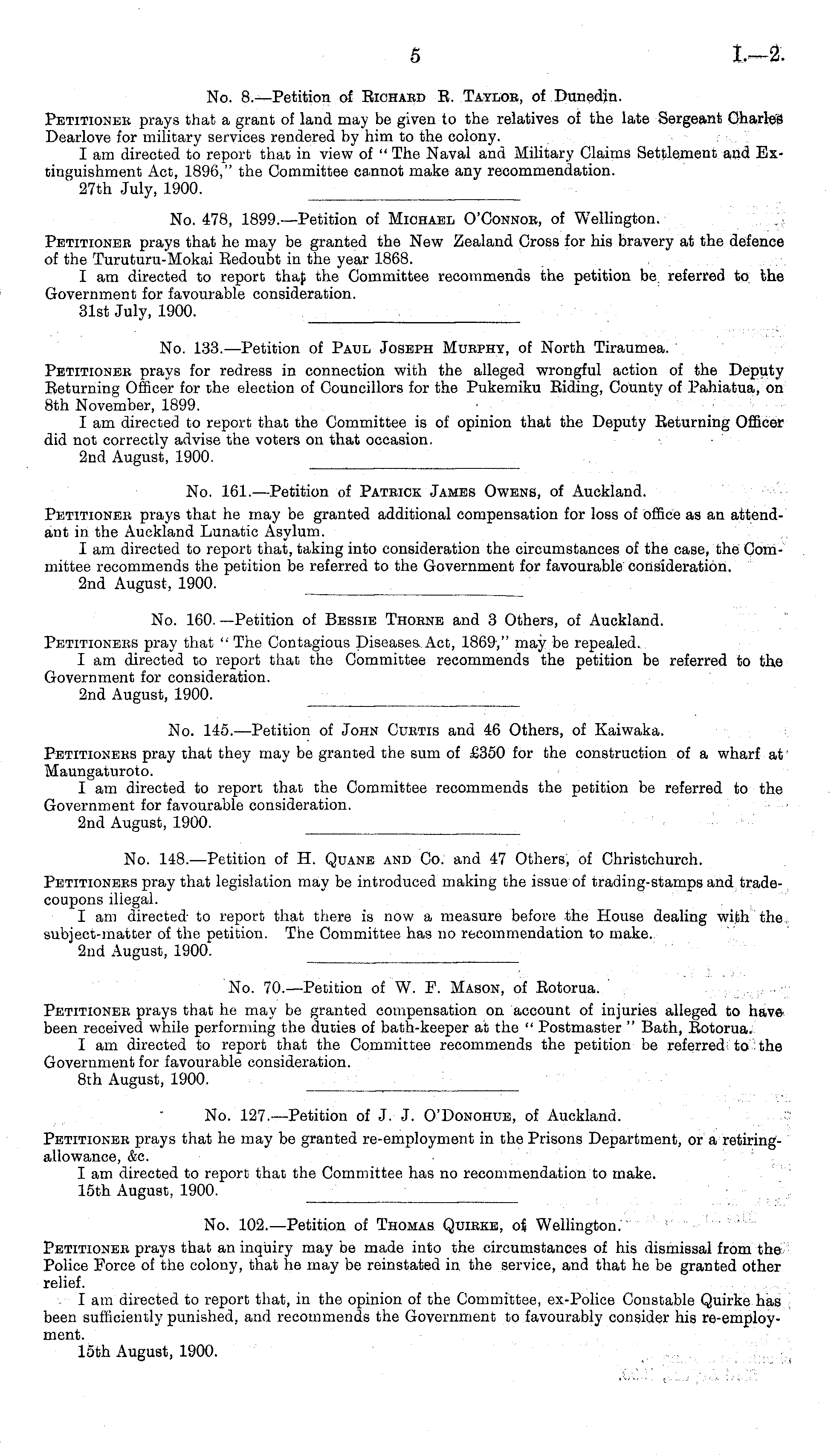 No. 161.—Petition of Patrick James Owens, of Auckland. Petitioner prays that he may be granted additional compensation for loss of office as an attendant in the Auckland Lunatic Asylum. I am directed to report that, taking into consideration the circumstances of the case, the Committee recommends the petition be referred to the Government for favourable consideration. 2nd August, 1900.