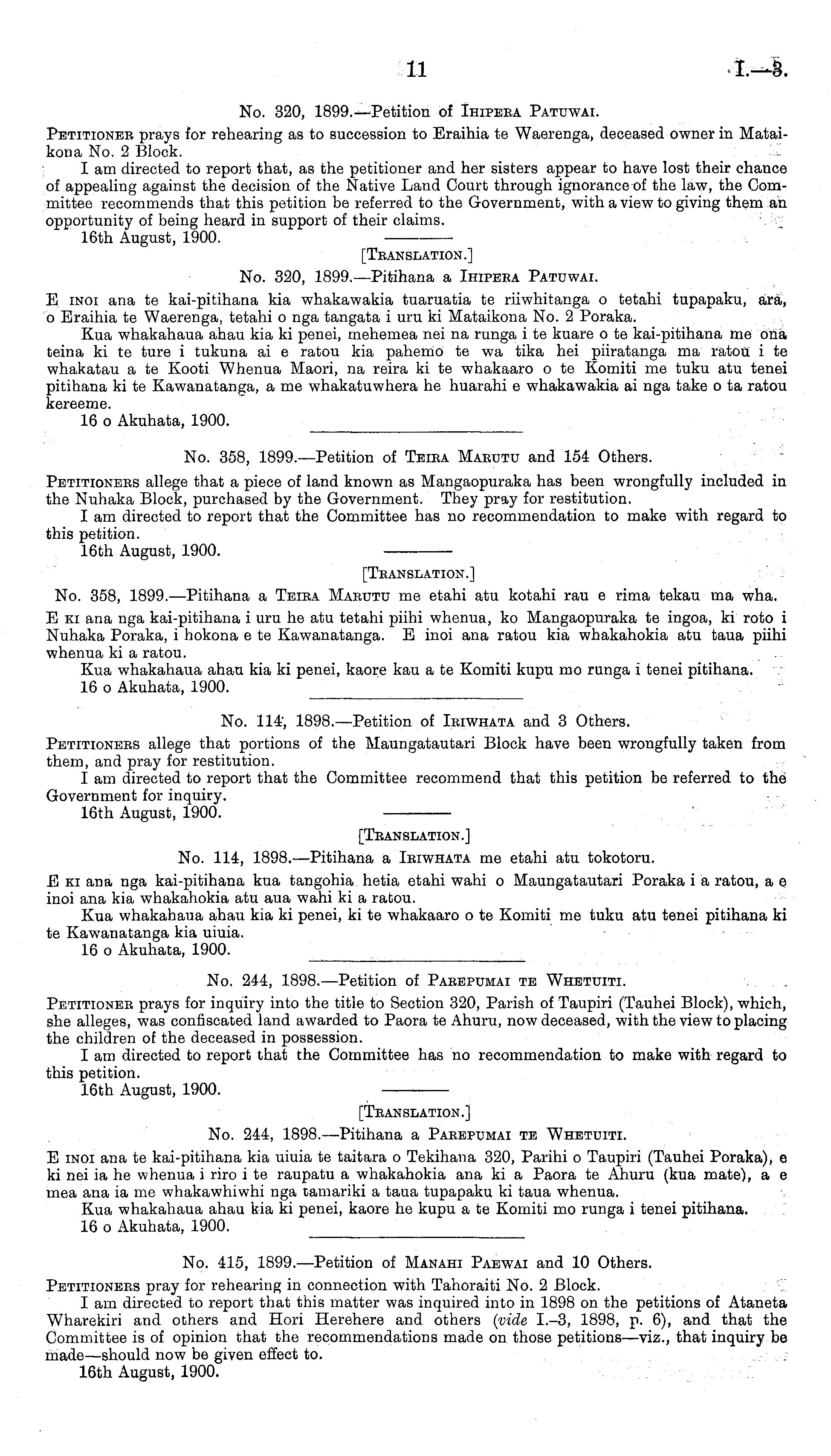 [Teanslation.] No. 358, 1899.—Pitihana a Teiea Maeutu me etahi atu kotahi rave rima tekau ma wha. E ki ana nga kai-pitihana i uru he atu tetahi piihi whenua, ko Mangaopuraka te ingoa, ki roto i Nuhaka Poraka, i hokona etc Kawanatanga. E inoi ana ratou kia whakahokia atu taua piihi whenua ki a ratou. Kua whakahaua ahau kia ki penei, kaore kau a te Komiti kupu mo runga i tenei pitihana. 16 o Akuhata, 1900.