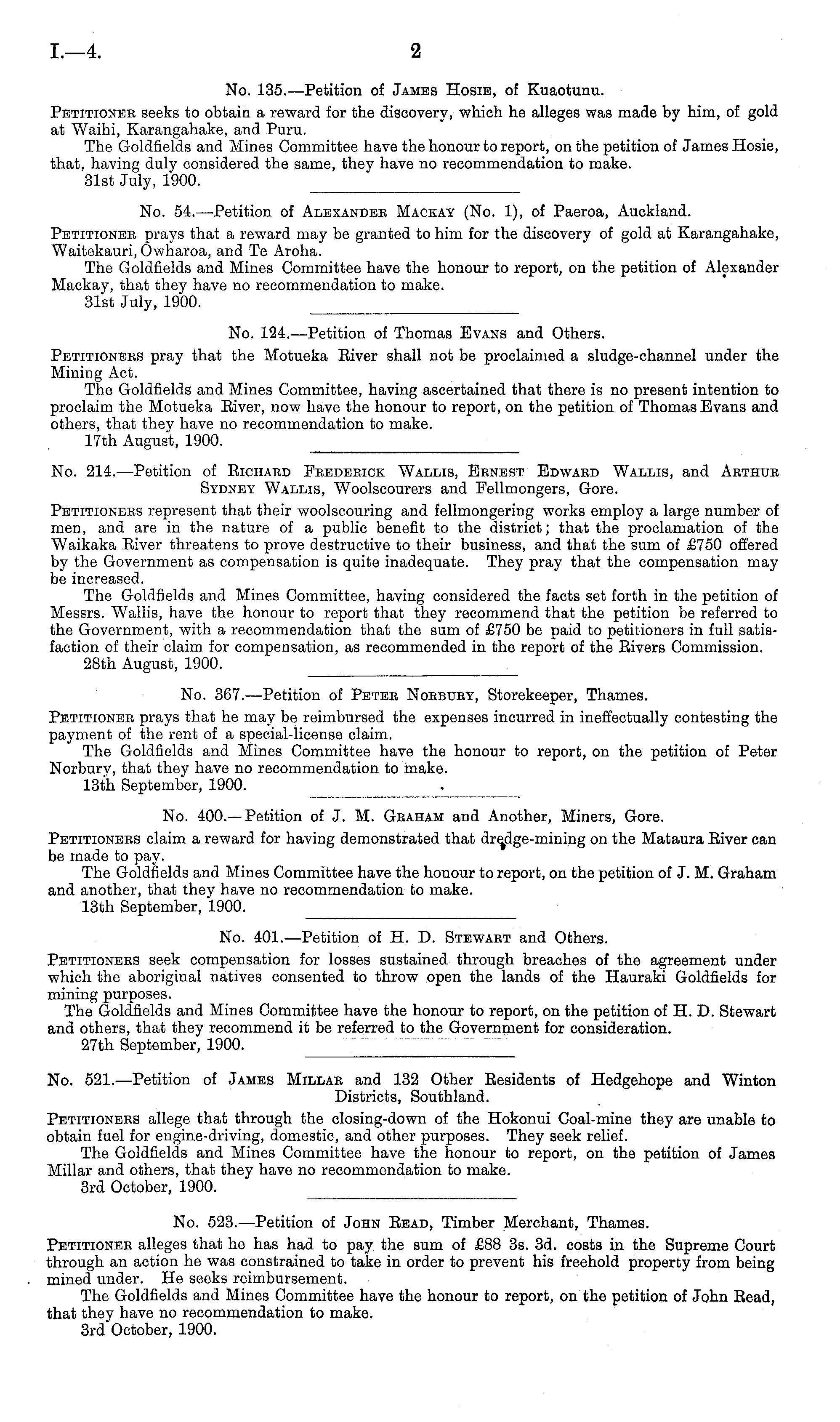 No. 54.—Petition of Alexander Mackay (No. 1), of Paeroa, Auckland. Petitioner prays that a reward may be granted to him for the discovery of gold at Karangahake, Waitekauri, Owharoa, and Te Aroha. The Goldfields and Mines Committee have the honour to report, on the petition of Alexander Mackay, that they have no recommendation to make. 31st July, 1900.
