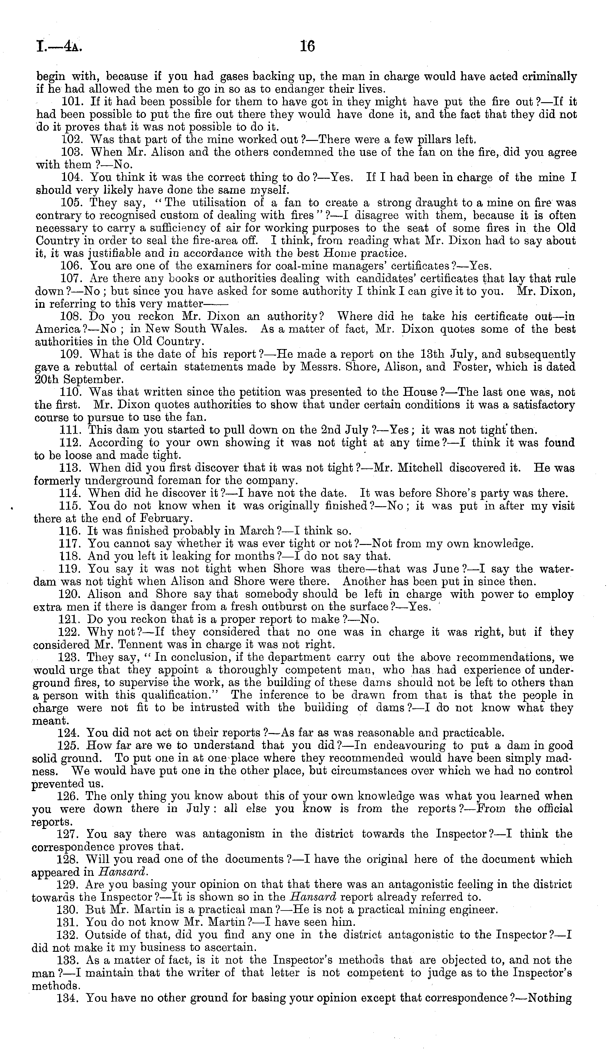 begin with, because if you had gases backing up, the man in charge would have acted criminally if he had allowed the men to go in so as to endanger their lives. 101. If it had been possible for them to have got in they might have put the fire out ? —lf it had been possible to put the fire out there they would have done it, and the fact that they did not do it proves that it was not possible to do it. 102. Was that part of the mine worked out ?—There were a few pillars left. 103. When Mr. Alison and the others condemned the use of the fan on the fire, did you agree with them ?■—No. 104. You think it was the correct thing to do ?—Yes. If I had been in charge of the mine I should very likely have done the same myself. 105. They say, " The utilisation of a fan to create a strong draught to a mine on fire was contrary to recognised custom of dealing with fires"?—l disagree with them, because it is often necessary to carry a sufficiency of air for working purposes to the seat of some fires in the Old Country in order to seal the fire-area off. I think, from reading what Mr. Dixon had to say about it, it was justifiable and in accordance with the best Home practice. 106. You are one of the examiners for coal-mine managers' certificates ? —Yes. 107. Are there any books or authorities dealing with candidates' certificates that lay that rule down?—No ; but since you have asked for some authority I think I can give it to you. Mr. Dixon, in referring to this very matter 108. Do you reckon Mr. Dixon an authority? Where did he take his certificate out—in America? —No ; in New South Wales. As a matter of fact, Mr. Dixon quotes some of the best authorities in the Old Country. 109. What is the date of his report?—He made a report on the 13th July, and subsequently gave a rebuttal of certain statements made by Messrs. Shore, Alison, and Foster, which is dated 20th September. 110. Was that written since the petition was presented to the House ? —The last one was, not the first. Mr. Dixon quotes authorities to show that under certain conditions it was a satisfactory course to pursue to use the fan. 111. This dam you started to pull down on the 2nd July ?—Yes; it was not tight'then. 112. According to your own showing it was not tight at any time? —I think it was found to be loose and made tight. 113. When did you first discover that it was not tight ? —Mr. Mitchell discovered it. He was formerly underground foreman for the company. 114. When did he discover it ?—I have not the date. It was before Shore's party was there. 115. You do not know when it was originally finished ?—No; it was put in after my visit there at the end of February. 116. It was finished probably in March? —I think so. 117. You cannot say whether it was ever tight or not? —Not from my own knowledge. 118. And you left it leaking for months ? —I do not say that. 119. You say it was not tight when Shore was there—that was June ?—I say the waterdam was not tight when Alison and Shore were there. Another has been put in since then. 120. Alison and Shore say that somebody should be left in charge with power to employ extra men if there is danger from a fresh outburst on the surface ?—Yes. 121. Do you reckon that is a proper report to make ?—No. 122. Why not ?—lf they considered that no one was in charge it was right, but if they considered Mr. Tennent was in charge it was not right. 123. They say, " In conclusion, if the department carry out the above recommendations, we would urge that they appoint a thoroughly competent man, who has had experience of underground fires, to supervise the work, as the building of these dams should not be left to others than a person with this qualification." The inference to be drawn from that is that the people in charge were not fit to be intrusted with the building of dams ?—I do not know what they meant. 124. You did not act on their reports ?—As far as was reasonable and practicable. 125. How far are we to understand that you did?—ln endeavouring to put a dam in good solid ground. To put one in at one place where they recommended would have been simply madness. We would have put one in the other place, but circumstances over which we had no control prevented us. 126. The only thing you know about this of your own knowledge was what you learned when you were down there in July : all else you know is from the reports ? —From the official reports. 127. You say there was antagonism in the district towards the Inspector? —I think the correspondence proves that. 128. Will you read one of the documents ? —I have the original here of the document which appeared in Hansard. 129. Are you basing your opinion on that that there was an antagonistic feeling in the district towards the Inspector? —It is shown so in the Hansard report already referred to. 130. But Mr. Martin is a practical man ? —He is not a practical mining engineer. 131. You do not know Mr. Martin? —I have seen him. 132. Outside of that, did you find any one in the district antagonistic to the Inspector?—l did not make it my business to ascertain. 133. As a matter of fact, is it not the Inspector's methods that are objected to, and not the man ? —I maintain that the writer of that letter is not competent to judge as to the Inspector's methods. 134. You have no other ground for basing your opinion except that correspondence ?—Nothing