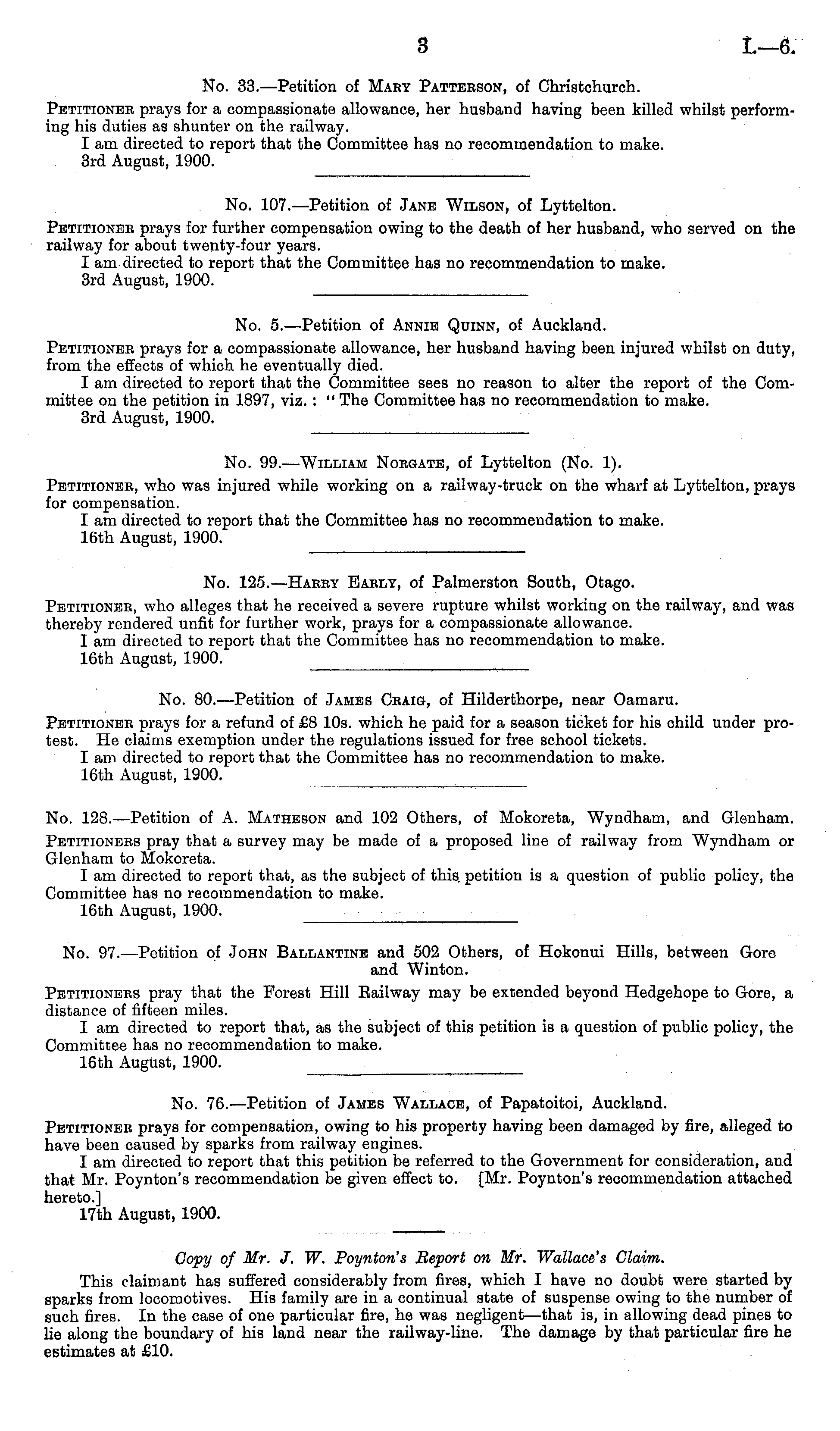 No. 76. —Petition of James Wallace, of Papatoitoi, Auckland. Petitionee prays for compensation, owing to his property having been damaged by fire, alleged to have been caused by sparks from railway engines. I am directed to report that this petition be referred to the Government for consideration, and that Mr. Poynton's recommendation be given effect to. [Mr. Poynton's recommendation attached hereto.] 17th August, 1900.