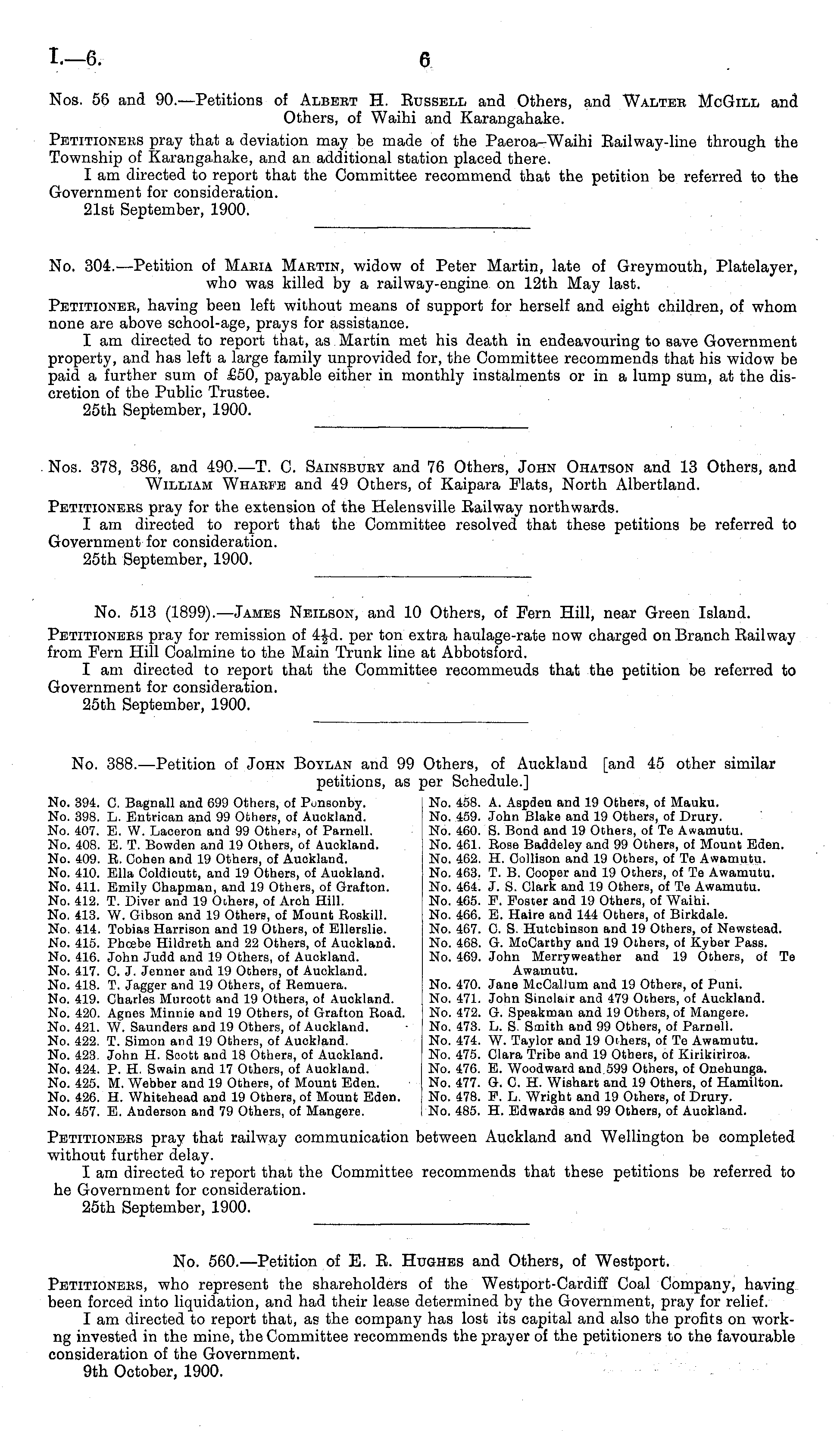 No. 560.—Petition of E. E. Hughes and Others, of Westport. Petitionees, who represent the shareholders of the Westport-Cardiff Coal Company, having been forced into liquidation, and had their lease determined by the Government, pray for relief. I am directed to report that, as the company has lost its capital and also the profits on workng invested in the mine, the Committee recommends the prayer of the petitioners to the favourable consideration of the Government. 9th October, 1900.