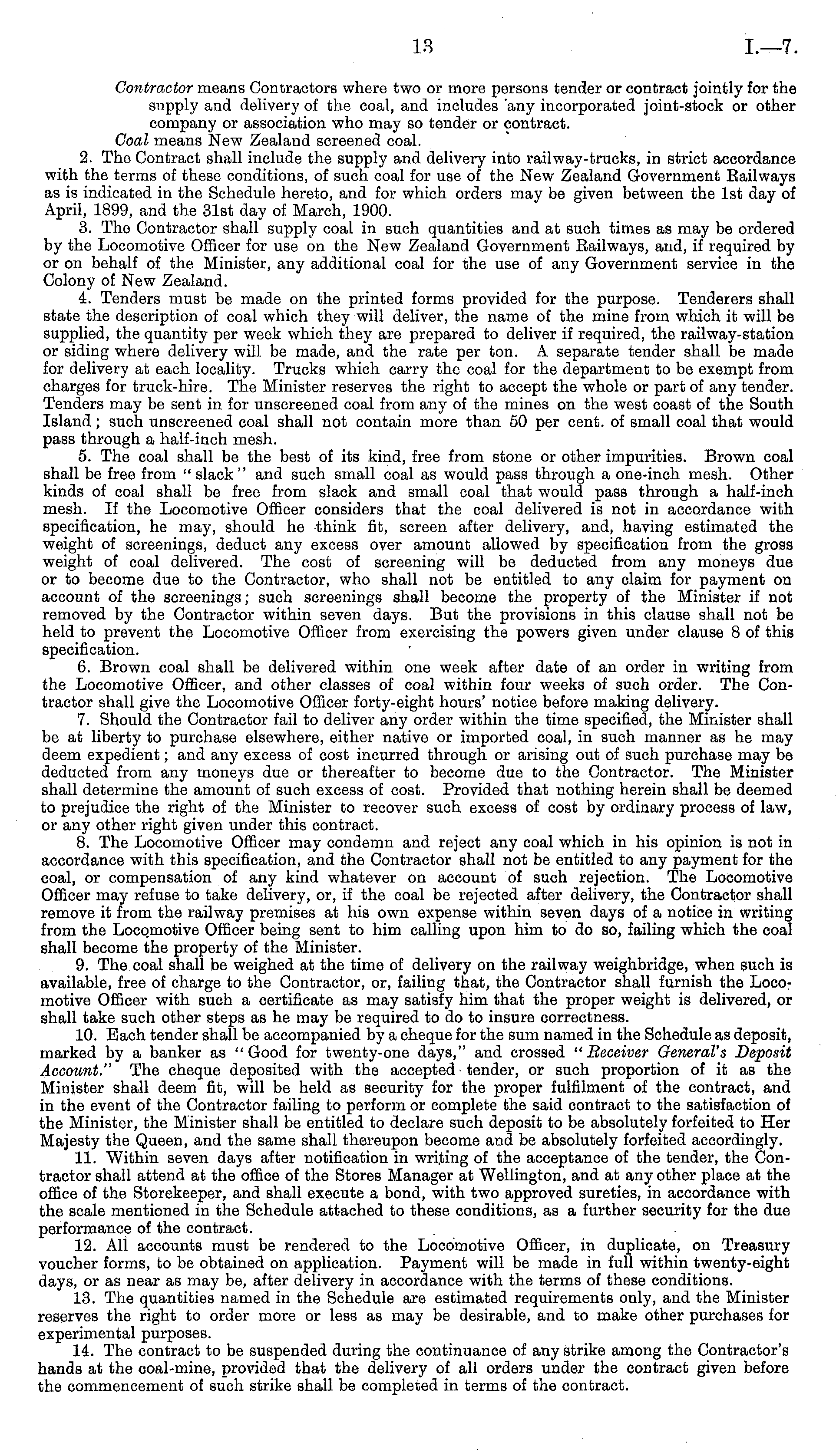 Contractor means Contractors where two or more persons tender or contract jointly for the supply and delivery of the coal, and includes 'any incorporated joint-stock or other company or association who may so tender or contract. Coal means New Zealand screened coal. 2. The Contract shall include the supply and delivery into railway-trucks, in strict accordance with the terms of these conditions, of such coal for use of the New Zealand Government Eailways as is indicated in the Schedule hereto, and for which orders may be given between the Ist day of April, 1899, and the 31st day of March, 1900. 3. The Contractor shall supply coal in such quantities and at such times as may be ordered by the Locomotive Officer for use on the New Zealand Government Eailways, and, if required by or on behalf of the Minister, any additional coal for the use of any Government service in the Colony of New Zealand. 4. Tenders must be made on the printed forms provided for the purpose. Tenderers shall state the description of coal which they will deliver, the name of the mine from which it will be supplied, the quantity per week which they are prepared to deliver if required, the railway-station or siding where delivery will be made, and the rate per ton. A separate tender shall be made for delivery at each locality. Trucks which carry the coal for the department to be exempt from charges for truck-hire. The Minister reserves the right to accept the whole or part of any tender. Tenders may be sent in for unscreened coal from any of the mines on the west coast of the South Island; such unscreened coal shall not contain more than 50 per cent, of small coal that would pass through a half-inch mesh. 5. The coal shall be the best of its kind, free from stone or other impurities. Brown coal shall be free from " slack" and such small coal as would pass through a one-inch mesh. Other kinds of coal shall be free from slack and small coal that would pass through a half-inch mesh. If the Locomotive Officer considers that the coal delivered is not in accordance with specification, he may, should he think fit, screen after delivery, and, having estimated the weight of screenings, deduct any excess over amount allowed by specification from the gross weight of coal delivered. The cost of screening will be deducted from any moneys due or to become due to the Contractor, who shall not be entitled to any claim for payment on account of the screenings; such screenings shall become the property of the Minister if not removed by the Contractor within seven days. But the provisions in this clause shall not be held to prevent the Locomotive Officer from exercising the powers given under clause 8 of this specification. 6. Brown coal shall be delivered within one week after date of an order in writing from the Locomotive Officer, and other classes of coal within four weeks of such order. The Contractor shall give the Locomotive Officer forty-eight hours' notice before making delivery. 7. Should the Contractor fail to deliver any order within the time specified, the Minister shall be at liberty to purchase elsewhere, either native or imported coal, in such manner as he may deem expedient; and any excess of cost incurred through or arising out of such purchase may be deducted from any moneys due or thereafter to become due to the Contractor. The Minister shall determine the amount of such excess of cost. Provided that nothing herein shall be deemed to prejudice the right of the Minister to recover such excess of cost by ordinary process of law, or any other right given under this contract. 8. The Locomotive Officer may condemn and reject any coal which in his opinion is not in accordance with this specification, and the Contractor shall not be entitled to any payment for the coal, or compensation of any kind whatever on account of such rejection. The Locomotive Officer may refuse to take delivery, or, if the coal be rejected after delivery, the Contractor shall remove it from the railway premises at his own expense within seven days of a notice in writing from the Locomotive Officer being sent to him calling upon him to do so, failing which the coal shall become the property of the Minister. 9. The coal shall be weighed at the time of delivery on the railway weighbridge, when such is available, free of charge to the Contractor, or, failing that, the Contractor shall furnish the Locomotive Officer with such a certificate as may satisfy him that the proper weight is delivered, or shall take such other steps as he may be required to do to insure correctness. 10. Each tender shall be accompanied by a cheque for the sum named in the Schedule as deposit, marked by a banker as "Good for twenty-one days," and crossed "Receiver General's Deposit Account." The cheque deposited with the accepted tender, or such proportion of it as the Minister shall deem fit, will be held as security for the proper fulfilment of the contract, and in the event of the Contractor failing to perform or complete the said contract to the satisfaction of the Minister, the Minister shall be entitled to declare such deposit to be absolutely forfeited to Her Majesty the Queen, and the same shall thereupon become and be absolutely forfeited accordingly. 11. Within seven days after notification in writing of the acceptance of the tender, the Contractor shall attend at the office of the Stores Manager at Wellington, and at any other place at the office of the Storekeeper, and shall execute a bond, with two approved sureties, in accordance with the scale mentioned in the Schedule attached to these conditions, as a further security for the due performance of the contract. 12. All accounts must be rendered to the Locomotive Officer, in duplicate, on Treasury voucher forms, to be obtained on application. Payment will be made in full within twenty-eight days, or as near as may be, after delivery in accordance with the terms of these conditions. 13. The quantities named in the Schedul