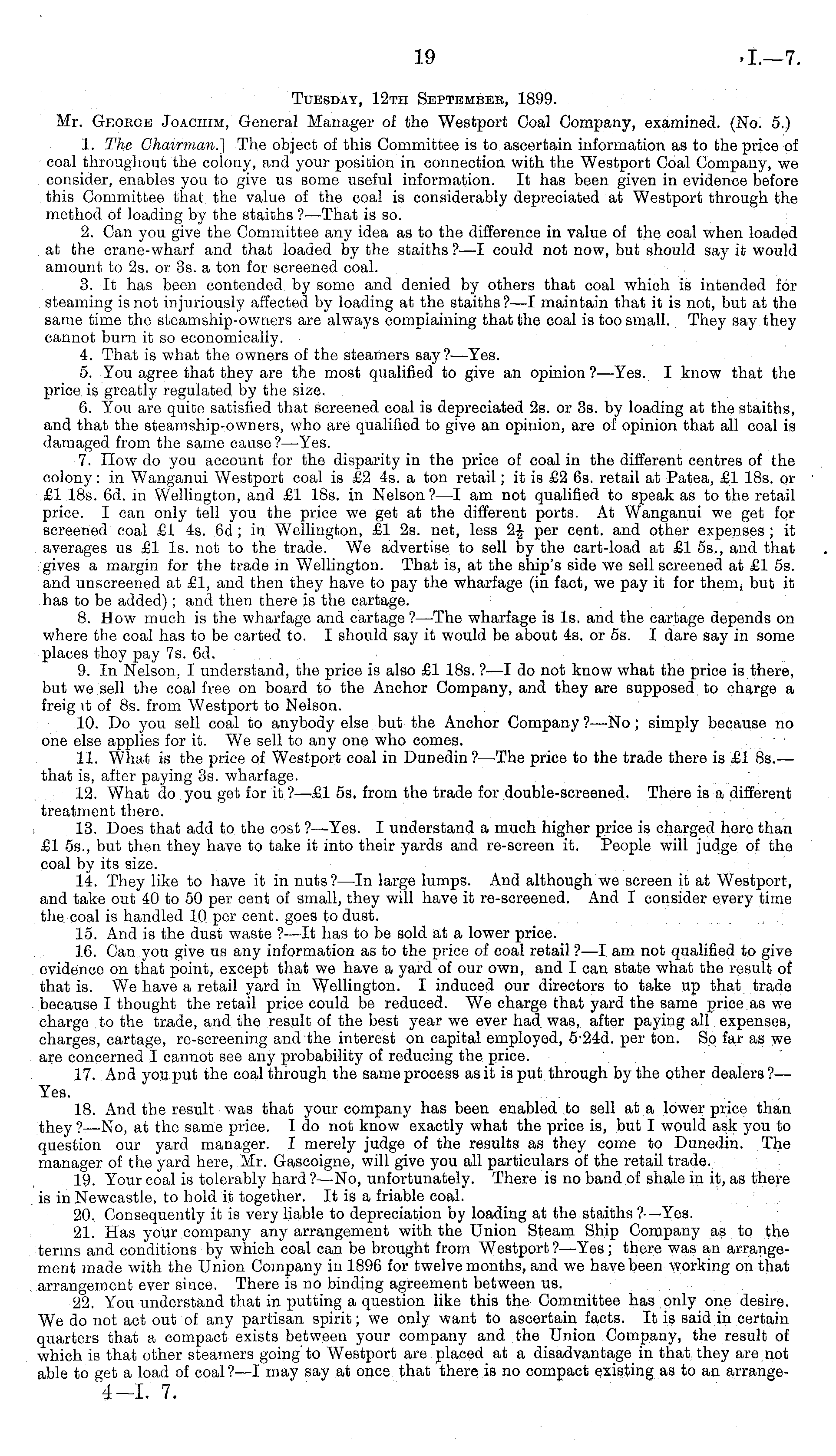 Tuesday, 12th September, 1899. Mr. George Joachim, General Manager of the Westport Coal Company, examined. (No. 5.) 1. The Chairman.] The object of this Committee is to ascertain information as to the price of coal throughout the colony, and your position in connection with the Westport Coal Company, we consider, enables you to give us some useful information. It has been given in evidence before this Committee that the value of the coal is considerably depreciated at Westport through the method of loading by the staiths ?—That is so. 2. Can you give the Committee any idea as to the difference in value of the coal when loaded at the crane-wharf and that loaded by the staiths ?—I could not now, but should say it would amount to 2s. or 3s. a ton for screened coal. 3. It has been contended by some and denied by others that coal which is intended for steaming is not injuriously affected by loading at the staiths ?—I maintain that it is not, but at the same time the steamship-owners are always complaining that the coal is too small. They say they cannot burn it so economically. 4. That is what the owners of the steamers say?— Yes. 5. You agree that they are the most qualified to give an opinion ? —Yes. I know that the price, is greatly regulated by the size. 6. You are quite satisfied that screened coal is depreciated 2s. or 3s. by loading at the staiths, and that the steamship-owners, who are qualified to give an opinion, are of opinion that all coal is damaged from the same cause? —Yes. 7. How do you account for the disparity in the price of coal in the different centres of the colony: in Wanganui Westport coal is £2 4s. a ton retail; it is £2 6s. retail at Patea, £1 18s. or £1 18s. 6d. in Wellington, and £1 18s. in Nelson? —I am not qualified to speak as to the retail price. I can only tell you the price we get at the different ports. At Wanganui we get for screened coal £1 4s. 6d ; in Wellington, £l 2s. net, less 2-J- per cent, and other expenses ; it averages us £1 Is. net to the trade. We advertise to sell by the cart-load at £1 55., and that gives a margin for the trade in Wellington. That is, at the ship's side we sell screened at £1 ss. and unscreened at £1, and then they have to pay the wharfage (in fact, we pay it for them, but it has to be added); and then there is the cartage. 8. How much is the wharfage and cartage ? —The wharfage is Is. and the cartage depends on where the coal has to be carted to. I should say it would be about 4s. or ss. I dare say in some places they pay 7s. 6d. 9. In Nelson, I understand, the price is also £1 18s. ?—-I do not know what the price is there, but we sell the coal free on board to the Anchor Company, and they are supposed to charge a freig it of Bs. from Westport to Nelson. 10. Do you sell coal to anybody else but the Anchor Company ? —'No; simply because no one else applies for it. We sell to any one who comes. 11. What is the price of Westport coal in Dunedin?—The price to the trade there is £1 Bs.— that is, after paying 3s. wharfage. 12. What do you get for it ? —-£1 ss. from the trade for double-screened. There is a different treatment there. 13. Does that add to the cost ?—Yes. I understand a much higher price is charged here than £1 55., but then they have to take it into their yards and re-screen it. People will judge of the coal by its size. 14. They like to have it in nuts?—ln large lumps. And although we screen it at Westport, and take out 40 to 50 per cent of small, they will have it re-screened. And I consider every time the coal is handled 10 per cent, goes to dust. 15. And is the dust waste ?—lt has to be sold at a lower price. 16. Can you give us any information as to the price of coal retail ? —I am not qualified to give evidence on that point, except that we have a yard of our own, and I can state what the result of that is. We have a retail yard in Wellington. I induced our directors to take up that trade because I thought the retail price could be reduced. We charge that yard the same price as we charge to the trade, and the result of the best year we ever had was, after paying all expenses, charges, cartage, re-screening and the interest on capital employed, 5-24 d. per ton. So far as we are concerned I cannot see any probability of reducing the price. 17. And you put the coal through the same process as it is put through by the other dealers?— Yes. 18. And the result was that your company has been enabled to sell at a lower price than they ? —No, at the same price. Ido not know exactly what the price is, but I would ask you to question our yard manager. I merely judge of the results as they come to Dunedin. The manager of the yard here, Mr. Gascoigne, will give you all particulars of the retail trade. 19. Your coal is tolerably hard ? —No, unfortunately. There is no band of shale in it, as there is in Newcastle, to hold it together. It is a friable coal. 20. Consequently it is very liable to depreciation by loading at the staiths ?-—Yes. 21. Has your company any arrangement with the Union Steam Ship Company as to the terms and conditions by which coal can be brought from Westport ?—Yes; there was an arrangement made with the Union Company in 1896 for twelvemonths, and we have been working on that arrangement ever since. There is no binding agreement between us. 22. You understand that in putting a question like this the Committee has only one desire. We do not act out of any partisan spirit; we only want to ascertain facts. It is said in certain quarters that a compact exists between your company and the Union Company, the result of which is that other steamers going'to Westport are placed at a disadvantage in that, they are not able to get a load of coal?—I may say at once that there is no compact existing as to an arrange-