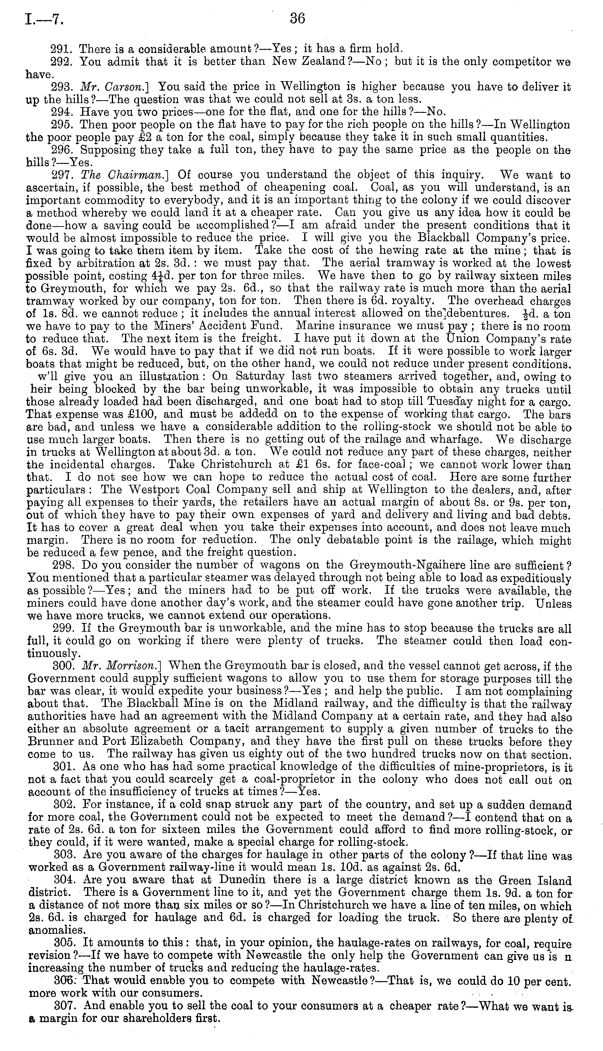 291. There is a considerable amount? —-Yes; it has a firm hold. 292. You admit that it is better than New Zealand?—No; but it is the only competitor we have. 293. Mr. Carson.] You said the price in Wellington is higher because you have to deliver it up the hills ? —The question was that we could not sell at 3s. a ton less. 294. Have you two prices—one for the flat, and one for the hills ?—No. 295. Then poor people on the flat have to pay for the rich people on the hills ?—ln Wellington the poor people pay £2 a ton for the coal, simply because they take it in such small quantities. 296. Supposing they take a full ton, they have to pay the same price as the people on the hills?— Yes. 297. The Chairman.] Of course you understand the object of this inquiry. We want to ascertain, if possible, the best method of cheapening coal. Coal, as you will understand, is an important commodity to everybody, and it is an important thing to the colony if we could discover a method whereby we could land it at a cheaper rate. Can you give us any idea how it could be done—how a saving could be accomplished ? —I am afraid under the present conditions that it would be almost impossible to reduce the price. I will give you the Blackball Company's price. I was going to take them item by item. Take the cost of the hewing rate at the mine; that is fixed by arbitration at 2s. 3d. :we must pay that. The aerial tramway is worked at the lowest possible point, costing 4fd. per ton for three miles. We have then to go by railway sixteen miles to Greymouth, for which we pay 2s. 6d., so that the railway rate is much more than the aerial tramway worked by our company, ton for ton. Then there is 6d. royalty. The overhead charges of Is. Bd. we cannot reduce ; it includes the annual interest allowed on the'debentures. -Jd. a ton we have to pay to the Miners' Accident Fund. Marine insurance we must pay ; there is no room to reduce that. The next item is the freight. I have put it down at the Union Company's rate of 6s. 3d. We would have to pay that if we did not run boats. If it were possible to work larger boats that might be reduced, but, on the other hand, we could not reduce under present conditions. w'll give you an illustration : On Saturday last two steamers arrived together, and, owing to heir being blocked by the bar being unworkable, it was impossible to obtain any trucks until those already loaded had been discharged, and one boat had to stop till Tuesday night for a cargo. That expense was £100, and must be addedd on to the expense of working that cargo. The bars are bad, and unless we have a considerable addition to the rolling-stock we should not be able to use much larger boats. Then there is no getting out of the railage and wharfage. We discharge in trucks at Wellington at about 3d. a ton. We could not reduce any part of these charges, neither the incidental charges. Take Christchurch at £1 6s. for face-coal; we cannot work lower than that. I do not see how we can hope to reduce the actual cost of coal. Here are some further particulars : The Westport Coal Company sell and ship at Wellington to the dealers, and, after paying all expenses to their yards, the retailers have an actual margin of about Bs. or 9s. per ton, out of which they have to pay their own expenses of yard and delivery and living and bad debts. It has to cover a great deal when you take their expenses into account, and does not leave much margin. There is no room for reduction. The only debatable point is the railage, which might be reduced a few pence, and the freight question. 298. Do you consider the number of wagons on the Greymouth-Ngaihere line are sufficient ? You mentioned that a particular steamer was delayed through not being able to load as expeditiously as possible ?—Yes; and the miners had to be put off work. If the trucks were available, the miners could have done another day's work, and the steamer could have gone another trip. Unless we have more trucks, we cannot extend our operations. 299. If the Greymouth bar is unworkable, and the mine has to stop because the trucks are all full, it could go on working if there were plenty of trucks. The steamer could then load continuously. 300. Mr. Morrison.] When the Greymouth bar is closed, and the vessel cannot get across, if the Government could supply sufficient wagons to allow you to use them for storage purposes till the bar was clear, it would expedite your business ? —Yes ; and help the public. lam not complaining about that. The Blackball Mine is on the Midland railway, and the difficulty is that the railway authorities have had an agreement with the Midland Company at a certain rate, and they had also either an absolute agreement or a tacit arrangement to supply a given number of trucks to the Brunner and Port Elizabeth Company, and they have the first pull on these trucks before they come to us. The railway has given us eighty out of the two hundred trucks now on that section. 301. As one who has had some practical knowledge of the difficulties of mine-proprietors, is it not a fact that you could scarcely get a coal-proprietor in the colony who does not call out on account of the insufficiency of trucks at times ?—Yes. 302. For instance, if a cold snap struck any part of the country, and set up a sudden demand for more coal, the Government could not be expected to meet the demand ?—I contend that on a rate of 2s. 6d. a ton for sixteen miles the Government could afford to find more rolling-stock, or they could, if it were wanted, make a special charge for rolling-stock. 303. Are you aware of the charges for haulage in other parts of the colony ?—lf that line was worked as a Government railway-line it would mean Is. lOd. as against 2s. 6d. 304. Are you aware that at Dunedin there is a large district known as the Green Island district. There is a Government line to it, and yet the Government charge them Is. 9d. a ton for a distance of not more thau s