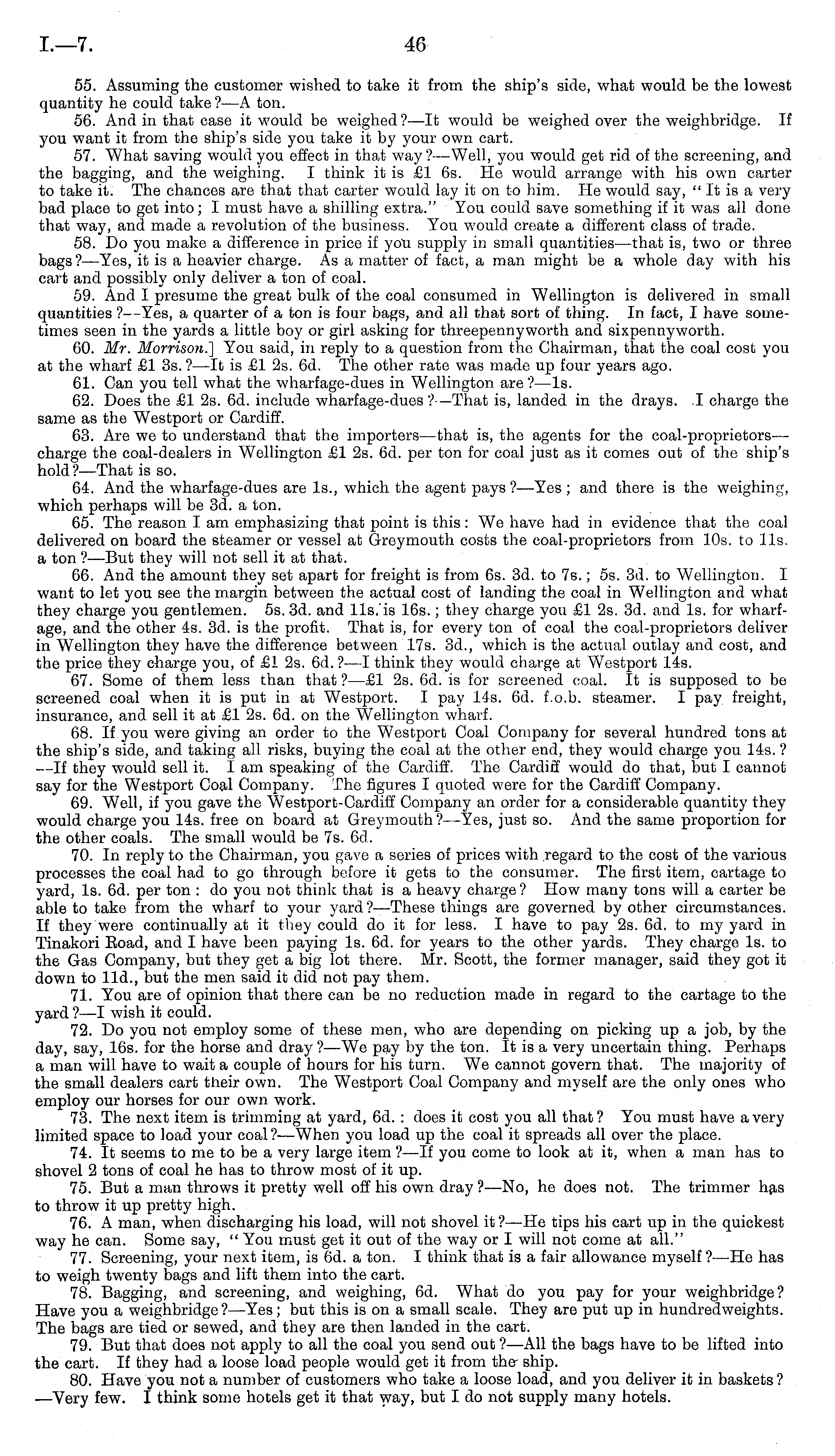 55. Assuming the customer wished to take it from the ship's side, what would be the lowest quantity he could take ? —A ton. 56. And in that case it would be weighed?—lt would be weighed over the weighbridge. If you want it from the ship's side you take it by your own cart. 57. What saving would you effect in that way?— Well, you would get rid of the screening, and the bagging, and the weighing. I think it is £1 6s. He would arrange with his own carter to take it. The chances are that that carter would lay it on to him. He would say, "Itis a very bad place to get into; I must have a shilling extra." You could save something if it was all done that way, and made a revolution of the business. You would create a different class of trade. 58. Do you make a difference in price if you supply in small quantities—that is, two or three bags?— Yes, it is a heavier charge. As a matter of fact, a man might be a whole day with his cart and possibly only deliver a ton of coal. 59. And I presume the great bulk of the coal consumed in Wellington is delivered in small quantities ?—Yes, a quarter of a ton is four bags, and all that sort of thing. In fact, I have sometimes seen in the yards a little boy or girl asking for threepenny worth and sixpennyworth. 60. Mr. Morrison.] You said, in reply to a question from the Chairman, that the coal cost you at the wharf £1 3s. ?—lt is £1 2s. 6d. The other rate was made up four years ago. 61. Can you tell what the wharfage-dues in Wellington are?—ls. 62. Does the £1 2s. 6d. include wharfage-dues ?-—That is, landed in the drays. I charge the same as the Westport or Cardiff. 63. Are we to understand that the importers—that is, the agents for the coal-proprietors— charge the coal-dealers in Wellington £1 2s. 6d. per ton for coal just as it comes out of the ship's hold?— That is so. 64. And the wharfage-dues are Is., which the agent pays ? —Yes ; and there is the weighing, which perhaps will be 3d. a ton. 65. The reason lam emphasizing that point is this: We have had in evidence that the coal delivered on board the steamer or vessel at Greymouth costs the coal-proprietors from 10s. to lis. a ton ?—But they will not sell it at that. 66. And the amount they set apart for freight is from 6s. 3d. to 75.; ss. 3d. to Wellington. I want to let you see the margin between the actual cost of landing the coal in Wellington and what they charge you gentlemen. ss. 3d. and lis. is 165.; they charge you £1 2s. 3d. and Is. for wharfage, and the other 4s. 3d. is the profit. That is, for every ton of coal the coal-proprietors deliver in Wellington they have the difference between 17s. 3d., which is the actual outlay and cost, and the price they charge you, of £1 2s. 6d. ?—I think they would charge at Westport 14s. 67. Some of them less than that ? —£l 2s. 6d. is for screened coal. It is supposed to be screened coal when it is put in at Westport. I pay 14s. 6d. f.o.b. steamer. I pay freight, insurance, and sell it at £1 2s. 6d. on the Wellington wharf. 68. If you were giving an order to the Westport Coal Company for several hundred tons at the ship's side, and taking all risks, buying the coal at the other end, they would charge you 14s. ? —If they would sell it. lam speaking of the Cardiff. The Cardiff would do that, hut I cannot say for the Westport Coal Company. The figures I quoted were for the Cardiff Company. 69. Well, if you gave the Westport-Cardiff Company an order for a considerable quantity they would charge you 14s. free on board at Greymouth ?—Yes, just so. And the same proportion for the other coals. The small would be 7s. 6d. 70. In reply to the Chairman, you gave a series of prices with regard to the cost of the various processes the coal had to go through before it gets to the consumer. The first item, cartage to yard, Is. 6d. per ton :do you not think that is a heavy charge ? How many tons will a carter be able to take from the wharf to your yard?— These things are governed by other circumstances. If they were continually at it they could do it for less. I have to pay 2s. 6d. to my yard in Tinakori Eoad, and I have been paying Is. 6d. for years to the other yards. They charge Is. to the Gas Company, but they get a big lot there. Mr. Scott, the former manager, said they got it down to lid., but the men said it did not pay them. 71. You are of opinion that there can be no reduction made in regard to the cartage to the yard ? —I wish it could. 72. Do you not employ some of these men, who are depending on picking up a job, by the day, say, 16s. for the horse and dray ? —We pay by the ton. It is a very uncertain thing. Perhaps a man will have to wait a couple of hours for his turn. We cannot govern that. The majority of the small dealers cart tiieir own. The Westport Coal Company and myself are the only ones who employ our horses for our own work. 73. The next item is trimming at yard, 6d. : does it cost you all that? You must have a very limited space to load your coal ?—When you load up the coal it spreads all over the place. 74. It seems to me to be a very large item ?—lf you come to look at it, when a man has to shovel 2 tons of coal he has to throw most of it up. 75. But a man throws it pretty well off his own dray ? —No, he does not. The trimmer h?,s to throw it up pretty high. 76. A man, when discharging his load, will not shovel it ? —He tips his cart up in the quickest way he can. Some say, " You must get it out of the way or I will not come at all." 77. Screening, your next item, is 6d. a ton. I think that is a fair allowance myself ?—He has to weigh twenty bags and lift them into the cart. 78. Bagging, and screening, and weighing, 6d. What do you pay for your weighbridge? Have you a weighbridge?— Yes; but this is on a small scale. They are put up in hundredweights. The bags are tied or sewed, and they are then landed in the cart. 79. But that does not apply to all the coal you send out ?—All the bags 
