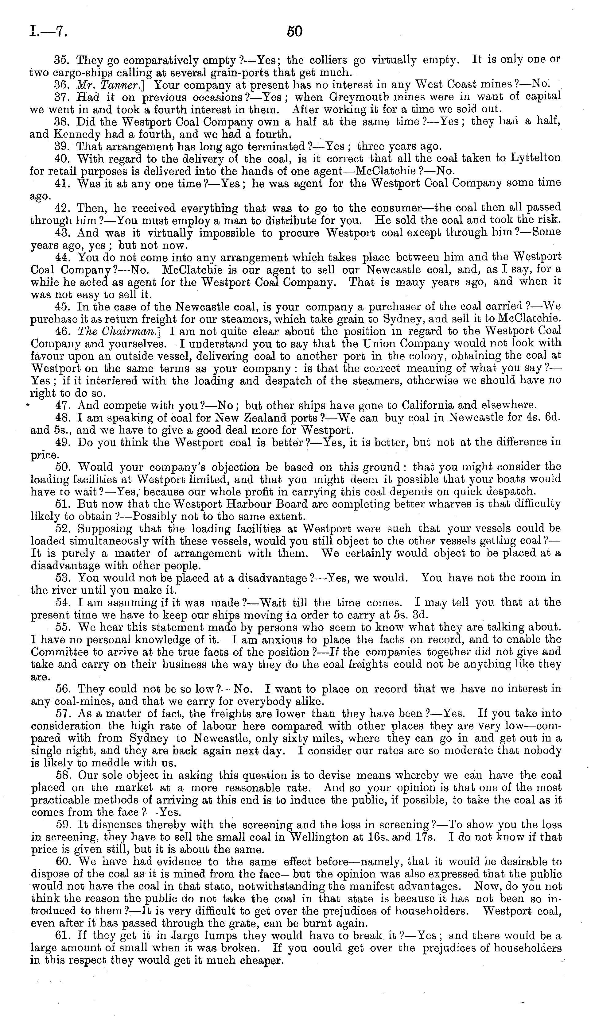 35. They go comparatively empty ? —Yes; the colliers go virtually empty. It is only one or two cargo-ships calling at several grain-ports that get much. 36. Mr. Tanner.] Your company at present has no interest in any West Coast mines ?—No. 37. Had it on previous occasions ? —Yes; when Greymouth mines were in want of capital we went in and took a fourth interest in them. After working it for a time we sold out. 38. Did the Westport Coal Company own a half at the same time ?—Yes; they had a half, and Kennedy had a fourth, and we had a fourth. 39. That arrangement has long ago terminated ?—Yes ; three years ago. 40. With regard to the delivery of the coal, is it correct that all the coal taken to Lyttelton for retail purposes is delivered into the hands of one agent—McClatchie ? —No. 41. Was it at any one time?— Yes; he was agent for the Westport Coal Company some time ago. 42. Then, he received everything that was to go to the consumer—the coal then all passed through him ?—You must employ a man to distribute for you. He sold the coal and took the risk. 43. And was it virtually impossible to procure Westport coal except through him ?—Some years ago, yes ; but not now. 44. You do not come into any arrangement which takes place between him and the Westport Coal Company ?—No. McClatchie is our agent to sell our Newcastle coal, and, as I say, for a while he acted as agent for the Westport Coal Company. That is many years ago, and when it was not easy to sell it. 45. In the case of the Newcastle coal, is your company a purchaser of the coal carried ?—We purchase it as return freight for our steamers, which take grain to Sydney, and sell it to McClatchie. 46. The Chairman.] I am not quite clear about the position in regard to the Westport Coal Company and yourselves. I understand you to say that the Union Company would not look with favour upon an outside vessel, delivering coal to another port in the colony, obtaining the coal at Westport on the same terms as your company : is that the correct meaning of what you say ? — Yes ; if it interfered with the loading and despatch of the steamers, otherwise we should have no right to do so. 47. And compete with you?—No; but other ships have gone to California and elsewhere. 48. I am speaking of coal for New Zealand ports ?—We can buy coal in Newcastle for 4s. 6d. and 55., and we have to give a good deal more for Westport. 49. Do you think the Westport coal is better ? —Yes, it is better, but not at the difference in price. 50. Would your company's objection be based on this ground : that you might consider the loading facilities at Westport limited, and that you might deem it possible that your boats would have to wait?— Yes, because our whole profit in carrying this coal depends on quick despatch. 51. But now that the Westport Harbour Board are completing better wharves is that difficulty likely to obtain ?—Possibly not to the same extent. 52. Supposing that the loading facilities at Westport were such that your vessels could be loaded simultaneously with these vessels, would you still object to the other vessels getting coal?— It is purely a matter of arrangement with them. We certainly would object to be placed at a disadvantage with other people. 53. You would not be placed at a disadvantage ?—Yes, we would. You have not the room in the river until you make it. 54. lam assuming if it was made? —Wait till the time comes. I may tell you that at the present time we have to keep our ships moving in order to carry at ss. 3d. 55. We hear this statement made by persons who seem to know what they are talking about. I have no personal knowledge of it. lam anxious to place the facts on record, and to enable the Committee to arrive at the true facts of the position ?—lf the companies together did not give and take and carry on their business the way they do the coal freights could not be anything like they are. 56. They could not be so low?— No. I want to place on record that we have no interest in any coal-mines, and that we carry for everybody alike. 57. As a matter of fact, the freights are lower than they have been ?—Yes. If you take into consideration the high rate of labour here compared with other places they are very low—compared with from Sydney to Newcastle, only sixty miles, where they can go in and get out in a single night, and they are back again next day. I consider our rates are so moderate that nobody is likely to meddle with us. 58. Our sole object in asking this question is to devise means whereby we can have the coal placed on the market at a more reasonable rate. And so your opinion is that one of the most practicable methods of arriving at this end is to induce the public, if possible, to take the coal as it comes from the face ?—Yes. 59. It dispenses thereby with the screening and the loss in screening? —To show you the loss in screening, they have to sell the small coal in Wellington at 16s. and 17s. Ido not know if that price is given still, but it is about the same. 60. We have had evidence to the same effect before—namely, that it would be desirable to dispose of the coal as it is mined from the face—but the opinion was also expressed that the public would not have the coal in that state, notwithstanding the manifest advantages. Now, do you not think the reason the public do not take the coal in that state is because it has not been so introduced to them?—lt is very difficult to get over the prejudices of householders. Westport coal, even after it has passed through the grate, can be burnt again. 61. If they get it in .large lumps they would have to break it ?—Yes; and there would be a large amount of small when it was broken. If you could get over the prejudices of householders in this respect they would get it much cheaper.