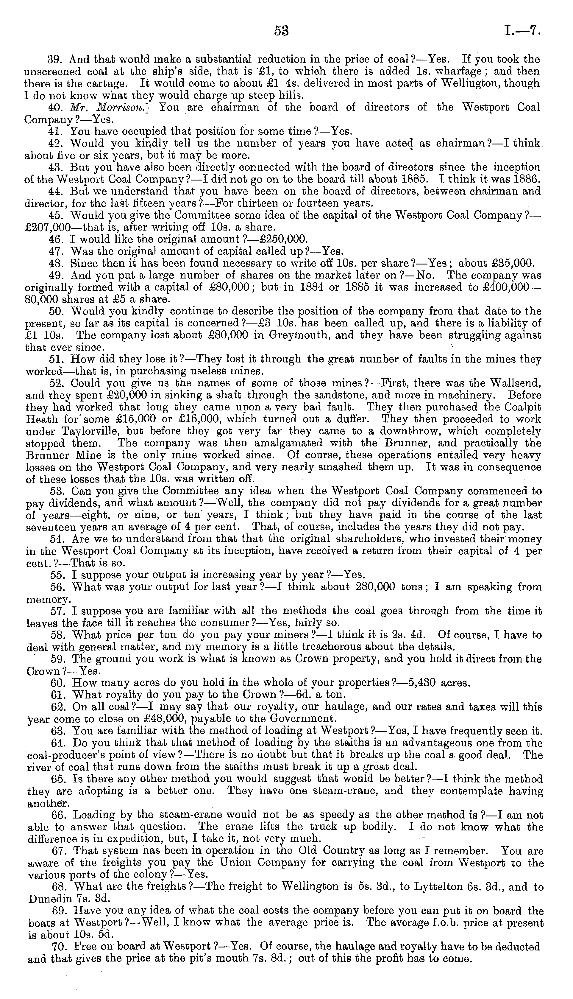 39. And that would make a substantial reduction in the price of coal?— Yes. If you took the unscreened coal at the ship's side, that is £1, to which there is added Is. wharfage; and then there is the cartage. It would come to about £1 4s. delivered in most parts of Wellington, though I do not know what they would charge up steep hills. 40. Mr. Morrison.] You are chairman of the board of directors of the Westport Coal Company ? —Yes. 41. You have occupied that position for some time? —Yes. 42. Would you kindly tell us the number of years you have acted as chairman? —I think about five or six years, but it may be more. 43. But you have also been directly connected with the board of directors since the inception of the Westport Coal Company?—l did not go on to the board till about 1885. I think it was 1886. 44. But we understand that you have been on the board of directors, between chairman and director, for the last fifteen years ?—For thirteen or fourteen years. 45. Would you give the Committee some idea of the capital of the Westport Coal Company ?— £207,000 —that is, after writing off 10s. a share. 46. I would like the original amount ?—£250,000. 47. Was the original amount of capital called up?— Yes. 48. Since then it has been found necessary to write off 10s. per share?— Yes; about £35,000. 49. And you put a large number of shares on the market later on ? —No. The company was originally formed with a capital of £80,000; but in 1884 or 1885 it was increased to £400,000 — 80,000 snares at £5 a share. 50. Would you kindly continue to describe the position of the company from that date to the present, so far as its capital is concerned? —£3 10s. has been called up, and there is a liability of £1 10s. The company lost about £80,000 in Greymouth, and they have been struggling against that ever since. 51. How did they lose it? —They lost it through the great number of faults in the mines they worked —that is, in purchasing useless mines. 52. Could you give us the names of some of those mines ? —First, there was the Wallsend, and they spent £20,000 in sinking a shaft through the sandstone, and more in machinery. Before they had worked that long they came upon a very bad fault. They then purchased the Coalpit Heath for' some £15,000 or £16,000, which turned out a duffer. They then proceeded to work under Taylorville, but before they got very far they came to a downthrow, which completely stopped them. The company was then amalgamated with the Brunner, and practically the Brunner Mine is the only mine worked since. Of course, these operations entailed very heavy losses on the Westport Coal Company, and very nearly smashed them up. It was in consequence of these losses that the 10s. was written off. 53. Can you give the Committee any idea when the Westport Coal Company commenced to pay dividends, and what amount ?—Well, the company did not pay dividends for a great number of years—eight, or nine, or ten years, I think; but they have paid in the course of the last seventeen years an average of 4 per cent. That, of course, includes the years they did not pay. 54. Are we to understand from that that the original shareholders, who invested their money in the Westport Coal Company at its inception, have received a return from their capital of 4 per cent. ? —That is so. 55. I suppose your output is increasing year by year ?—Yes. 56. What was your output for last year ? —I think about 280,000 tons; I am speaking from memory. 57. I suppose you are familiar with all the methods the coal goes through from the time it leaves the face till it reaches the consumer ? —Yes, fairly so. 58. What price per ton do you pay your miners ?—I think it is 2s. 4d. Of course, I have to deal with general matter, and my memory is a little treacherous about the details. 59. The ground you work is what is known as Crown property, and you hold it direct from the Crown? —Yes. 60. How many acres do you hold in the whole of your properties?—s,43o acres. 61. What royalty do you pay to the Crown ?—6d. a ton. 62. On all coal ?—I may say that our royalty, our haulage, and our rates and taxes will this year come to close on £48,000, payable to the Government. 63. You are familiar with the method of loading at Westport ?—Yes, I have frequently seen it. 64. Do you think that that method of loading by the staiths is an advantageous one from the coal-producer's point of view?— There is no doubt but that it breaks up the coal a good deal. The river of coal that runs down from the staiths must break it up a great deal. 65. Is there any other method you would suggest that would be better?—l think the method they are adopting is a better one. They have one steam-crane, and they contemplate having another. 66. Loading by the steam-crane would not be as speedy as the other method is ? —I am not able to answer that question. The crane lifts the truck up bodily. Ido not know what the difference is in expedition, but, I take it, not very much. 67. That system has been in operation in the Old Country as long as I remember. You are aware of the freights you pay the Union Company for carrying the coal from Westport to the various ports of the colony ?—Yes. 68. What are the freights?— The freight to Wellington is ss. 3d., to Lyttelton 6s. 3d., and to Dunedin 7s. 3d. 69. Have you any idea of what the coal costs the company before you can put it on board the boats at Westport?—Well, I know what the average price is. The average f.o.b. price at present is about 10s. sd. 70. Free on board at Westport ?—Yes. Of course, the haulage and royalty have to be deducted and that gives the price at the pit's mouth 7s. Bd.; out of this the profit has to come.