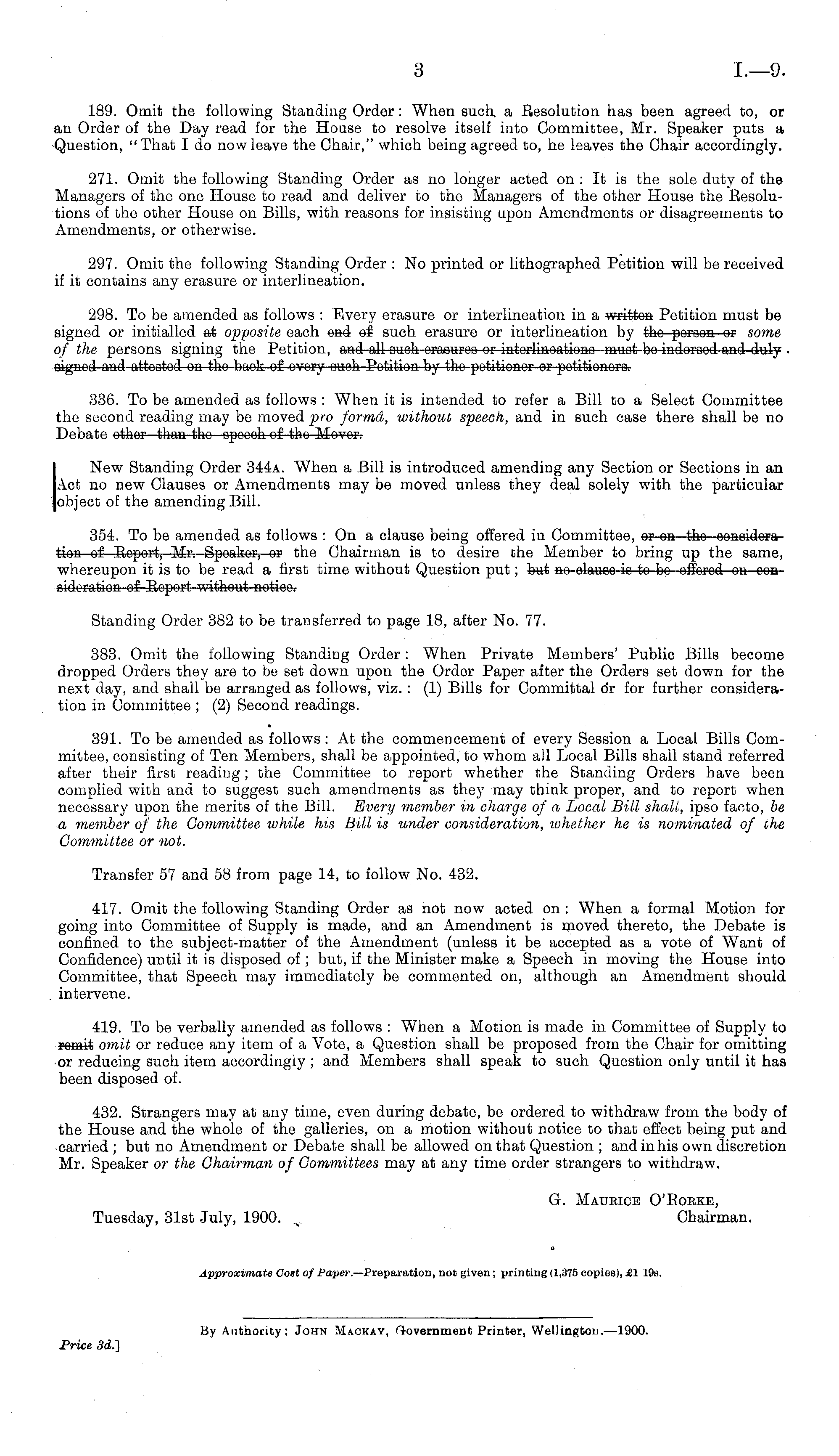 189. Omit the following Standing Order: When such a Eesolution has been agreed to, or an Order of the Day read for the House to resolve itself into Committee, Mr. Speaker puts a Question, " That I do now leave the Chair," which being agreed to, he leaves the Chair accordingly. 271. Omit the following Standing Order as no longer acted on : It is the sole duty of the Managers of the one House to read and deliver to the Managers of the other House the Besolutions of the other House on Bills, with reasons for insisting upon Amendments or disagreements to Amendments, or otherwise. 297. Omit the following Standing Order : No printed or lithographed Petition will be received if it contains any erasure or interlineation. 298. To be amended as follows : Every erasure or interlineation in a writton Petition must be signed or initialled at opposite each cad ci such erasure or interlineation by tho pefoon or some of the persons signing the Petition, aad-all ouch oraouroo or mtorlinoationo muot bo indorood and duly . oignod and attootod on tho baok of ovory ouoh Potition by tho potitionor or potitionoro. 336. To be amended as follows : When it is intended to refer a Bill to a Select Committee the second reading may be moved pro forma, without speech, and in such case there shall be no Debate etbor than tho opeooh of tho Movoe? New Standing Order 344 a. When a Bill is introduced amending any Section or Sections in an Act no new Clauses or Amendments may be moved unless they deal solely with the particular object of the amending Bill. 354. To be amended as follows : On a clause being offered in Committee, or on tho oonoideration of Boport, Mr. Spoakor, or the Chairman is to desire the Member to bring up the same, whereupon it is to be read a first time without Question put; feat no olauoo io to bo offorod on con sideration of Boport without notico. Standing Order 382 to be transferred to page 18, after No. 77. 383. Omit the following Standing Order: When Private Members' Public Bills become dropped Orders they are to be set down upon the Order Paper after the Orders set down for the next day, and shall be arranged as follows, viz. : (1) Bills for Committal dr for further consideration in Committee ; (2) Second readings. 391. To be amended as follows : At the commencement of every Session a Local Bills Committee, consisting of Ten Members, shall be appointed, to whom all Local Bills shall stand referred after their first reading; the Committee to report whether the Standing Orders have been complied with and to suggest such amendments as they may think proper, and to report when necessary upon the merits of the Bill. Every member in charge of a Local Bill shall, ipso facto, be a member of the Committee while his Bill is under consideration, whether he is nominated of the Committee or not. Transfer 57 and 58 from page 14, to follow No. 432. 417. Omit the following Standing Order as not now acted on : When a formal Motion for going into Committee of Supply is made, and an Amendment is moved thereto, the Debate is confined to the subject-matter of the Amendment (unless it be accepted as a vote of Want of Confidence) until it is disposed of ; but, if the Minister make a Speech in moving the House into Committee, that Speech may immediately be commented on, although an Amendment should intervene. 419. To be verbally amended as follows : When a Motion is made in Committee of Supply to romit omit or reduce any item of a Vote, a Question shall be proposed from the Chair for omitting or reducing such item accordingly ; and Members shall speak to such Question only until it has been disposed of. 432. Strangers may at any time, even during debate, be ordered to withdraw from the body of the House and the whole of the galleries, on a motion without notice to that effect being put and carried ; but no Amendment or Debate shall be allowed on that Question ; and in his own discretion Mr. Speaker or the Chairman of Committees may at any time order strangers to withdraw. G. Maubice O'Bobke, Tuesday, 31st July, 1900. Chairman. Approximate Cost of Paper. —Preparation, not given; printing (1,375 copies), £1 19s.