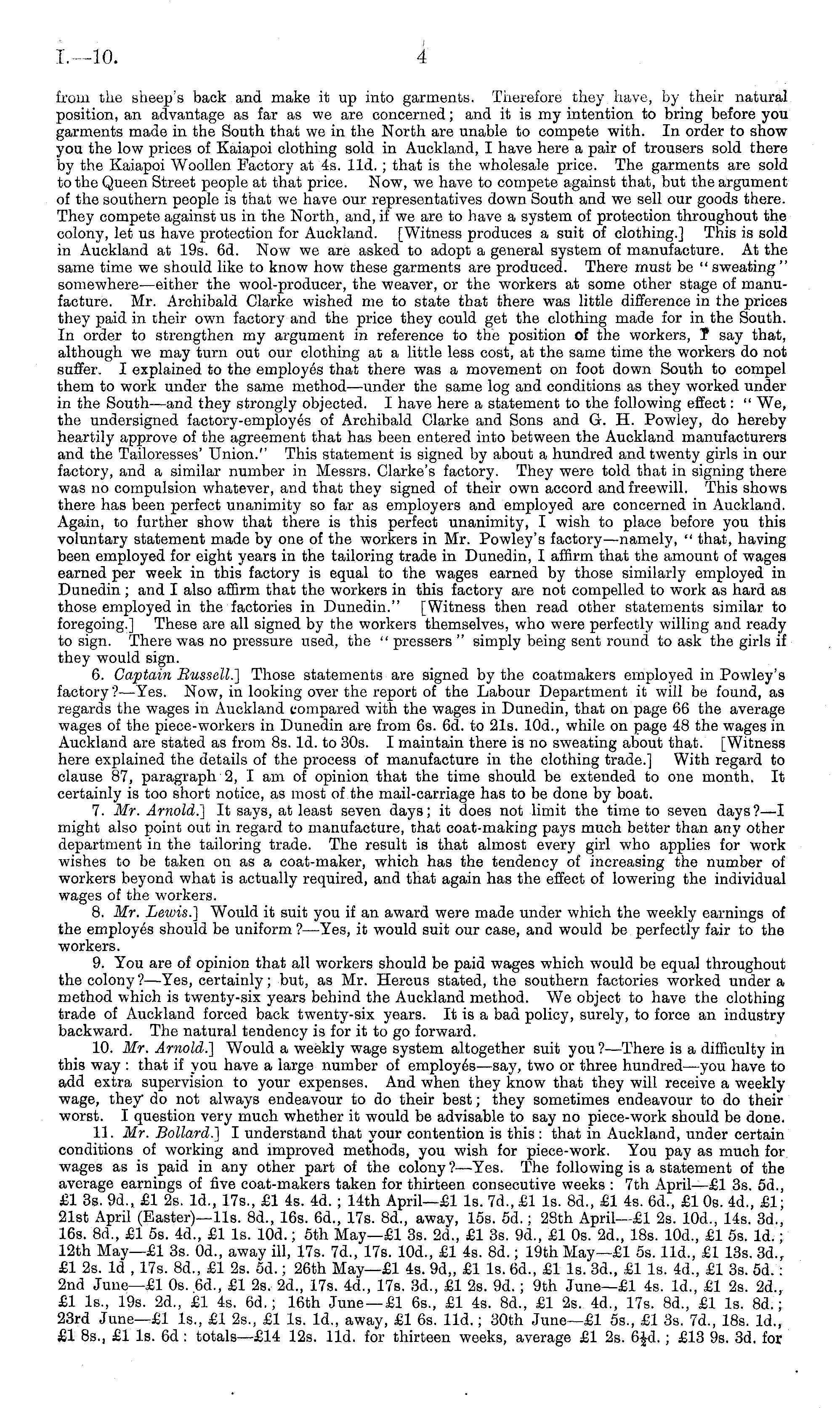 from the sheep's back and make it up into garments. Therefore they have, by their natural position, an advantage as far as we are concerned; and it is my intention to bring before you garments made in the South that we in the North are unable to compete with. In order to show you the low prices of Kaiapoi clothing sold in Auckland, I have here a pair of trousers sold there by the Kaiapoi Woollen Factory at 4s. lid. ; that is the wholesale price. The garments are sold to the Queen Street people at that price. Now, we have to compete against that, but the argument of the southern people is that we have our representatives down South and we sell our goods there. They compete against us in the North, and, if we are to have a system of protection throughout the colony, let us have protection for Auckland. [Witness produces a suit of clothing.] This is sold in Auckland at 19s. 6d. Now we are asked to adopt a general system of manufacture. At the same time we should like to know how these garments are produced. There must be " sweating " somewhere—either the wool-producer, the weaver, or the workers at some other stage of manufacture. Mr. Archibald Clarke wished me to state that there was little difference in the prices they paid in their own factory and the price they could get the clothing made for in the South. In order to strengthen my argument in reference to the position of the workers, T say that, although we may turn out our clothing at a little less cost, at the same time the workers do not suffer. I explained to the employes that there was a movement on foot down South to compel them to work under the same method—under the same log and conditions as they worked under in the South—and they strongly objected. I have here a statement to the following effect: " We, the undersigned factory-employes of Archibald Clarke and Sons and G. H. Powley, do hereby heartily approve of the agreement that has been entered into between the Auckland manufacturers and the Tailoresses' Union.'' This statement is signed by about a hundred and twenty girls in our factory, and a similar number in Messrs. Clarke's factory. They were told that in signing there was no compulsion whatever, and that they signed of their own accord and freewill. This shows there has been perfect unanimity so far as employers and employed are concerned in Auckland. Again, to further show that there is this perfect unanimity, I wish to place before you this voluntary statement made by one of the workers in Mr. Powley's factory—namely, " that, having been employed for eight years in the tailoring trade in Dunedin, I affirm that the amount of wages earned per week in this factory is equal to the wages earned by those similarly employed in Dunedin ; and I also affirm that the workers in this factory are not compelled to work as hard as those employed in the factories in Dunedin." [Witness then read other statements similar to foregoing.] These are all signed by the workers themselves, who were perfectly willing and ready to sign. There was no pressure used, the " pressers " simply being sent round to ask the girls if they would sign. 6. Captain Russell.] Those statements are signed by the coatmakers employed in Powley's factory?— Yes. Now, in looking over the report of the Labour Department it will be found, as regards the wages in Auckland compared with the wages in Dunedin, that on page 66 the average wages of the piece-workers in Dunedin are from 6s. 6d. to 21s. 10d., while on page 48 the wages in Auckland are stated as from Bs. Id. to 30s. I maintain there is no sweating about that. [Witness here explained the details of the process of manufacture in the clothing trade.] With regard to clause 87, paragraph' 2, lam of opinion that the time should be extended to one month. It certainly is too short notice, as most of the mail-carriage has to be done by boat. 7. Mr. Arnold.} It says, at least seven days; it does not limit the time to seven days?—l might also point out in regard to manufacture, that coat-making pays much better than any other department in the tailoring trade. The result is that almost every girl who applies for work wishes to be taken on as a coat-maker, which has the tendency of increasing the number of workers beyond what is actually required, and that again has the effect of lowering the individual wages of the workers. 8. Mr. Lewis.] Would it suit you if an award were made under which the weekly earnings of the employes should be uniform ? —Yes, it would suit our case, and would be perfectly fair to the workers. 9. You are of opinion that all workers should be paid wages which would be equal throughout the colony ?—Yes, certainly; but, as Mr. Hercus stated, the southern factories worked under a method which is twenty-six years behind the Auckland method. We object to have the clothing trade of Auckland forced back twenty-six years. It is a bad policy, surely, to force an industry backward. The natural tendency is for it to go forward. 10. Mr. Arnold.] Would a weekly wage system altogether suit you ? —There is a difficulty in this way : that if you have a large number of employes—say, two or three hundred—you have to add extra supervision to your expenses. And when they know that they will receive a weekly wage, they do not always endeavour to do their best; they sometimes endeavour to do their worst. I question very much whether it would be advisable to say no piece-work should be done. 11. Mr. Bollard.} I understand that your contention is this : that in Auckland, under certain conditions of working and improved methods, you wish for piece-work. You pay as much for wages as is paid in any other part of the colony ?—Yes. The following is a statement of the average earnings of five coat-makers taken for thirteen consecutive weeks : 7th April—£l 3s. 5d., £1 3s. 9d., £1 2s. Id., 175., £1 4s. 4d. ; 14th April—£l Is. 7d.,£l Is. Bd., £1 4s. 6d., £1 os. 4d., £1; 21st April (Easter)—l