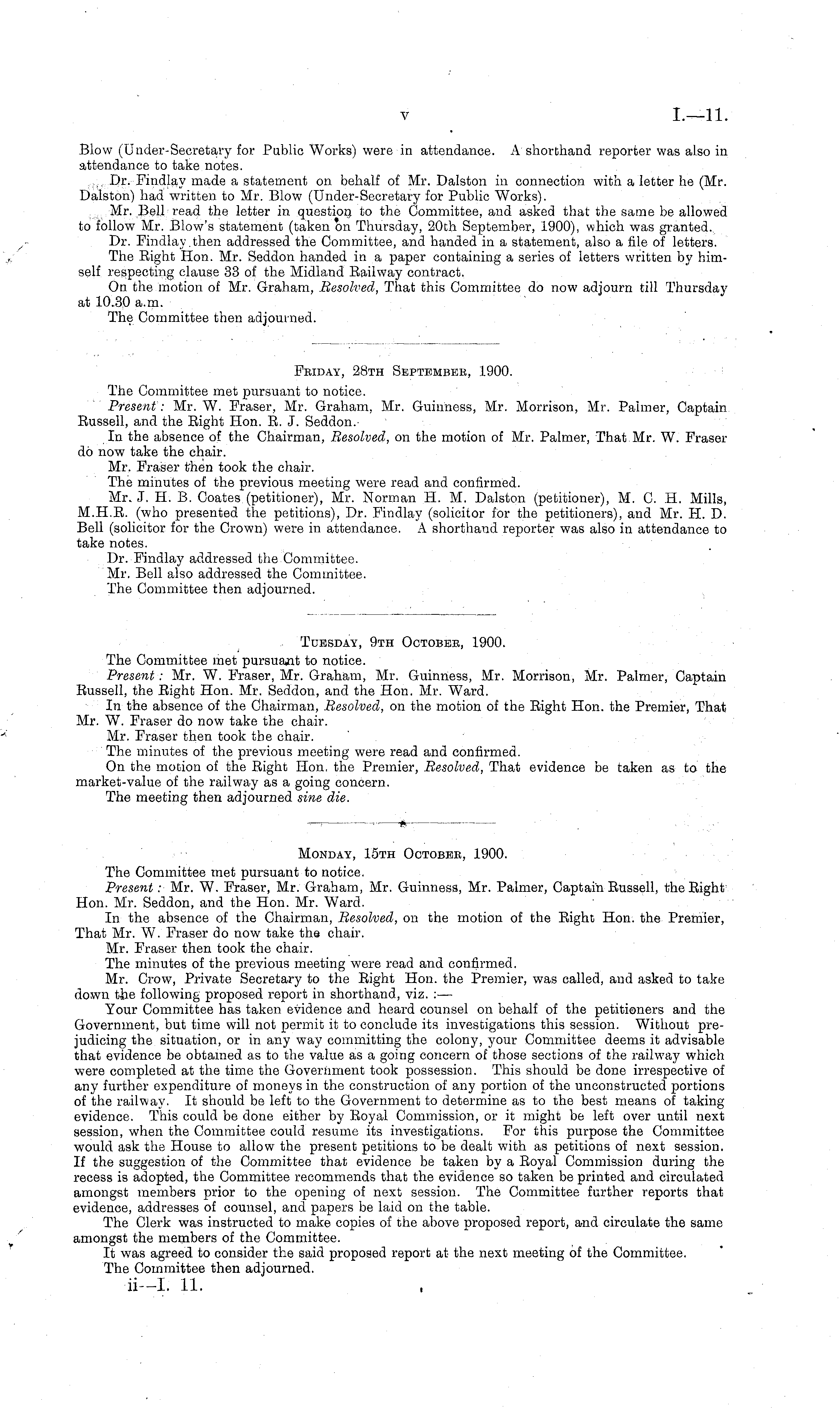 Friday, 28th Septbmbeb, 1900. The Committee met pursuant to notice. Present: Mr. W. Eraser, Mr. Graham, Mr. Guinness, Mr. Morrison, Mr. Palmer, Captain Eussell, and the Eight Hon. B. J. Seddon. In the absence of the Chairman, Besolved, on the motion of Mr. Palmer, That Mr. W. Fraser do now take the chair. Mr. Fraser then took the chair. The minutes of the previous meeting were read and confirmed. Mr. J. H. B. Coates (petitioner), Mr. Norman H. M. Dalston (petitioner), M. C. H. Mills, M.H.E. (who presented the petitions), Dr. Findlay (solicitor for the petitioners), and Mr. H. D. Bell (solicitor for the Crown) were in attendance. A shorthand reporter was also in attendance to take notes. Dr. Findlay addressed the Committee. Mr. Bell also addressed the Committee. The Committee then adjourned.
