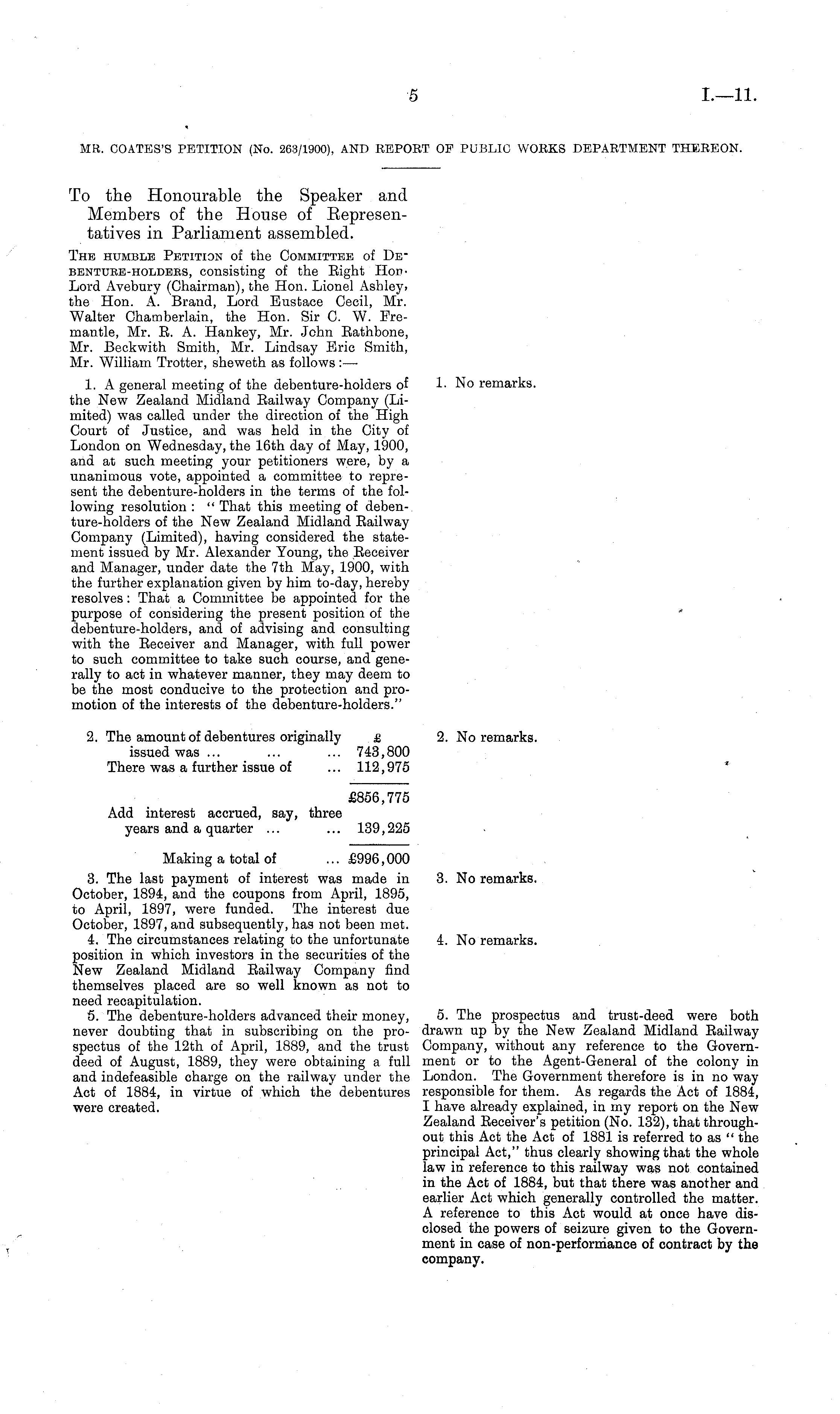 To the Honourable the Speaker and Members of the House of Representatives in Parliament assembled. The humble Petition of the Committee of De _ bentube-holdebs, consisting of the Eight HopLord Avebury (Chairman), the Hon. Lionel Ashley> the Hon. A. Brand, Lord Eustace Cecil, Mr. Walter Chamberlain, the Hon. Sir C. W. Fremantle, Mr. E. A. Hankey, Mr. John Eathbone, Mr. Beckwith Smith, Mr. Lindsay Eric Smith, Mr. William Trotter, sheweth as follows :— 1. A general meeting of the debenture-holders of the New Zealand Midland Eailway Company (Limited) was called under the direction of the High Court of Justice, and was held in the City of London on Wednesday, the 16th day of May, 1900, and at such meeting your petitioners were, by a unanimous vote, appointed a committee to represent the debenture-holders in the terms of the following resolution : " That this meeting of deben-ture-holders of the New Zealand Midland Eailway Company (Limited), having considered the statement issued by Mr. Alexander Young, the Eeceiver and Manager, under date the 7th May, 1900, with the further explanation given by him to-day, hereby resolves: That a Committee be appointed for the purpose of considering the present position of the debenture-holders, and of advising and consulting with the Eeceiver and Manager, with full power to such committee to take such course, and generally to act in whatever manner, they may deem to be the most conducive to the protection and promotion of the interests of the debenture-holders." 2. The amount of debentures originally £ issued was... ... ... 743,800 There was a further issue of ... 112,975 £856,775 Add interest accrued, say, three years and a quarter ... ... 139,225 Making a total of ...£996,000 3. The last payment of interest was made in October, 1894, and the coupons from April, 1895, to April, 1897, were funded. The interest due October, 1897, and subsequently, has not been met. 4. The circumstances relating to the unfortunate position in which investors in the securities of the New Zealand Midland Eailway Company find themselves placed are so well known as not to need recapitulation. 5. The debenture-holders advanced their money, never doubting that in subscribing on the prospectus of the 12th of April, 1889, and the trust deed of August, 1889, they were obtaining a full and indefeasible charge on the railway under the Act of 1884, in virtue of which the debentures were created.