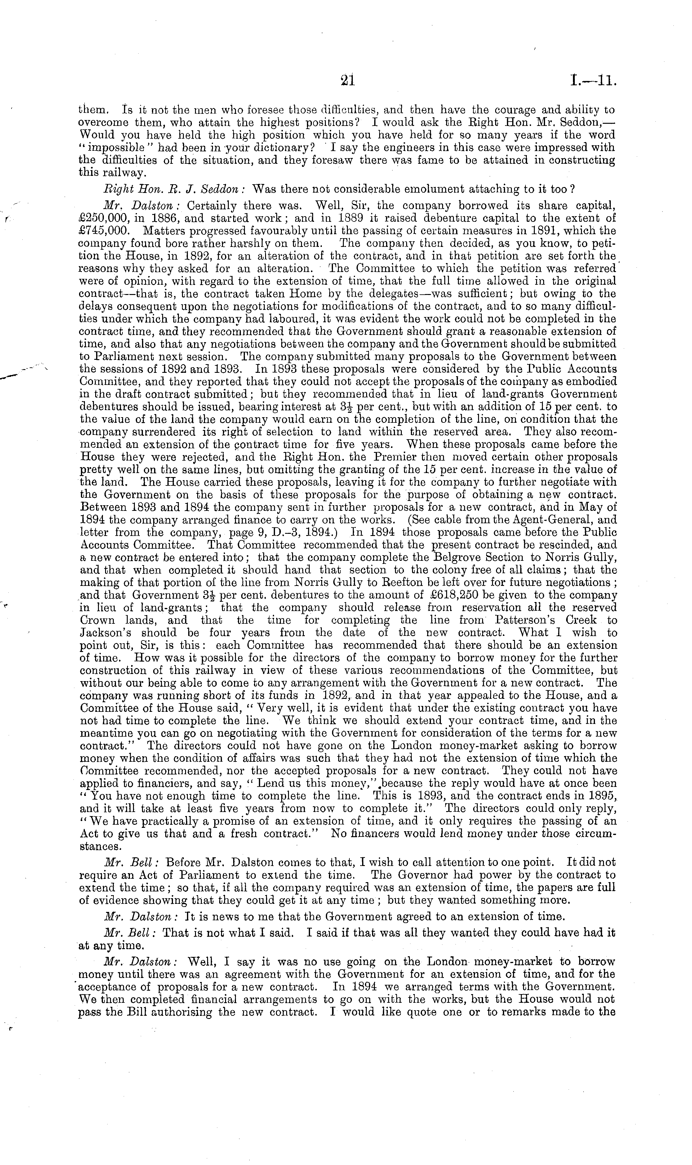 them. Is it not the men who foresee those difficulties, and then have the courage and ability to overcome them, who attain the highest positions? I would ask the Eight Hon. Mr. Seddon, — Would you have held the high position which you have held for so many years if the word " impossible " had been in your dictionary? I say the engineers in this case were impressed with the difficulties of the situation, and they foresaw there was fame to be attained in constructing this railway. Bight Hon. B. J. Seddon: Was there not considerable emolument attaching to it too ? Mr. Dalston : Certainly there was. Well, Sir, the company borrowed its share capital, £250,000, in 1886, and started work; and in 1889 it raised debenture capital to the extent of £745,000. Matters progressed favourably until the passing of certain measures in 1891, which the company found bore rather harshly on them. The company then decided, as you know, to petition the House, in 1892, for an alteration of the contract, and in that petition are set forth the reasons why they asked for an alteration. The Committee to which the petition was referred were of opinion, with regard to the extension of time, that the full time allowed in the original contract—that is, the contract taken Home by the delegates—was sufficient; but owing to the delays consequent upon the negotiations for modifications of the contract, and to so many difficulties under which the company had laboured, it was evident the work could not be completed in the contract time, and they recommended that the Government should grant a reasonable extension of time, and also that any negotiations between the company and the Government should be submitted to Parliament next session. The company submitted many proposals to the Government between the sessions of 1892 and 1893. In 1893 these proposals were considered by the Public Accounts Committee, and they reported that they could not accept the proposals of the company as embodied in the draft contract submitted; but they recommended that in lieu of land-grants Government debentures should be issued, bearing interest at 3f per cent., but with an addition of 15 per cent, to the value of the land the company would earn on the completion of the line, on condition that the company surrendered its right of selection to land within the reserved area. They also recommended an extension of the contract time for five years. When these proposals came before the House they were rejected, and the Eight Hon. the Premier then moved certain other proposals pretty well on the same lines, but omitting the granting of the 15 per cent, increase in the value of the land. The House carried these proposals, leaving it for the company to further negotiate with the Government on the basis of these proposals for the purpose of obtaining a new contract. Between 1893 and 1894 the company sent in further proposals for a new contract, and in May of 1894 the company arranged finance to carry on the works. (See cable from the Agent-General, and letter from the company, page 9, D.-3, 1894.) In 1894 those proposals came before the Public Accounts Committee. That Committee recommended that the present contract be rescinded, and a new contract be entered into; that the company complete the Belgrove Section to Norris Gully, and that when completed it should hand that section to the colony free of all claims; that the making of that portion of the line from Norris Gully to Eeefton be left over for future negotiations ; and that Government 3J per cent, debentures to the amount of £618,250 be given to the company in lieu of land-grants; that the company should release from reservation all the reserved Grown lands, and that the time for completing the line from Patterson's Creek to Jackson's should be four years from the date of the new contract. What 1 wish to point out, Sir, is this: each Committee has recommended that there should be an extension of time. How was it possible for the directors of the company to borrow money for the further construction of this railway in view of these various recommendations of the Committee, but without our being able to come to any arrangement with the Government for a new contract. The company was running short of its funds in 1892, and in that year appealed to the House, and a Committee of the House said, " Very well, it is evident that under the existing contract you have not had time to complete the line. We think we should extend your contract time, and in the meantime you can go on negotiating with the Government for consideration of the terms for a new contract." The directors could not have gone on the London money-market asking to borrow money when the condition of affairs was such that they had not the extension of time which the Committee recommended, nor the accepted proposals for a new contract. They could not have applied to financiers, and say, " Lend us this money,".because the reply would have at once been " You have not enough time to complete the line. This is 1893, and the contract ends in 1895, and it will take at least five years from now to complete it." The directors could only reply, "We have practically a promise of an extension of time, and it only requires the passing of an Act to give us that and a fresh contract." No financers would lend money under those circumstances. Mr. Bell: Before Mr. Dalston comes to that, I wish to call attention to one point. It did not require an Act of Parliament to extend the time. The Governor had power by the contract to extend the time; so that, if all the company required was an extension of time, the papers are full of evidence showing that they could get it at any time ; but they wanted something more. Mr. Dalston: It is news to me that the Government agreed to an extension of time. Mr. Bell: That is not what I said. I said if that was all they wanted they could have had it at any time. Mr. Dalston: Well, I say it was no use going on the London money