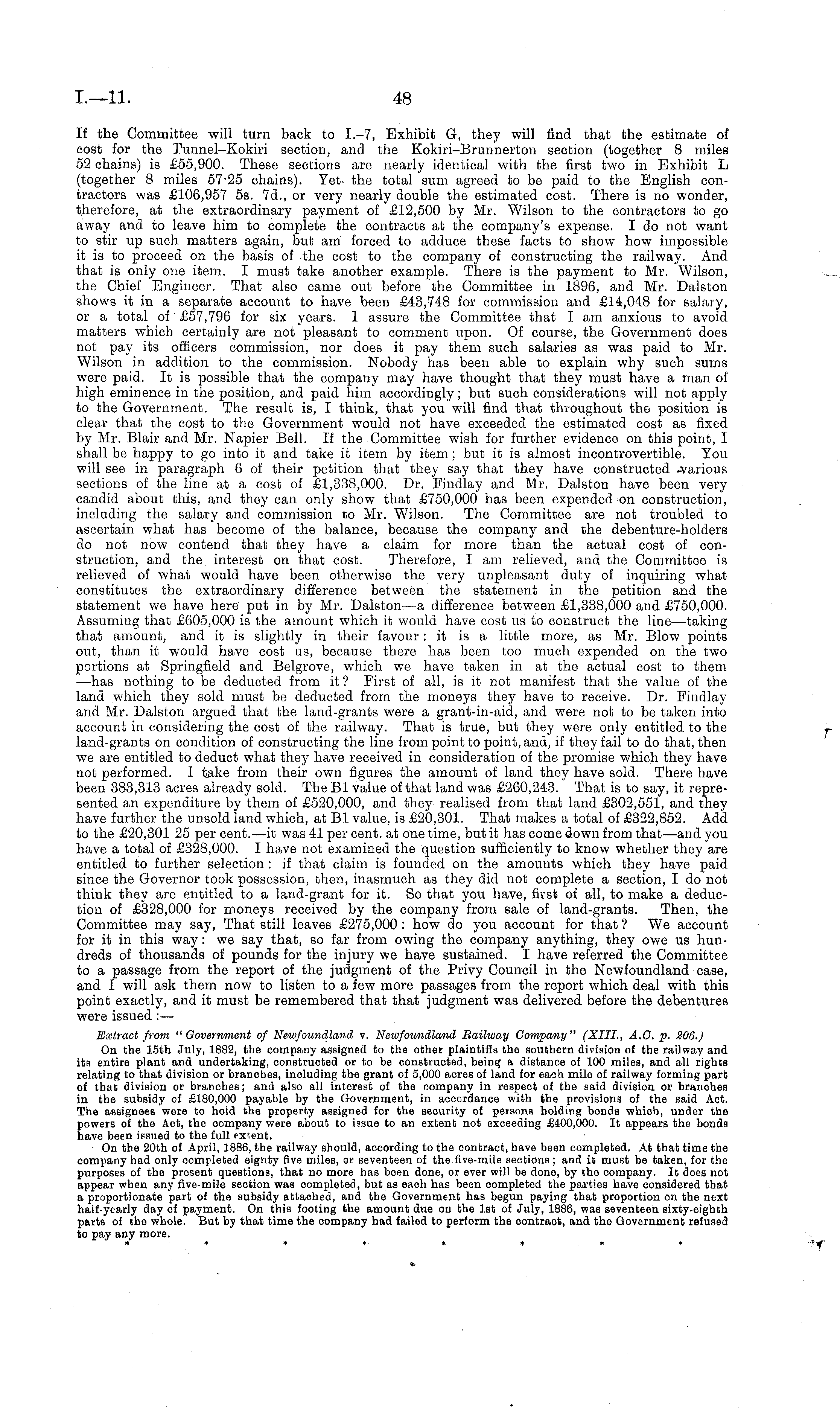 If the Committee wili turn back to 1.-7, Exhibit G, they will find that the estimate of cost for the Tunnel-Kokiri section, and the Kokiri-Brunnerton section (together 8 miles 52 chains) is £55,900. These sections are nearly identical with the first two in Exhibit L (together 8 miles 57-25 chains). Yet the total sum agreed to be paid to the English contractors was £106,957 ss. 7d., or very nearly double the estimated cost. There is no wonder, therefore, at the extraordinary payment of £12,500 by Mr. Wilson to the contractors to go away and to leave him to complete the contracts at the company's expense. I do not want to stir up such matters again, but am forced to adduce these facts to show how impossible it is to proceed on the basis of the cost to the company of constructing the railway. And that is only one item. I must take another example. There is the payment to Mr. Wilson, the Chief Engineer. That also came out before the Committee in 1896, and Mr. Dalston shows it in a separate account to have been £43,748 for commission and £14,048 for salary, or a total of £57,796 for six years. 1 assure the Committee that I am anxious to avoid matters which certainly are not pleasant to comment upon. Of course, the Government does not pay its officers commission, nor does it pay them such salaries as was paid to Mr. Wilson in addition to the commission. Nobody has been able to explain why such sums were paid. It is possible that the company may have thought that they must have a man of high eminence in the position, and paid him accordingly; but such considerations will not apply to the Government. The result is, I think, that you will find that throughout the position is clear that the cost to the Government would not have exceeded the estimated cost as fixed by Mr. Blair and Mr. Napier Bell. If the Committee wish for further evidence on this point, I shall be happy to go into it and take it item by item ; but it is almost incontrovertible. You will see in paragraph 6 of their petition that they say that they have constructed -various sections of the line at a cost of £1,338,000. Dr. Findlay and Mr. Dalston have been very candid about this, and they can only show that £750,000 has been expended on construction, including the salary and commission to Mr. Wilson. The Committee are not troubled to ascertain what has become of the balance, because the company and the debenture-holders do not now contend that they have a claim for more than the actual cost of construction, and the interest on that cost. Therefore, I am relieved, and the Committee is relieved of what would have been otherwise the very unpleasant duty of inquiring what constitutes the extraordinary difference between the statement in the petition and the statement we have here put in by Mr. Dalston—a difference between £1,338,000 and £750,000. Assuming that £605,000 is the amount which it would have cost us to construct the line—taking that amount, and it is slightly in their favour: it is a little more, as Mr. Blow points out, than it would have cost as, because there has been too much expended on the two portions at Springfield and Belgrove, which we have taken in at the actual cost to them —has nothing to be deducted from it ? First of all, is it not manifest that the value of the land which they sold must be deducted from the moneys they have to receive. Dr. Findlay and Mr. Dalston argued that the land-grants were a grant-in-aid, and were not to be taken into account in considering the cost of the railway. That is true, but they were only entitled to the land-grants on condition of constructing the line from point to point, and, if they fail to do that, then we are entitled to deduct what they have received in consideration, of the promise which they have not performed. 1 take from their own figures the amount of land they have sold. There have been 383,313 acres already sold. The Bl value of that land was £260,243. That is to say, it represented an expenditure by them of £520,000, and they realised from that land £302,551, and they have further the unsold land which, at Bl value, is £20,301. That makes a total of £322,852. Add to the £20,301 25 per cent. —it was 41 per cent, at one time, but it has come down from that—and you have a total of £328,000. I have not examined the question sufficiently to know whether they are entitled to further selection : if that claim is founded on the amounts which they have paid since the Governor took possession, then, inasmuch as they did not complete a section, I do not think they are entitled to a land-grant for it. So that you have, first of all, to make a deduction of £328,000 for moneys received by the company from sale of land-grants. Then, the Committee may say, That still leaves £275,000 : how do you account for that ? We account for it in this way : we say that, so far from owing the company anything, they owe us hundreds of thousands of pounds for the injury we have sustained. I have referred the Committee to a passage from the report of the judgment of the Privy Council in the Newfoundland case, and I will ask them now to listen to a few more passages from the report which deal with this point exactly, and it must be remembered that that judgment was delivered before the debentures were issued :— Extract from "Government of Newfoundland v. Newfoundland Railway Company" (XIII., A.C. p. 206.) On the 15th July, 1882, the company assigned to the other plaintiffs the southern division of the railway and its entire plant and undertaking, constructed or to be constructed, being a distance of 100 miles, and all rights relating to that division or branches, including the grant of 5,000 acres of land for each mile of railway forming part of that division or branches; and also all interest of the company in respect of the said division or branches in the subsidy of £180,000 payable by the Government, in accordance with the provisions of the said Act. The assig