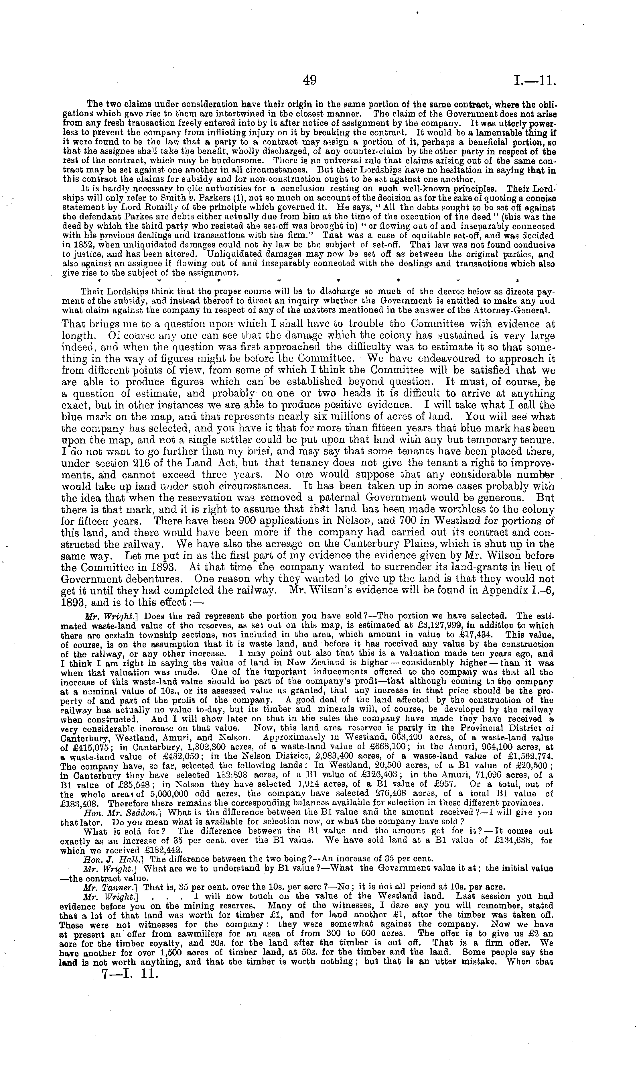 The two claims under consideration have their origin in the same portion of the same contract, where the obligations whioh gave rise to them are intertwined in the closest manner. The claim of the Government does not arise from any fresh transaction freely entered into by it after notice of assignment by the company. It was utterly powerless to prevent the company from inflicting injury on it by breaking the contract. It would be a lamentable thing if it were found to be the law that a party to a contract may assign a portion of it, perhaps a beneficial portion, so that the assignee shall take the benefit, wholly discharged, of any counter-claim by the other party in respect of the rest of the contract, which may be burdensome. There is no universal rule that claims arising out of the same contract may be set against one another in all circumstances. But their Lordships have no hesitation in saying that in this contract the claims for subsidy and for non-construction ought to be set against one another. It is hardly necessary to <jite authorities for a conclusion resting on such well-known principles. Their Lordships will only refer to Smith v. Parkers (1), not so much on account of the decision as for the sake of quoting a concise statement by Lord Bomilly of the principle which governed it. Hβ says, " All the debts sought to be set off against the defendant Parkes are debts either actually due from him at the time of the execution of the deed " (this was the deed by which the third party who resisted the set-off was brought in) " or flowing out of and inseparably connected with his previous dealings and transactions with the firm." That was a oase of equitable set-off, and was decided in 1852, when unliquidated damages could not by law be the subject of set-off. That law was not found conducive to justice, and has been altered. Unliquidated damages may now ba set off as between the original parties, and also against an assignee if flowing out of and inseparably connected with the dealings and transactions which also give rise to the subject of the assignment. ******** Their Lordships think that the proper course will be to discharge so much of the decree below as directs payment of the subsidy, and instead thereof to direct an inquiry whether the Government is entitled to make any aad what claim against the company in respect of any of the matters mentioned in the answer of the Attorney-General. That brings me to a question upon which I shall have to trouble the Committee with evidence at length. Of course any one can see that the damage which the colony has sustained is very large indeed, and when the question was first approached the difficulty was to estimate it so that something in the way of figures might be before the Committee. We have endeavoured to approach it from different points of view, from some of which I think the Committee will be satisfied that we are able to produce figures which can be established beyond question. It must, of course, be a question of estimate, and probably on one or two heads it is difficult to arrive at anything exact, but in other instances we are able to produce positive evidence. I will take what I call the blue mark on the map, and that represents nearly six millions of acres of land. You will see what the company has selected, and you have it that for more than fifteen years that blue mark has been upon the map, and not a single settler could be put upon that land with any but temporary tenure. I do not want to go further than my brief, and may say that some tenants have been placed there, under section 216 of the Land Act, but that tenancy does not give the tenant a right to improvements, and cannot exceed three years. No one would suppose that any considerable numbter would take up land under such circumstances. It has been taken up in some cases probably with the idea that when the reservation was removed a paternal Government would be generous. But there is that mark, and it is right to assume that thai; land has been made worthless to the colony for fifteen years. There have been 900 applications in Nelson, and 700 in Westland for portions of this land, and there would have been more if the company had carried out its contract and constructed the railway. We have also the acreage on the Canterbury Plains, which is shut up in the same way. Let me put in as the first part of my evidence the evidence given by Mr. Wilson before the Committee in 1893. At that time the company wanted to surrender its land-grants in lieu of Government debentures. One reason why they wanted to give up the land is that they would not get it until they had completed the railway. Mr. Wilson's evidence will be found in Appendix 1.-6, 1893, and is to this effect :— Mr. Wright.] Does the red represent the portion you have sold?---The portion we have selected. The estimated waste-land value of the reserves, as set out on this map, is estimated at £3,127,999, in addition to which there are certain township sections, not inoluded in the area, whioh amount in value to £17,434. This value, of oourse, is on the assumption that it is waste land, and before it has received any value by the construction of the railway, or any other increase. I may point out also that this is a valuation made ten years ago, and I think I am right in saying the value of laad in New Zealand is higher — considerably higher — than it was when that valuation was made. One of the important inducements offered to the company was that all the increase of this waste-land value should be part of the company's profit—that although ooming to the oompany at a nominal value of 10s., or its assessed value as granted, that any increase in that price should be the property of and part of the profit of the company. A good deal of the land affected by the construction of the railway has actually no value to-day, but its timber and minerals will, of oourse, be developed by the railway when constructed. A