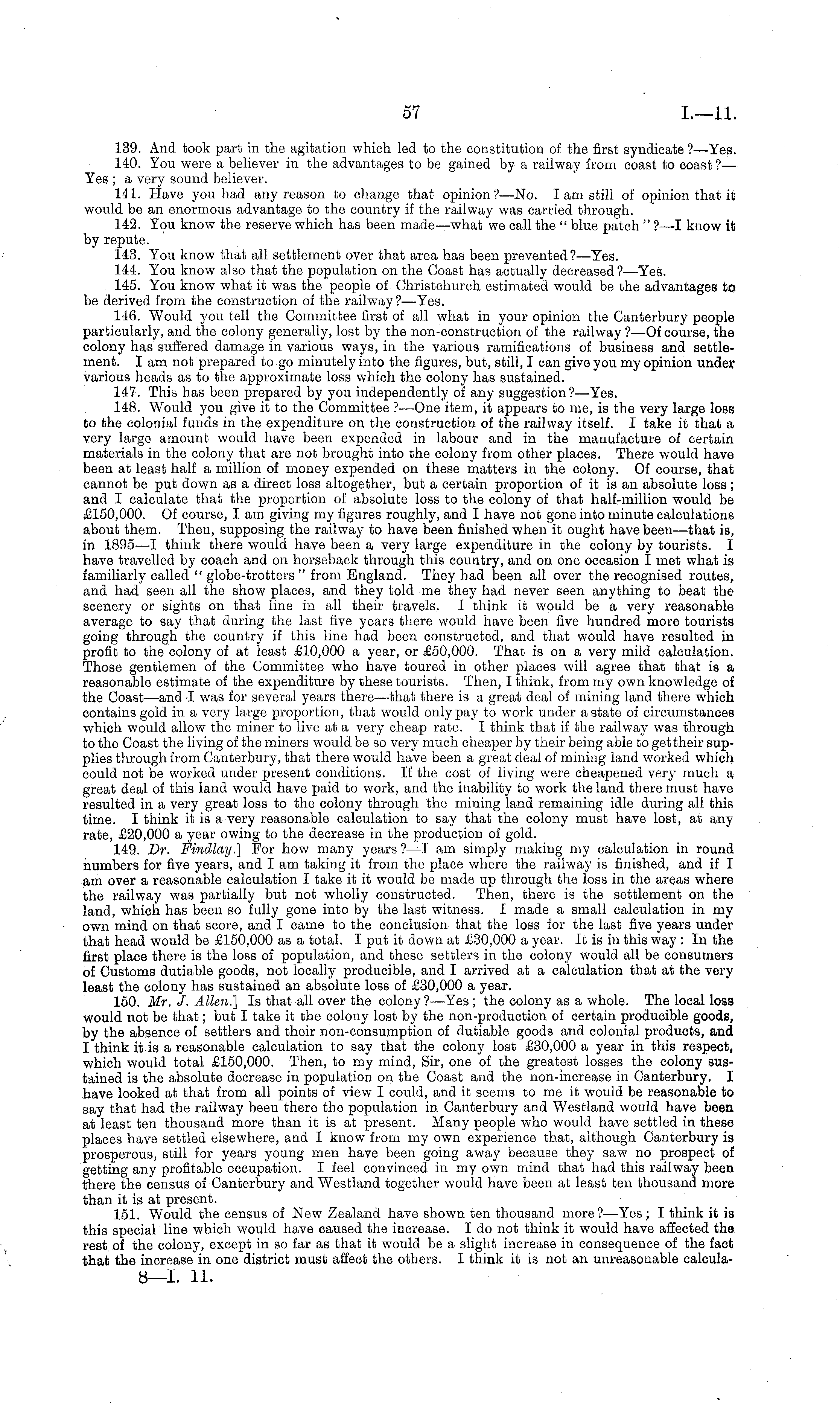 139. And took part in the agitation which led to the constitution of the first syndicate ?—Yes. 140. You were a believer in the advantages to be gained by a railway from coast to coast ?— Yes ; a very sound believer. 141. Have you had any reason to change that opinion?— No. I am still of opinion that it would be an enormous advantage to the country if the railway was carried through. 142. You know the reserve which has been made —what we call the " blue patch " ?—I know it by repute. 143. You know that all settlement over that area has been prevented?— Yes. 144. You know also that the population on the Coast has actually decreased?— Yes. 145. You know what it was the people of Christchurch estimated would be the advantages to be derived from the construction of the railway ?—Yes. 146. Would you tell the Committee first of all what in your opinion the Canterbury people particularly, and the colony generally, lost by the non-construction of the railway ? —Of course, the colony has suffered damage in various ways, in the various ramifications of business and settlement. lam not prepared to go minutely into the figures, but, still, I can give you my opinion under various heads as to the approximate loss which the colony has sustained. 147. This has been prepared by you independently of any suggestion?— Yes. 148. Would you give it to the Committee ?—One item, it appears to me, is the very large loss to the colonial funds in the expenditure on the construction of the railway itself. I take it that a very large amount would have been expended in labour and in the manufacture of certain materials in the colony that are not brought into the colony from other places. There would have been at least half a million of money expended on these matters in the colony. Of course, that cannot be put down as a direct loss altogether, but a certain proportion of it is an absolute loss; and I calculate that the proportion of absolute loss to the colony of that half-million would be £150,000. Of course, lam giving my figures roughly, and I have not gone into minute calculations about them. Then, supposing the railway to have been finished when it ought have been—that is, in 1895—1 think there would have been a very large expenditure in the colony by tourists. I have travelled by coach and on horseback through this country, and on one occasion I met what is familiarly called " globe-trotters" from England. They had been all over the recognised routes, and had seen all the show places, and they told me they had never seen anything to beat the scenery or sights on that line in all their travels. I think it would be a very reasonable average to say that during the last five years there would have been five hundred more tourists going through the country if this line had been constructed, and that would have resulted in profit to the colony of at least £10,000 a year, or £50,000. That is on a very mild calculation. Those gentlemen of the Committee who have toured in other places will agree that that is a reasonable estimate of the expenditure by these tourists. Then, I think, from my own knowledge of the Coast —and I was for several years there—that there is a great deal of mining land there which contains gold in a very large proportion, that would only pay to work under a state of circumstances which would allow the miner to live at a very cheap rate. I think that if the railway was through to the Coast the living of the miners would be so very much cheaper by their being able to get their supplies through from Canterbury, that there would have been a great deal of mining land worked which could not be worked under present conditions. If the cost of living were cheapened very much a great deal of this land would have paid to work, and the inability to work the land there must have resulted in a very great loss to the colony through the mining land remaining idle during all this time. I think it is a very reasonable calculation to say that the colony must have lost, at any rate, £20,000 a year owing to the decrease in the production of gold. 149. Dr. Findlay.] For how many years ?—I am simply making my calculation in round numbers for five years, and I am taking it from the place where the railway is finished, and if I am over a reasonable calculation I take it it would be made up through the loss in the areas where the railway was partially but not wholly constructed. Then, there is the settlement on the land, which has been so fully gone into by the last witness. I made a small calculation in my own mind on that score, and I came to the conclusion that the loss for the last five years under that head would be £150,000 as a total. I put it down at £30,000 a year. It is in this way :In the first place there is the loss of population, and these settlers in the colony would all be consumers of Customs dutiable goods, not locally producible, and I arrived at a calculation that at the very least the colony has sustained an absolute loss of £30,000 a year. 150. Mr. J. Allen.] Is that all over the colony? —Yes; the colony as a whole. The local loss would not be that; but I take it the colony lost by the non-production of certain producible goods, by the absence of settlers and their non-consumption of dutiable goods and colonial products, and I think it is a reasonable calculation to say that the colony lost £30,000 a year in this respect, which would total £150,000. Then, to my mind, Sir, one of the greatest losses the colony sustained is the absolute decrease in population on the Coast and the non-increase in Canterbury. I have looked at that from all points of view I could, and it seems to me it would be reasonable to say that had the railway been there the population in Canterbury and Westland would have been at least ten thousand more than it is at present. Many people who would have settled in these places have settled elsewhere, and I know from my own experience that, al