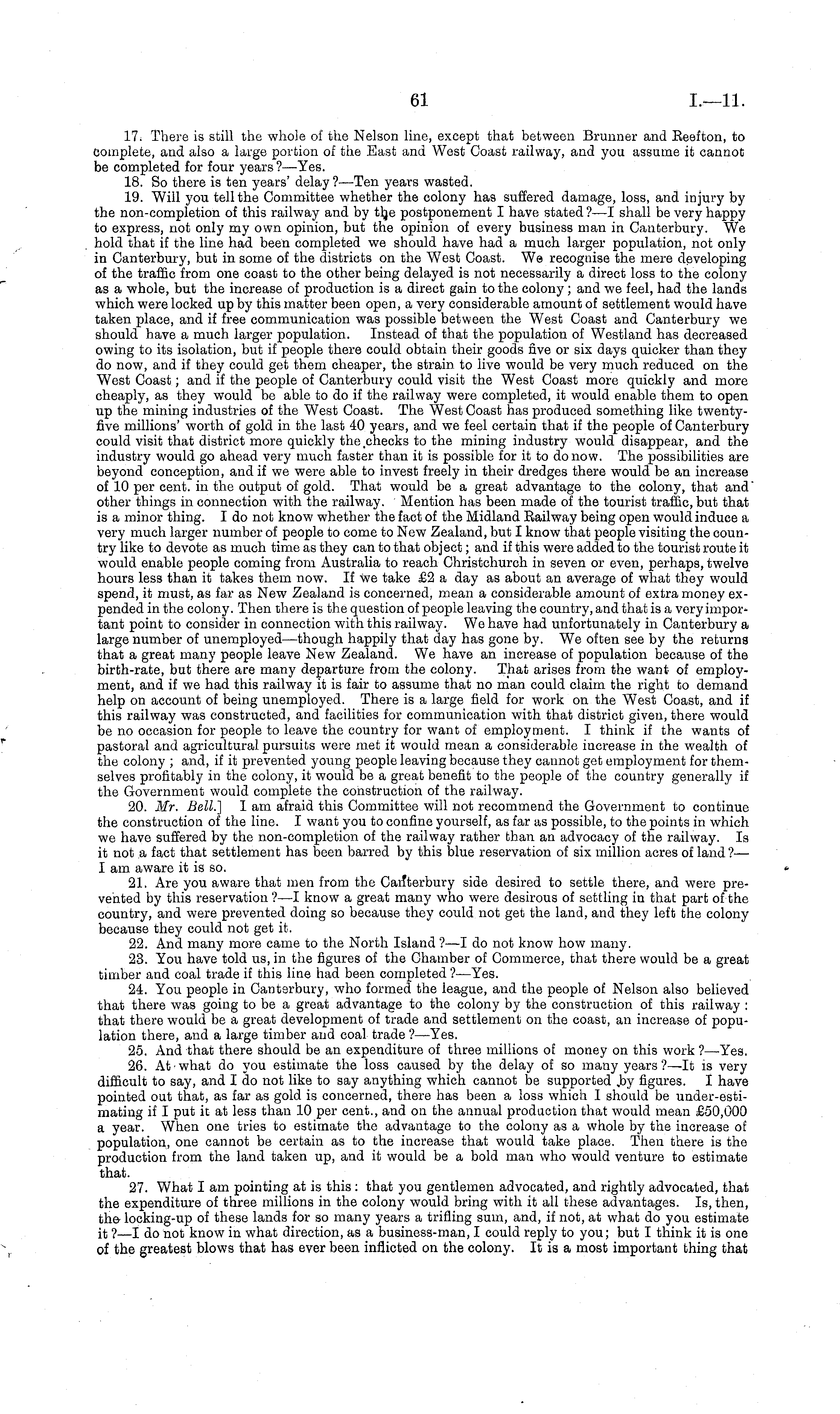 17; There is still the whole of the Nelson line, except that between Bruimer and Eeefton, to complete, and also a large portion of the East and West Coast railway, and you assume it cannot be completed for four years ? —Yes. 18. So there is ten years' delay? —Ten years wasted. 19. Will you tell the Committee whether the colony has suffered damage, loss, and injury by the non-completion of this railway and by the postponement I have stated ?—I shall be very happy to express, not only my own opinion, but the opinion of every business man in Canterbury. We hold that if the line had been completed we should have had a much larger population, not only in Canterbury, but in some of the districts on the West Coast. We recognise the mere developing of the traffic from one coast to the other being delayed is not necessarily a direct loss to the colony as a whole, but the increase of production is a direct gain to the colony; and we feel, had the lands which were locked up by this matter been open, a very considerable amount of settlement would have taken place, and if free communication was possible between the West Coast and Canterbury we should have a much larger population. Instead of that the population of Westland has decreased owing to its isolation, but if people there could obtain their goods five or six days quicker than they do now, and if they could get them cheaper, the strain to live would be very much reduced on the West Coast; and if the people of Canterbury could visit the West Coast more quickly and more cheaply, as they would be able to do if the railway were completed, it would enable them to open up the mining industries of the West Coast. The West Coast has produced something like twentyfive millions' worth of gold in the last 40 years, and we feel certain that if the people of Canterbury could visit that district more quickly the .cheeks to the mining industry would disappear, and the industry would go ahead very much faster than it is possible for it to do now. The possibilities are beyond conception, and if we were able to invest freely in their dredges there would be an increase of 10 per cent, in the output of gold. That would be a great advantage to the colony, that and other things in connection with the railway. Mention has been made of the tourist traffic, but that is a minor thing. Ido not know whether the fact of the Midland Railway being open would induce a very much larger number of people to come to New Zealand, but I know that people visiting the country like to devote as much time as they can to that object; and if this were added to the tourist route it would enable people coming from Australia to reach Christchurch in seven or even, perhaps, twelve hours less than it takes them now. If we take £2 a day as about an average of what they would spend, it must, as far as New Zealand is concerned, mean a considerable amount of extra money expended in the colony. Then there is the question of people leaving the country, and that is a very important point to consider in connection with this railway. We have had unfortunately in Canterbury a large number of unemployed—though happily that day has gone by. We often see by the returns that a great many people leave New Zealand. We have an increase of population because of the birth-rate, but there are many departure from the colony. That arises from the want of employment, and if we had this railway it is fair to assume that no man could claim the right to demand help on account of being unemployed. There is a large field for work on the West Coast, and if this railway was constructed, and facilities for communication with that district given, there would be no occasion for people to leave the country for want of employment. I think if the wants of pastoral and agricultural pursuits were met it would mean a considerable increase in the wealth of the colony ; and, if it prevented young people leaving because they cannot get employment for themselves profitably in the colony, it would be a great benefit to the people of the country generally if the Government would complete the construction of the railway. 20. Mr. Bell.] lam afraid this Committee will not recommend the Government to continue the construction of the line. I want you to confine yourself, as far as possible, to the points in which we have suffered by the non-completion of the railway rather than an advocacy of the railway. Is it not a fact that settlement has been barred by this blue reservation of six million acres of land ?— I am aware it is so. 21. Are you aware that men from the Canterbury side desired to settle there, and were prevented by this reservation ?—I know a great many who were desirous of settling in that part of the country, and were prevented doing so because they could not get the land, and they left the colony because they could not get it. 22. And many more came to the North Island ?—I do not know how many. 23. You have told us, in the figures of the Chamber of Commerce, that there would be a great timber and coal trade if this line had been completed ?—Yes. 24. You people in Canterbury, who formed the league, and the people of Nelson also believed that there was going to be a great advantage to the colony by the construction of this railway : that there would be a great development of trade and settlement on the coast, an increase of population there, and a large timber and coal trade ? —Yes. 25. And that there should be an expenditure of three millions of money on this work ?—Yes. 26. At what do you estimate the loss caused by the delay of so many years ?—lt is very difficult to say, and Ido not like to say anything which cannot be supported ,by figures. I have pointed out that, as far as gold is concerned, there has been a loss which I should be under-esti-mating if I put it at less than 10 per cent., and on the annual production that would mean £50,000 a year. When one tries to estimate the advantage to the col