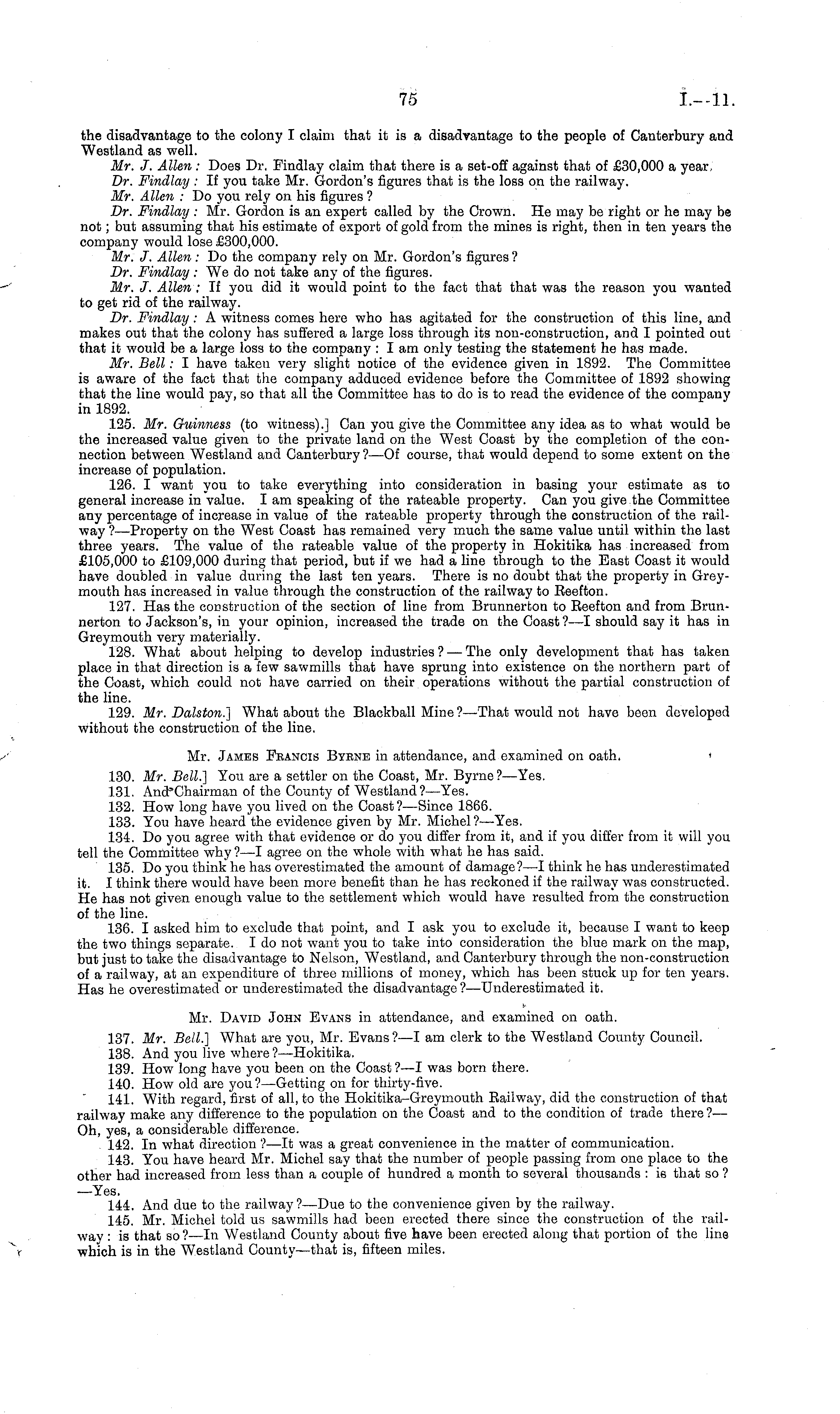 the disadvantage to the colony I claim that it is a disadvantage to the people of Canterbury and Westland as well. Mr. J. Allen : Does Dr. Findlay claim that there is a set-off against that of £30,000 a year. Dr. Findlay : If you take Mr. Gordon's figures that is the loss on the railway. Mr. Allen : Do you rely on his figures ? Dr. Findlay : Mr. Gordon is an expert called by the Crown. He may be right or he may be not; but assuming that his estimate of export of gold from the mines is right, then in ten years the company would lose £300,000. Mr. J. Allen: Do the company rely on Mr. Gordon's figures ? Dr. Findlay: We do not take any of the figures. Mr. J. Allen ; If you did it would point to the fact that that was the reason you wanted to get rid of the railway. Dr. Findlay: A witness comes here who has agitated for the construction of this line, and makes out that the colony has suffered a large loss through its non-construction, and I pointed out that it would be a large loss to the company : I am only testing the statement he has made. Mr. Bell: I have taken very slight notice of the evidence given in 1892. The Committee is aware of the fact that the company adduced evidence before the Committee of 1892 showing that the line would pay, so that all the Committee has to do is to read the evidence of the company in 1892. 125. Mr. Guinness (to witness).] Can you give the Committee any idea as to what would be the increased value given to the private land on the West Coast by the completion of the connection between Westland and Canterbury ?—Of course, that would depend to some extent on the increase of population. 126. I want you to take everything into consideration in basing your estimate as to general increase in value. lam speaking of the rateable property. Can you give the Committee any percentage of increase in value of the rateable property through the construction of the railway ?—Property on the West Coast has remained very much the same value until within the last three years. The value of the rateable value of the property in Hokitika has increased from £105,000 to £109,000 during that period, but if we had a line through to the East Coast it would have doubled in value during the last ten years. There is no doubt that the property in Greymouth has increased in value through the construction of the railway to Reef ton. 127. Has the construction of the section of line from Brunnerton to Eeefton and from Brunnerton to Jackson's, in your opinion, increased the trade on the Coast? —I should say it has in Greymouth very materially. 128. What about helping to develop industries ? — The only development that has taken place in that direction is a few sawmills that have sprung into existence on the northern part of the Coast, which could not have carried on their operations without the partial construction of the line. 129. Mr. Dalston.] What about the Blackball Mine ?—That would not have been developed without the construction of the line. Mr. Jambs Fbancis Bykne in attendance, and examined on oath. 130. Mr. Bell.] You are a settler on the Coast, Mr. Byrne? —Yes. 131. And' Chairman of the County of Westland?—Yes. 132. How long have you lived on the Coast? —Since 1866. 133. You have heard the evidence given by Mr. Michel?—Yes. 134. Do you agree with that evidence or do you differ from it, and if you differ from it will you tell the Committee why ? —I agree on the whole with what he has said. 135. Do you think he has overestimated the amount of damage? —I think he has underestimated it. I think there would have been more benefit than he has reckoned if the railway was constructed. He has not given enough value to the settlement which would have resulted from the construction of the line. 136. I asked him to exclude that point, and I ask you to exclude it, because I want to keep the two things separate. Ido not want you to take into consideration the blue mark on the map, but just to take the disadvantage to Nelson, Westland, and Canterbury through the non-construction of a railway, at an expenditure of three millions of money, which has been stuck up for ten years. Has he overestimated or underestimated the disadvantage?— Underestimated it. Mr. David John Evans in attendance, and examined on oath. 137. Mr. Bell.] What are you, Mr. Evans? —I am clerk to the Westland County Council. 138. And you live where? —Hokitika. 139. How long have you been on the Coast ?—I was born there. 140. How old are you?— Getting on for thirty-five. 141. With regard, first of all, to the Hokitika-Greymouth Railway, did the construction of that railway make any difference to the population on the Coast and to the condition of trade there ?— Oh, yes, a considerable difference. 142. In what direction ?—lt was a great convenience in the matter of communication. 143. You have heard Mr. Michel say that the number of people passing from one place to the other had increased from less than a couple of hundred a month to several thousands : is that so ? —Yes. 144. And due to the railway? —Due to the convenience given by the railway. 145. Mr. Michel told us sawmills had been erected there since the construction of the railway : is that so ?—ln Westland County about five have been erected along that portion of the line which is in the Westland County—that is, fifteen miles.