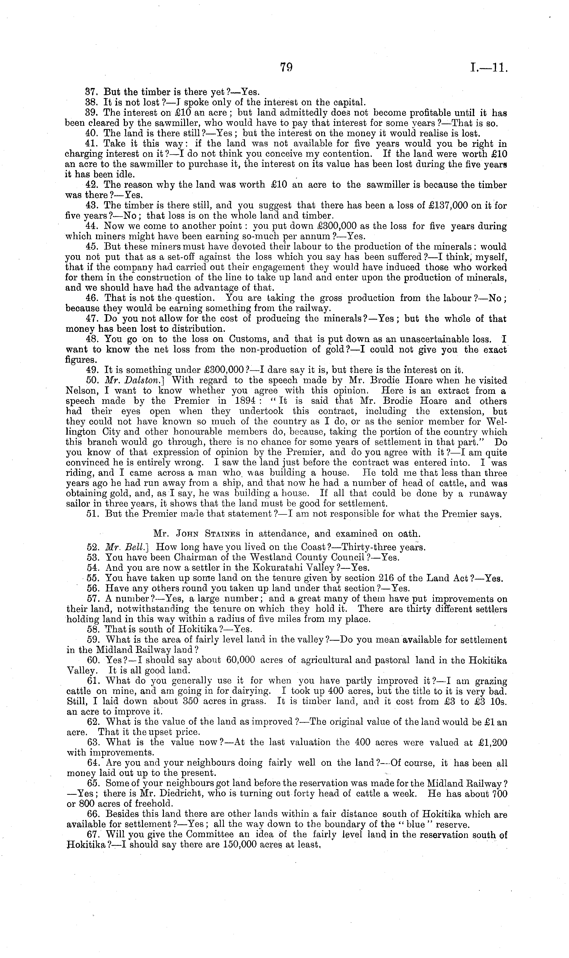 37. But the timber is there yet?— Yes. 38. It is not lost ? — J spoke only of the interest on the capital. 39. The interest on £10 an acre ; but land admittedly does not become profitable until it has been cleared by the sawmiller, who would have to pay that interest for some years ?—That is so. 40. The land is there still? —Yes; but the interest on the money it would realise is lost. 41. Take it this way: if the land was not available for five years would you be right in charging interest on it ?—I do not think you conceive my contention. If the land were worth £10 an acre to the sawmiller to purchase it, the interest on its value has been lost during the five years it has been idle. 42. The reason why the land was worth £10 an acre to the sawmiller is because the timber was there?— Yes. 43. The timber is there still, and you suggest that there has been a loss of £137,000 on it for five years ?- —No; that loss is on the whole land and timber, 44. Now we come to another point : you put down £300,000 as the loss for five years during which miners might have been earning so-much per annum ? —Yes. 45. But these miners must have devoted their labour to the production of the minerals ; would you not put that as a set-off against the loss which you say has been suffered ? —I think, myself, that if the company had carried out their engagement they would have induced those who worked for them in the construction of the line to take up land and enter upon the production of minerals, and we should have had the advantage of that. 46. That is not the question. You are taking the gross production from the labour ? —No; because they would be earning something from the railway. 47. Do you not allow for the cost of producing the minerals? —Yes; but the whole of that money has been lost to distribution. 48. You go on to the loss on Customs, and that is put down as an unascertainable loss. I want to know the net loss from the non-production of gold?—I could not give you the exact figures. 49. It is something under £300,000 ?—I dare say it is, but there is the interest on it. 50. Mr. Dalston.} With regard to the speech made by Mr. Brodie Hoare when he visited Nelson, I want to know whether you agree with this opinion. Here is an extract from a speech made by the Premier in 1894 : "It is said that Mr. Brodie Hoare and others had their eyes open when they undertook this contract, including the extension, but they could not have known so much of the country as I do, or as the senior member for Wellington City and other honourable members do, because, taking the portion of the country which this branch would go through, there is no chance for some years of settlement in that part." Do you know of that expression of opinion by the Premier, and do you agree with it ?—I am quite convinced he is entirely wrong. I saw the land just before the contract was entered into. I was riding, and I came across a man who. was building a house. He told me that less than three years ago he had run away from a ship, and that now he had a number of head of cattle, and was obtaining gold, and, as I say, he was building a house. If all that could be done by a runaway sailor in three years, it shows that the land must be good for settlement. 51. But the Premier made that statement ?—I am not responsible for what the Premier says. Mr. John Staines in attendance, and examined on oath. 52. Mr. Bell.] How long have you lived on the Coast ?—Thirty-three years. 53. You have been Chairman of the Westland County Council ? —Yes. 54. And you are now a settler in the Kokuratahi Valley ?—Yes. 55. You have taken up some land on the tenure given by section 216 of the Land Act ? —-Yes. 56. Have any others round you taken up land under that section ? —Yes. 57. A number?— Yes, a large number; and a great many of them have put improvements on their land, notwithstanding the tenure on which they hold it. There are thirty different settlers holding land in this way within a radius of five miles from my place. 58. That is south of Hokitika?—Yes. 59. What is the area of fairly level land in the valley?—Do you mean available for settlement in the Midland Eailway land ? 60. Yes?—l should say about 60,000 acres of agricultural and pastoral land in the Hokitika Valley. It is all good land. 61. What do you generally use it for when you have partly improved it?—l am grazing cattle on mine, and am going in for dairying. I took up 400 acres, but the title to it is very bad. Still, I laid down about 350 acres in grass. It is timber land, and it cost from £3 to £3 10s. an acre to improve it. 62. What is the value of the land as improved ?—The original value of the land would be £1 an acre. That it the upset price. 63. What is the value now? —At the last valuation the 400 acres were valued at £1,200 with improvements. 64. Are you and your neighbours doing fairly well on the land?—Of course, it has been all money laid out up to the present. 65. Some of your neighbours got land before the reservation was made for the Midland Eailway ? —Yes; there is Mr. Diedricht, who is turning out forty head of cattle a week. He has about 700 or 800 acres of freehold. 66. Besides this land there are other lands within a fair distance south of Hokitika which are available for settlement ? —Yes; all the way down to the boundary of the " blue " reserve. 67. Will you give the Committee an idea of the fairly level land in the reservation south of Hokitika?—l should say there are 150,000 acres at least.