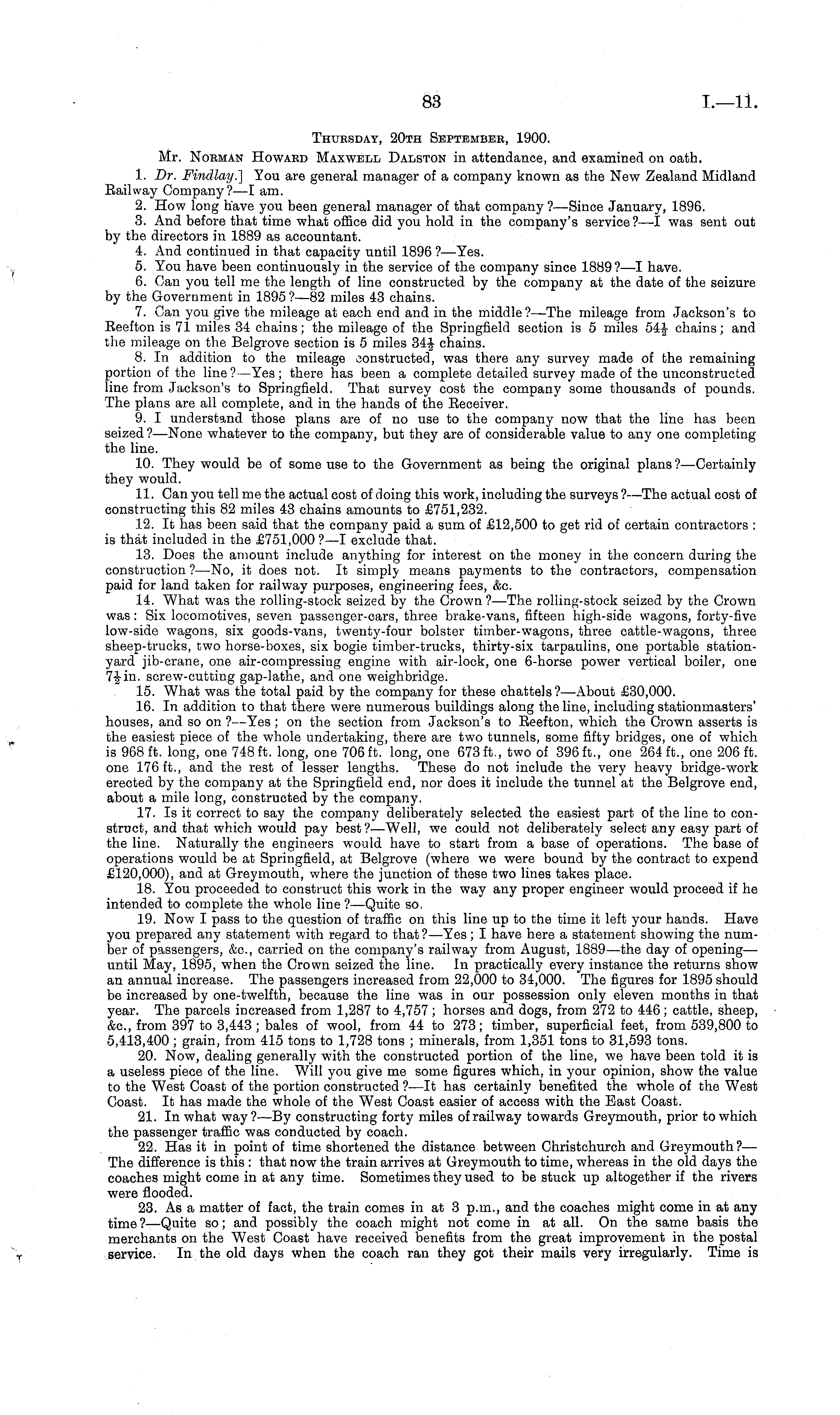 Thursday, 20th September, 1900. Mr. Norman Howard Maxwell DAlston in attendance, and examined on oath. 1. Dr. Find-lay.] You are general manager of a company known as the New Zealand Midland Railway Company?—l am. 2. How long have you been general manager of that company ?—Since January, 1896. 3. And before that time what office did you hold in the company's service?—l was sent out by the directors in 1889 as accountant. 4. And continued in that capacity until 1896 ? —Yes. 5. You have been continuously in the service of the company since 1889?— I have. 6. Can you tell me the length of line constructed by the company at the date of the seizure by the Government in 1895 ?—B2 miles 43 chains. 7. Can you give the mileage at each end and in the middle?— The mileage from Jackson's to Reefton is 71 miles 34 chains; the mileage of the Springfield section is 5 miles 54J chains; and the mileage on the Belgrove section is 5 miles 34J chains. 8. In addition to the mileage constructed, was there any survey made of the remaining portion of the line ?—Yes; there has been a complete detailed survey made of the unconstructed line from Jackson's to Springfield. That survey cost the company some thousands of pounds. The plans are all complete, and in the hands of the Receiver. 9. I understand those plans are of no use to the company now that the line has been seized ?—None whatever to the company, but they are of considerable value to any one completing the line. 10. They would be of some use to the Government as being the original plans ?—Certainly they would. 11. Can you tell me the actual cost of doing this work, including the surveys ?—The actual cost of constructing this 82 miles 43 chains amounts to £751,232. 12. It has been said that the company paid a sum of £12,500 to get rid of certain contractors : is that included in the £751,000?— I exclude that. 13. Does the amount include anything for interest on the money in the concern during the construction ?—No, it does not. It simply means payments to the contractors, compensation paid for land taken for railway purposes, engineering fees, &c. 14. What was the rolling-stock seized by the Crown ?—The rolling-stock seized by the Crown was : Six locomotives, seven passenger-cars, three brake-vans, fifteen high-side wagons, forty-five low-side wagons, six goods-vans, twenty-four bolster timber-wagons, three cattle-wagons, three sheep-trucks, two horse-boxes, six bogie timber-trucks, thirty-six tarpaulins, one portable stationyard jib-crane, one air-compressing engine with air-lock, one 6-horse power vertical boiler, one 7f in. screw-cutting gap-lathe, and one weighbridge. 15. What was the total paid by the company for these chattels?—' About £30,000. 16. In addition to that there were numerous buildings along the line, including stationmasters' houses, and so on ?—Yes; on the section from Jackson's to Eeefton, which the Crown asserts is the easiest piece of the whole undertaking, there are two tunnels, some fifty bridges, one of which is 968 ft. long, one 748 ft. long, one 706 ft. long, one 673 ft., two of 396 ft., one 264 ft., one 206 ft. one 176 ft., and the rest of lesser lengths. These do not include the very heavy bridge-work erected by the company at the Springfield end, nor does it include the tunnel at the Belgrove end, about a mile long, constructed by the company. 17. Is it correct to say the company deliberately selected the easiest part of the line to construct, and that which would pay best?— Well, we could not deliberately select any easy part of the line. Naturally the engineers would have to start from a base of operations. The base of operations would be at Springfield, at Belgrove (where we were bound by the contract to expend £120,000), and at Greymouth, where the junction of these two lines takes place. 18. You proceeded to construct this work in the way any proper engineer would proceed if he intended to complete the whole line ?—Quite so, 19. Now I pass to the question of traffic on this line up to the time it left your hands. Have you prepared any statement with regard to that ?—Yes ; I have here a statement showing the number of passengers, &c, carried on the company's railway from August, 1889—the day of opening— until May, 1895, when the Crown seized the line. In practically every instance the returns show an annual increase. The passengers increased from 22,000 to 34,000. The figures for 1895 should be increased by one-twelfth, because the line was in our possession only eleven months in that year. The parcels increased from 1,287 to 4,757 ; horses and dogs, from 272 to 446; cattle, sheep, &c, from 397 to 3,443 ; bales of wool, from 44 to 273; timber, superficial feet, from 539,800 to 5,413,400; grain, from 415 tons to 1,728 tons ; minerals, from 1,351 tons to 31,593 tons. 20. Now, dealing generally with the constructed portion of the line, we have been told it is a useless piece of the line. Will you give me some figures which, in your opinion, show the value to the West Coast of the portion constructed ?—lt has certainly benefited the whole of the West Coast. It has made the whole of the West Coast easier of access with the East Coast. 21. In what way?—By constructing forty miles of railway towards Greymouth, prior to which the passenger traffic was conducted by coach. 22. Has it in point of time shortened the distance between Christchurch and Greymouth?— The difference is this : that now the train arrives at Greymouth to time, whereas in the old days the coaches might come in at any time. Sometimes they used to be stuck up altogether if the rivers were flooded. 23. As a matter of fact, the train comes in at 3 p.m., and the coaches might come in at any time ?—Quite so; and possibly the coach might not come in at all. On the same basis the merchants on the West Coast have received benefits from the great improvement in the postal service. In the old days when the coach ran t