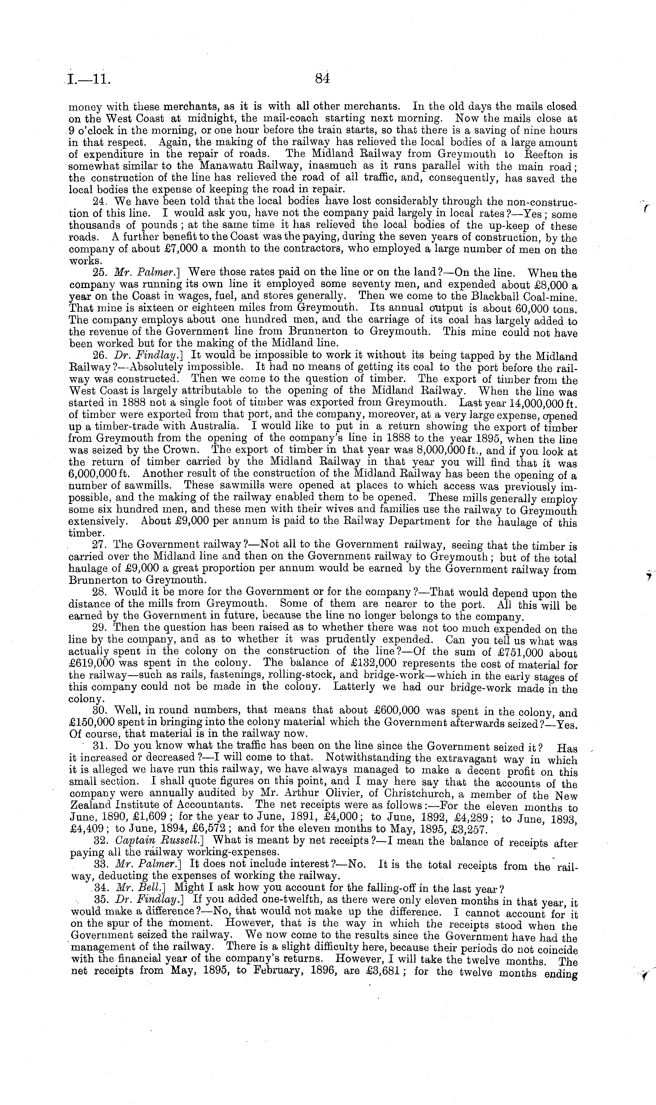 money with these merchants, as it is with all other merchants. In the old days the mails closed on the West Coast at midnight, the mail-coach starting next morning. Now the mails close at 9 o'clock in the morning, or one hour before the train starts, so that there is a saving of nine hours in that respect. Again, the making of the railway has relieved the local bodies of a large amount of expenditure in the repair of roads. The Midland Bail way from Greymouth to Eeefton is somewhat similar to the Manawatu Eailway, inasmuch as it runs parallel with the main road; the construction of the line has relieved the road of all traffic, and, consequently, has saved the local bodies the expense of keeping the road in repair. 24. We have been told that the local bodies have lost considerably through the non-construc-tion of this line. I would ask you, have not the company paid largely in local rates ? —Yes ; some thousands of pounds ; at the same time it has relieved the local bodies of the up-keep of these roads. A further benefit to the Coast was the paying, during the seven years of construction, by the company of about £7,000 a month to the contractors, who employed a large number of men on the works. 25. Mr. Palmer.] Were those rates paid on the line or on the land?—On the line. When the company was running its own line it employed some seventy men, and expended about £8,000 a year on the Coast in wages, fuel, and stores generally. Then we come to the Blackball Coal-mine. That mine is sixteen or eighteen miles from Greymouth. Its annual output is about 60,000 tons. The company employs about one hundred men, and the carriage of its coal has largely added to the revenue of the Government line from Brunnerton to Greymouth. This mine could not have been worked but for the making of the Midland line. 26. Dr. Findlay.] It would be impossible to work it without its being tapped by the Midland Eailway?—Absolutely impossible. It had no means of getting its coal to the port before the railway was constructed. Then we come to the question of timber. The export of timber from the West Coast is largely attributable to the opening of the Midland Eailway. When the line was started in 1888 not a single foot of timber was exported from Greymouth. Last year 14,000,000 ft. of timber were exported from that port, and the company, moreover, at a very large expense, opened up a timber-trade with Australia. I would like to put in a return showing the export of timber from Greymouth from the opening of the company's line in 1888 to the year 1895, when the line was seized by the Crown. The export of timber in that year was 8,000,000 ft., and if you look at the return of timber carried by the Midland Eailway in that year you will find that it was 6,000,000 ft. Another result of the construction of the Midland Eailway has been the opening of a number of sawmills. These sawmills were opened at places to which access was previously impossible, and the making of the railway enabled them to be opened. These mills generally employ some six hundred men, and these men with their wives and families use the railway to Greymouth extensively. About £9,000 per annum is paid to the Eailway Department for the haulage of this timber. 27. The Government railway?— Not all to the Government railway, seeing that the timber is carried over the Midland line and then on the Government railway to Greymouth; but of the total haulage of £9,000 a great proportion per annum would be earned by the Government railway from Brunnerton to Greymouth. 28. Would it be more for the Government or for the company?— That would depend upon the distance of the mills from Greymouth. Some of them are nearer to the port. AH this will be earned by the Government in future, because the line no longer belongs to the company. 29. Then the question has been raised as to whether there was not too much expended on the line by the company, and as to whether it was prudently expended. Can you tell us what was actually spent in the colony on the construction of the line?—Of the sum of £751,000 about £619,000 was spent in the colony. The balance of £132,000 represents the cost of material for the railway—such as rails, fastenings, rolling-stock, and bridge-work—which in the early stages of this company could not be made in the colony. Latterly we had our bridge-work made in the colony. 30. Well, in round numbers, that means that about £600,000 was spent in the colony, and £150,000 spent in bringing into the colony material which the Government afterwards seized?— Yes. Of course, that material is in the railway now. 31. Do you know what the traffic has been on the line since the Government seized it? Has it increased or decreased ?—I will come to that. Notwithstanding the extravagant way in which it is alleged we have run this railway, we have always managed to make a decent profit on this small section. I shall quote figures on this point, and I may here say that the accounts of the company were annually audited by Mr. Arthur Olivier, of Christchurch, a member of the New Zealand" Institute of Accountants. The net receipts were as follows :—For the eleven months to June, 1890, £1,609; for the year to June, 1891, £4,000; to June, 1892, £4,289; to June 1893 £4,409; to June, 1894, £6,572 ; and for the eleven months to May, 1895, £3,257. 32. Captain Russell] What is meant by net receipts ?—I mean the balance of receipts after paying all the railway working-expenses. 33. Mr. Palmer.] It does not include interest ?—No. It is the total receipts from the railway, deducting the expenses of working the railway. . 34. Mr. Bell.] Might I ask how you account for the falling-off in the last year ? 35. Dr. Findlay.] If you added one-twelfth, as there were only eleven months in that year, it would make a difference?—No, that would not make up the difference. I cannot account for it on the spur of the moment. However, that is the way in which the re