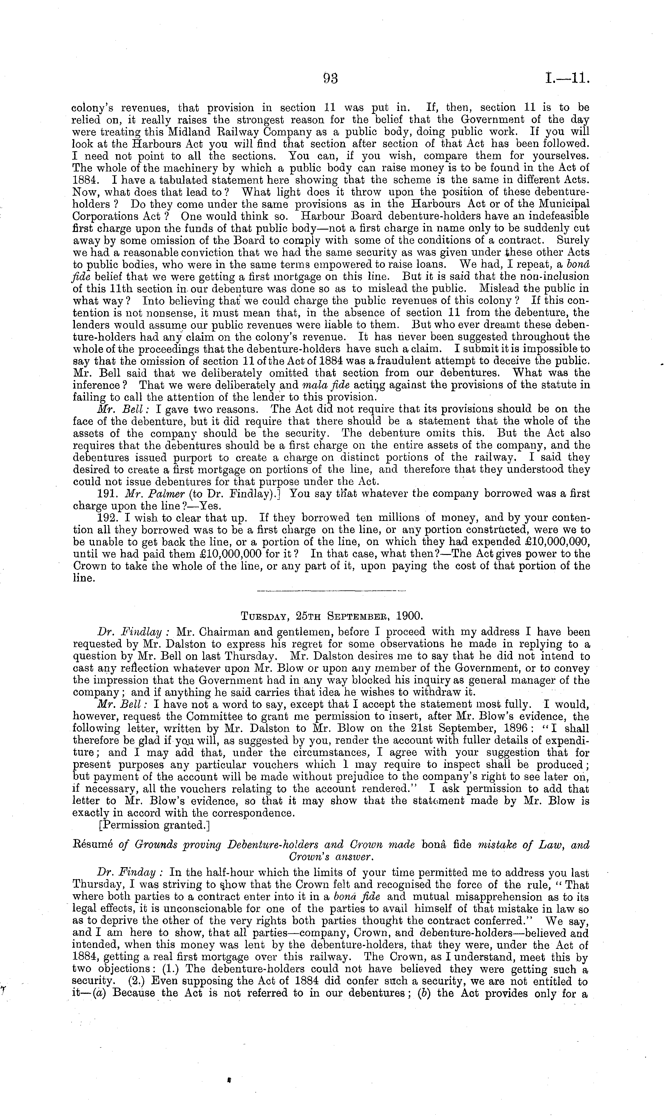 Tuesday, 25th September, 1900. Dr. Findlay : Mr. Chairman and gentlemen, before I proceed with my address I have been requested by Mr. Dalston to express his regret for some observations he made in replying to a question by Mr. Bell on last Thursday. Mr. Dalston desires me to say that he did not intend to cast any reflection whatever upon Mr. Blow or upon any member of the Government, or to convey the impression that the Government had in any way blocked his inquiry as general manager of the company; and if anything he said carries that idea he wishes to withdraw it. Mr. Bell: I have not a word to say, except that I accept the statement most fully. I would, however, request the Committee to grant me permission to insert, after Mr. Blow's evidence, the following letter, written by Mr. Dalston to Mr. Blow on the 21st September, 1896 : " I shall therefore be glad if you will, as suggested by you, render the account with fuller details of expenditure ; and I may add that, under the circumstances, I agree with your suggestion that for present purposes any particular vouchers which 1 may require to inspect shall be produced ; but payment of the account will be made without prejudice to the company's right to see later on, if necessary, all the vouchers relating to the account rendered." I ask permission to add that letter to Mr. Blow's evidence, so that it may show that the statement made by Mr. Blow is exactly in accord with the correspondence. [Permission granted.] Besume of Grounds proving Debenture-holders and Crown made bona fide mistake of Law, and Grown s answer. Dr. Finday : In the half-hour which the limits of your time permitted me to address you last Thursday, I was striving to s.how that the Crown felt and recognised the force of the rule, " That where both parties to a contract enter into it in a bond fide and mutual misapprehension as to its legal effects, it is unconscionable for one of the parties to avail himself of that mistake in law so as to deprive the other of the very rights both parties thought the contract conferred." We say, and I am here to show, that all parties—company, Crown, and debenture-holders—believed and intended, when this money was lent by the debenture-holders, that they were, under the Act of 1884, getting a real first mortgage over this railway. The Crown, as I understand, meet this by two objections: (1.) The debenture-holders could not have believed they were getting such a security. (2.) Even supposing the Act of 1884 did confer such a security, we are not entitled to it—(a.) Because the Act is not referred to in our debentures; (b) the Act provides only for a