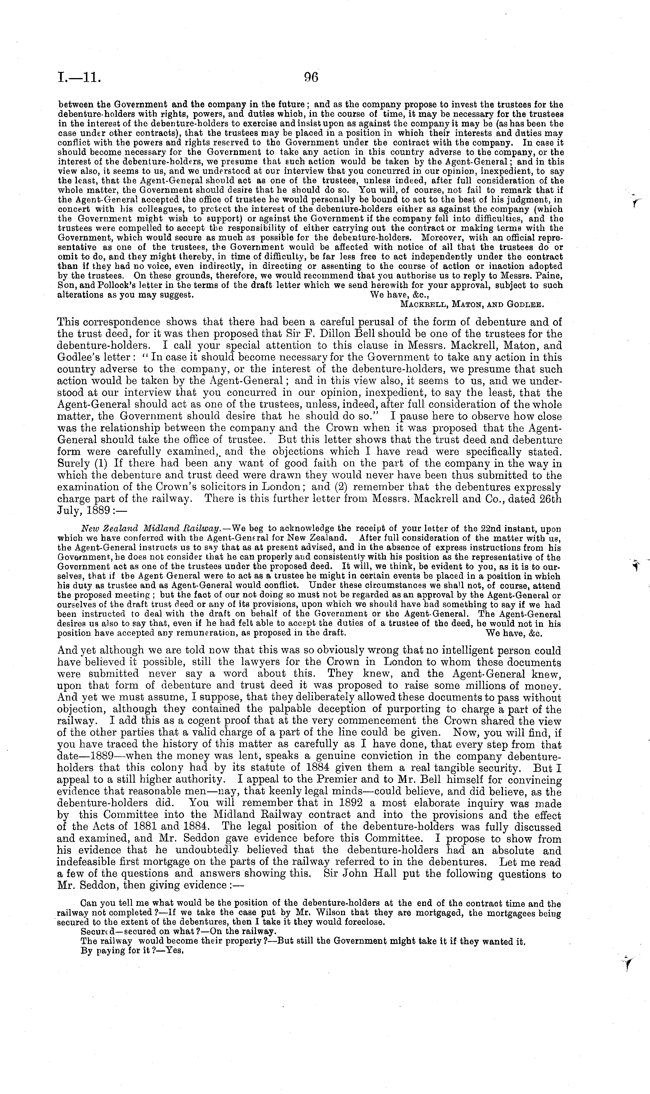 between the Government and the oompany in the future ; and as the company propose to invest the trustees for the debenture-holders with rights, powers, and duties whiota, in the course of time, it may be necessary for the trustees in the interest of the debenture-holders to exercise and insist upon as against the company it may be (as has been the case under other contracts), that the trustees may be placed in a position in whioh their interests and duties may conflict with the powers and rights reserved to the Government under the contract with the company. In case it should become necessary for the Government to take any action in this country adverse to the company, or the interest of the debenture-holders, we presume that such action would be taken by the Agent-General; and in this view also, it seems to us, and we understood at our interview that you concurred in our opinion, inexpedient, to say the least, that the Agent-General should aot as one of the trustees, unless indeed, after full consideration of the whole matter, the Government should desire that he should do so. You will, of course, not fail to remark that if the Agent-General accepted the office of trustee he would personally be bound to act to the best of his judgment, in concert with his colleagues, to protect the interest of the debenture-holders either as against the company (which the Government might wish to support) or against the Government if the company fell into difficulties, and the trustees were compelled to accept tbe responsibility of either carrying out the contract or making terms with the Government, which would secure as much as possible for the debenture-holders. Moreover, with an official representative as one of the trustees, the Government would be affected with notice of all that the trustees do or omit to do, and they might thereby, in time of difficulty, be far less free to act independently under the contract than if they had no voice, even indirectly, in directing or assenting to the course of action or inaotion adopted by the trustees. On these grounds, therefore, we would recommend that you authorise us to reply to Messrs. Paine, Son, and Pollock's letter in the terms of the draft letter which we send herewith for your approval, subject to suoh alterations as you may suggest. We have, &c, Mackreli,, Maton, and Godlke. This correspondence shows that there had been a careful perusal of the form of debenture and of the trust deed, for it was then proposed that Sir F. Dillon Bell should be one of the trustees for the debenture-holders. I call your special attention to this clause in Messrs. Mackreli, Maton, and Godlee's letter : " In ease it should become necessary for the Government to take any action in this country adverse to the company, or the interest of the debenture-holders, we presume that such action would be taken by the Agent-General; and in this view also, it seems to us, and we understood at our interview that you concurred in our opinion, inexpedient, to say the least, that the Agent-General should act as one of the trustees, unless, indeed, after full consideration of the whole matter, the Government should desire that he should do so." I pause here to observe how close was the relationship between the company and the Crown when it was proposed that the AgentGeneral should take the office of trustee. But this letter shows that the trust deed and debenture form were carefully examined,, and the objections which I have read were specifically stated. Surely (1) If there had been any want of good faith on the part of the company in the way in which the debenture and trust deed were drawn they would never have been thus submitted to the examination of the Crown's solicitors in London; and (2) remember that the debentures expressly charge part of the railway. There is this further letter from Messrs. Mackreli and Co., dated 26th July, 1889 :— New Zealand Midland Railway. —We beg to acknowledge the receipt of your letter of the 22nd instant, upon which we have conferred with the Agent-General for New Zealand. After full consideration of the matter with us, the Agent-General instructs us to say that as at present advised, and in the absence of express instructions from his Government, he does not consider that he can properly and consistently with his position as the representative of the Government act as one of the trustees under the proposed deed. It will, we think, be evident to you, as it is to ourselves, that if tbe Agent General were to act as a trustee he might in certain events be placed in a position in whioh his duty as trustee and as Agent-General would conflict. Under these circumstances we shall not, of course, attend the proposed meeting ; but the faot of our not doing so must not be regarded as an approval by the Agent-General or ourselves of the draft trust deed or any of its provisions, upon whioh we should have had something to say if we had been instructed to deal with the draft on behalf of the Government or the Agent-General. The Agent-General desires us also to say that, even if he had felt able to accept the duties of a trustee of the deed, he would not in his position have accepted any remuneration, as proposed in the draft. We have, &c. And yet although we are told now that this was so obviously wrong that no intelligent person could have believed it possible, still the lawyers for the Crown in London to whom these documents were submitted never say a word about this. They knew, and the Agent-General knew, upon that form of debenture and trust deed it was proposed to raise some millions of money. And yet we must assume, I suppose, that they deliberately allowed these documents to pass without objection, although they contained the palpable deception of purporting to charge a part of the railway. I add this as a cogent proof that at the very commencement the Crown shared the view of the other parties that a valid charge of a part of the line could be given. N