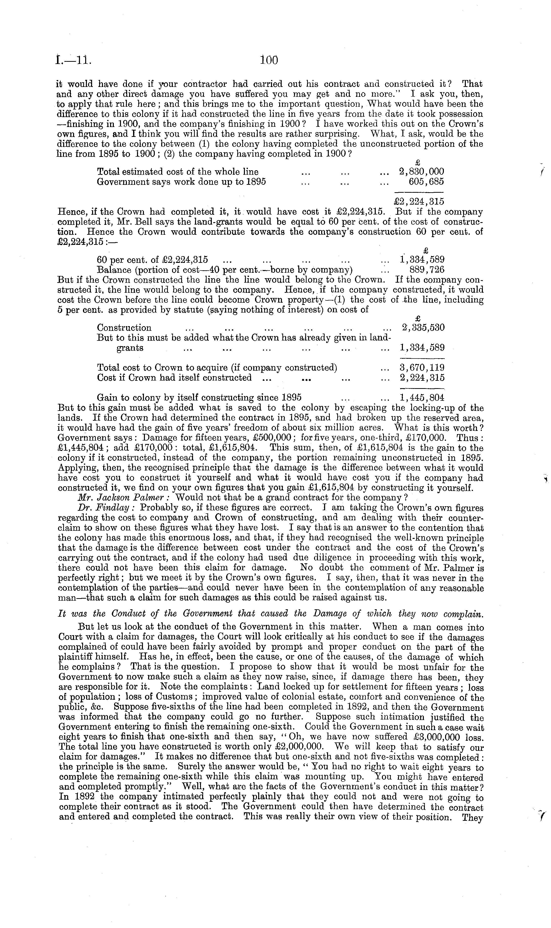 it would have done if your contractor had carried out his contract and constructed it? That and any other direct damage you have suffered you may get and no more." I ask you, then, to apply that rule here ; and this brings me to the important question, What would have been the difference to this colony if it had constructed the line in five years from the date it took possession —finishing in 1900, and the company's finishing in 1900 ? I have worked this out on the Crown's own figures, and I think you will find the results are rather surprising. What, I ask, would be the difference to the colony between (1) the colony having completed the unconstructed portion of the line from 1895 to 1900 ; (2) the company having completed in 1900 ? & Total estimated cost of the whole line ... ... ... 2,830,000 Government says work done up to 1895 ... ... ... 605,685 £2,224,315 Hence, if the Crown had completed it, it would have cost it £2,224,315. But if the company completed it, Mr. Bell says the land-grants would be equal to 60 per cent, of the cost of construction. Hence the Crown would contribute towards the company's construction 60 per ceut. of £2,224,315 :— £ 60 per cent, of £2,224,315 ... ... ... ... ... 1,334,589 Balance (portion of cost—4o per cent.—borne by company) ... 889,726 But if the Crown constructed the line the line would belong to the Crown. If the company constructed it, the line would belong to the company. Hence, if the company constructed, it would cost the Crown before the line could become Crown property—(l) the cost of the line, including 5 per cent, as provided by statute (saying nothing of interest) on cost of £ Construction ... ... ... ... ... ... 2,335,530 But to this must be added what the Crown has already given in landgrants ... ... ... ... ... ... 1,334,589 Total cost to Crown to acquire (if company constructed) ... 3,670,119 Cost if Crown had itself constructed ... ... ... ... 2,224,315 Gain to colony by itself constructing since 1895 ... ... 1,445,804 But to this gain must be added what is saved to the colony by escaping the locking-up of the lands. If the Crown had determined the contract in 1895, and had broken up the reserved area, it would have had the gain of five years' freedom of about six million acres. What is this worth? Government says : Damage for fifteen years, £500,000; for five years, one-third, £170,000. Thus : £1,445,804 ; add £170,000 : total, £1,615,804. This sum, then, of £1,615,804 is the gain to the colony if it constructed, instead of the company, the portion remaining unconstructed in 1895. Applying, then, the recognised principle that the damage is the difference between what it would have cost you to construct it yourself and what it would have cost you if the company had constructed it, we find on your own figures that you gain £1,615,804 by constructing it yourself. Mr. Jackson Palmer : Would not that be a grand contract for the company ? Dr. Findlay : Probably so, if these figures are correct. I am taking the Crown's own figures regarding the cost to company and Crown of constructing, and am dealing with their counterclaim to show on these figures what they have lost. I say that is an answer to the contention that the colony has made this enormous loss, and that, if they had recognised the well-known principle that the damage is the difference between cost under the contract and the cost of the Crown's carrying out the contract, and if the colony had used due diligence in proceeding with this work, there could not have been this claim for damage. No doubt the comment of Mr. Palmer is perfectly right; but we meet it by the Crown's own figures. I say, then, that it was never in the contemplation of the parties—and could never have been in the contemplation of any reasonable man —that such a claim for such damages as this could be raised against us. It was the Conduct of the Government that caused the Damage of which they now complain. But let us look at the conduct of the Government in this matter. When a man comes into Court with a claim for damages, the Court will look critically at his conduct to see if the damages complained of could have been fairly avoided by prompt and proper conduct on the part of the plaintiff himself. Has he, in effect, been the cause, or one of the causes, of the damage of which he complains? That is the question. I propose to show that it would be most unfair for the Government to now make such a claim as they now raise, since, if damage there has been, they are responsible for it. Note the complaints : Land locked up for settlement for fifteen years ; loss of population ; loss of Customs; improved value of colonial estate, comfort and convenience of the public, &c. Suppose five-sixths of the line had been completed in 1892, and then the Government was informed that the company could go no further. Suppose such intimation justified the Government entering to finish the remaining one-sixth. Could the Government in such a case wait eight years to finish that one-sixth and then say, "Oh, we have now suffered £3,000,000 loss. The total line you have constructed is worth only £2,000,000. We will keep that to satisfy our claim for damages." It makes no difference that but one-sixth and not five-sixths was completed: the principle is the same. Surely the answer would be, " You had no right to wait eight years to complete the remaining one-sixth while this claim was mounting up. You might have entered and completed promptly." Well, what are the facts of the Government's conduct in this matter? In 1892 the company intimated perfectly plainly that they could not and were not going to complete their contract as it stood. The Government could then have determined the contract and entered and completed the contract. This was really their own view of their position. They
