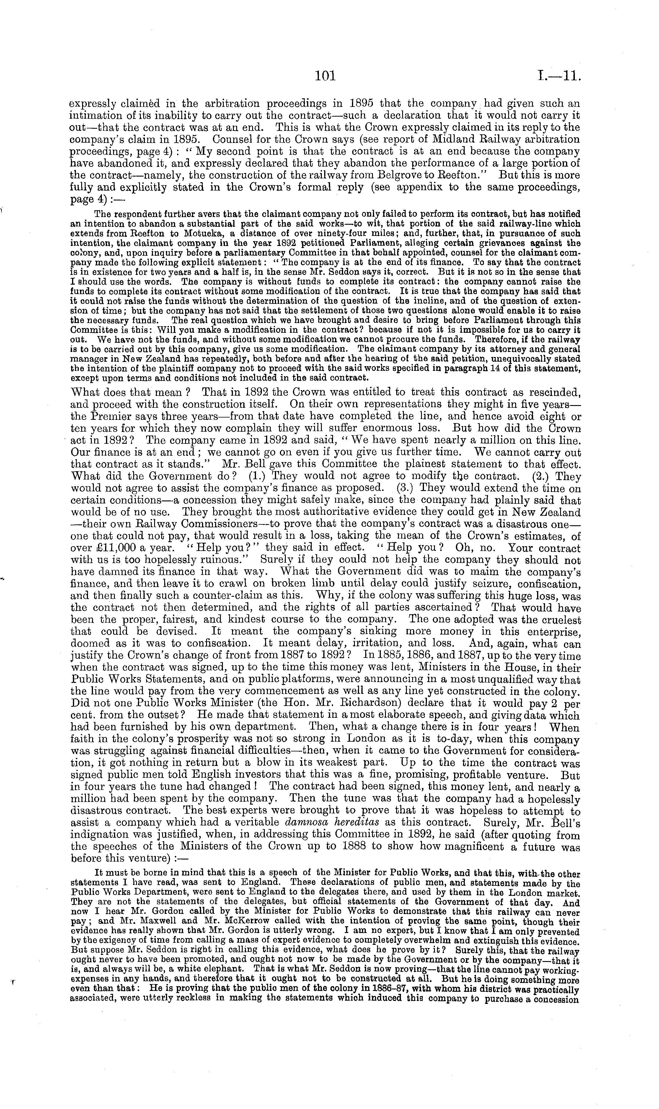 expressly claimed in the arbitration proceedings in 1895 that the company had given such an intimation of its inability to carry out the contract —such a declaration that it would not carry it out—that the contract was at an end. This is what the Crown expressly claimed in its reply to the company's claim in 1895. Counsel for the Crown says (see report of Midland Railway arbitration proceedings, page 4) : " My second point is that the contract is at an end because the company have abandoned it, and expressly declared that they abandon the performance of a large portion of the contract —namely, the construction of the railway from Belgrove to Reef ton." But this is more fully and explicitly stated in the Crown's formal reply (see appendix to the same proceedings, page 4) :— The respondent further avers that the claimant company not only failed to perform its oontraot, but has notified an intention to abandon a substantial part of the said works —to wit, that portion of the said railway-line which extends from Reefton to Motueka, a distance of over ninety-four miles; and, further, that, in pursuanoe of such intention, the claimant company in the year 1892 petitioned Parliament, alleging certain grievanoes against the colony, and, upon inquiry before a parliamentary Committee in that behalf appointed, counsel for the claimant oompany made the following explicit statement: " The company is at the end of its finance. To say that the contract is in existence for two years and a half is, in the sense Mr. Seddon says it, correct. But it is not so in the sense that I should use the words. The oompany is without funds to oomplete its contract: the oompany cannot raise the funds to complete its contract without some modification of the contract. It is true that the oompany has said that it could not raise the funds without the determination of the question of the incline, and of the question of extension of time ; but the company has not said that the settlement of those two questions alone would enable it to raise the necessary funds. The real question which we have brought and desire to bring before Parliament through this Committee is this: Will you make a modification in the contract ? because if not it is impossible for us to carry it out. We have not the funds, and without some modification we cannot procure the funds. Therefore, if the railway is to be carried out by this oompany, give us some modification. The olaimant company by its attorney and general manager in New Zealand has repeatedly, both before and after the hearing of the said petition, unequivocally stated the intention of the plaintiff oompany not to proceed with the said works specified in paragraph 14 of this statement, exoept upon terms and conditions not included in the said contraot. What does that mean ? That in 1892 the Crown was entitled to treat this contract as rescinded, and proceed with the construction itself. On their own representations they might in five years—■ the Premier says three years—from that date have completed the line, and hence avoid eight or ten years for which they now complain they will suffer enormous loss. But how did the Crown act in 1892 ? The company came in 1892 and said, "We have spent nearly a million on this line. Our finance is at an end; we cannot go on even if you give us further time. We cannot carry out that contract as it stands." Mr. Bell gave this Committee the plainest statement to that effect. What did the Government do? (1.) They would not agree to modify the contract. (2.) They would not agree to assist the company's finance as proposed. (3.) They would extend the time on certain conditions—a concession they might safely make, since the company had plainly said that would be of no use. They brought the most authoritative evidence they could get in New Zealand —their own Railway Commissioners —to prove that the company's contract was a disastrous one— one that could not pay, that would result in a loss, taking the mean of the Crown's estimates, of over £11,000 a year. "Help you?" they said in effect. "Help you? Oh, no. Your contract with us is too hopelessly ruinous." Surely if they could not help the company they should not have damned its "finance in that way. What the Government did was to maim the company's finance, and then leave it to crawl on broken limb until delay could justify seizure, confiscation, and then finally such a counter-claim as this. Why, if the colony was suffering this huge loss, was the contract not then determined, and the rights of all parties ascertained ? That would have been the proper, fairest, and kindest course to the company. The one adopted was the cruelest that could, be devised. It meant the company's sinking more money in this enterprise, doomed as it was to confiscation. It meant delay, irritation, and loss. And, again, what can justify the Crown's change of front from 1887 to 1892 ? In 1885,1886, and 1887, up to the very time when the contract was signed, up to the time this money was lent, Ministers in the House, in their Public Works Statements, and on public platforms, were announcing in a most unqualified way that the line would pay from the very commencement as well as any line yet constructed in the colony. Did not one Public Works Minister (the Hon. Mr. Richardson) declare that it would pay 2 per cent, from the outset? He made that statement in a most elaborate speech, and giving data which had been furnished by his own department. Then, what a change there is in four years ! When faith in the colony's prosperity was not so strong in London as it is to-day, when this company was struggling against financial difficulties —then, when it came to the Government for consideration, it got nothing in return but a blow in its weakest part. Up to the time the contract was signed public men told English investors that this was a fine, promising, profitable venture. But in four years the tune had changed ! The contr