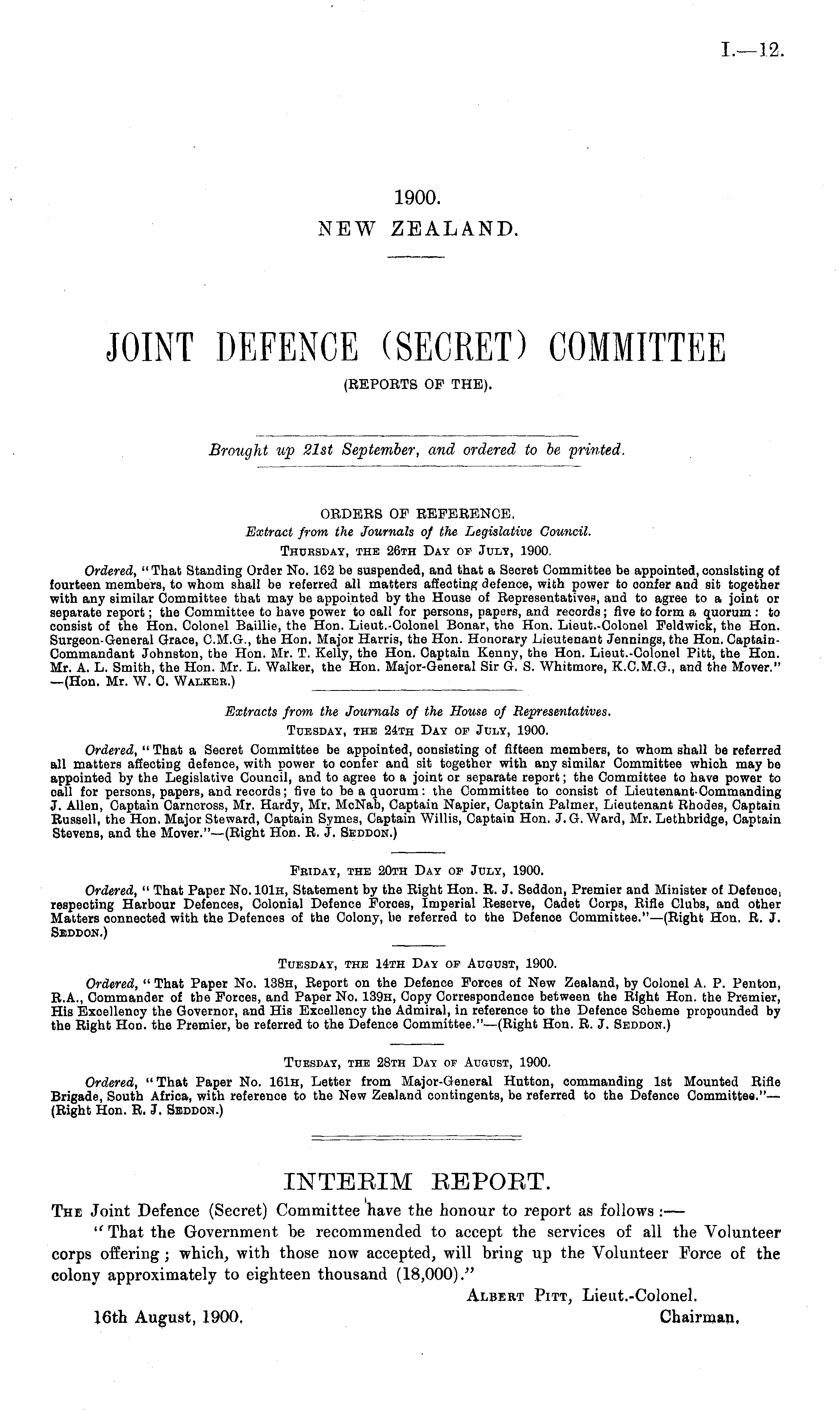 ORDERS OF REFERENCE. Extract from the Journals of the Legislative Council. Thubsday, the 26th Day of July, 1900. Ordered, " That Standing Order No. 162 be suspended, and that a Secret Committee be appointed, consisting of fourteen members, to whom shall be referred all matters affecting defence, with power to confer and sit together with any similar Committee that may be appointed by the House of Representatives, and to agree to a joint or separate report; the Committee to have power to call for persons, papers, and records; five to form a quorum :to consist of the Hon. Colonel Baillie, the Hon. Lieut.-Colonel Bonar, the Hon. Lieut.-Colonel Feldwick, the Hon. Surgeon-General Grace, C.M.G., the Hon. Major Harris, the Hon. Honorary Lieutenant Jennings, the Hon. CaptainCommandant Johnston, the Hon. Mr. T. Kelly, the Hon. Captain Kenny, the Hon. Lieut.-Colonel Pitt, the Hon. Mr. A. L. Smith, the Hon. Mr. L. Walker, the Hon. Major-General Sir G. S. Whitmore, K.C.M.G., and the Mover." —(Hon. Mr. W. 0. Walker.)