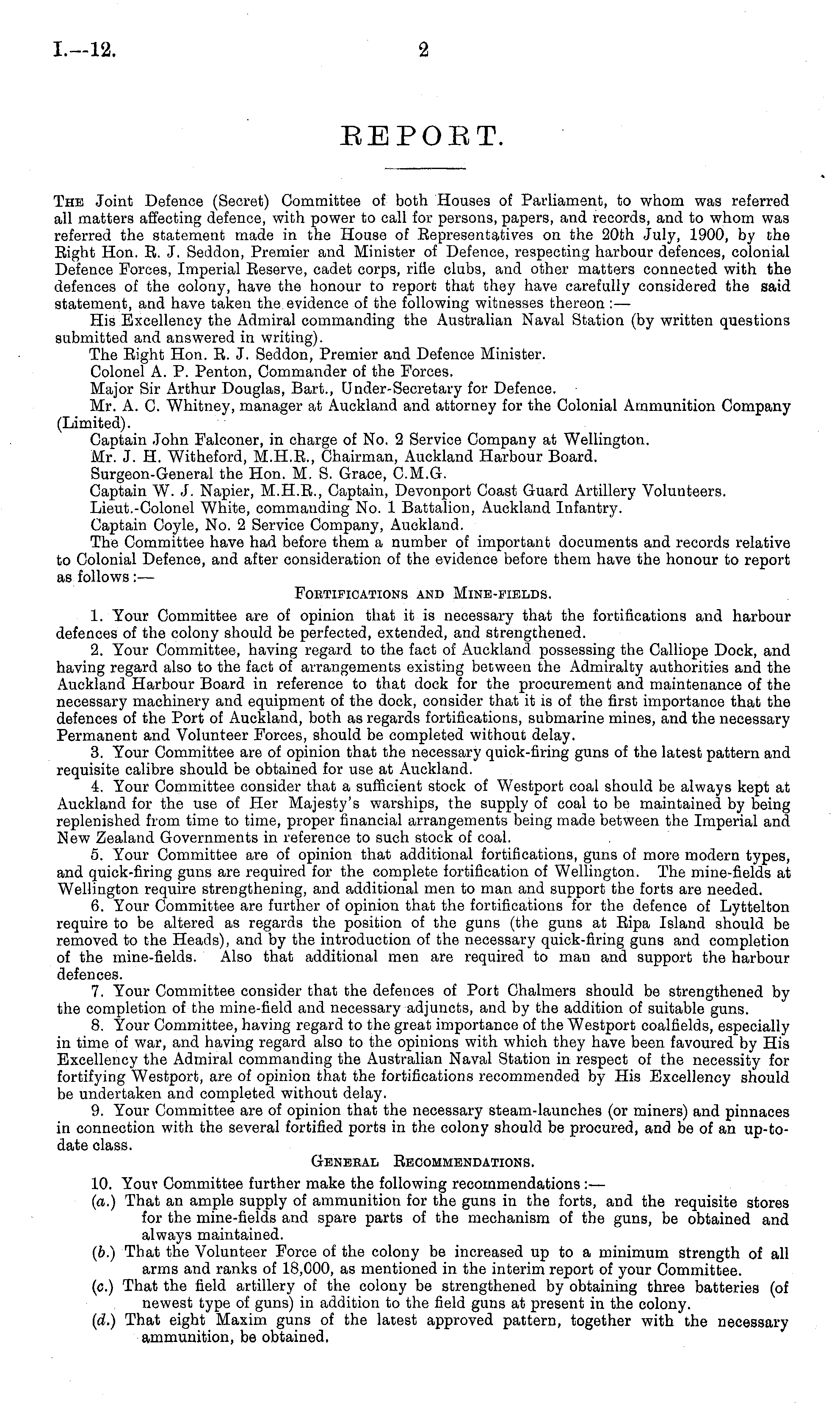 The Joint Defence (Secret) Committee of both Houses of Parliament, to whom was referred all matters affecting defence, with power to call for persons, papers, and records, and to whom was referred the statement made in the House of Eepresentatives on the 20th July, 1900, by the Eight Hon. E. J. Seddon, Premier and Minister of Defence, respecting harbour defences, colonial Defence Forces, Imperial Eeserve, cadet corps, rifle clubs, and other matters connected with the defences of the colony, have the honour to report that they have carefully considered the said statement, and have taken the. evidence of the following witnesses thereon : — His Excellency the Admiral commanding the Australian Naval Station (by written questions submitted and answered in writing). The Eight Hon. E. J. Seddon, Premier and Defence Minister. Colonel A. P. Penton, Commander of the Forces. Major Sir Arthur Douglas, Bart., Under-Secretary for Defence. Mr. A. C. Whitney, manager at Auckland and attorney for the Colonial Ammunition Company (Limited). Captain John Falconer, in charge of No. 2 Service Company at Wellington. Mr. J. H. Witheford, M.H.E., Chairman, Auckland Harbour Board. Surgeon-General the Hon. M. S. Grace, C.M.G. Captain W. J. Napier, M.H.E., Captain, Devonport Coast Guard Artillery Volunteers. Lieut.-Colonel White, commanding No. 1 Battalion, Auckland Infantry. Captain Coyle, No. 2 Service Company, Auckland. The Committee have had before them a number of important documents and records relative to Colonial Defence, and after consideration of the evidence before them have the honour to report as follows: — Foetifications and Mine-fields. 1. Your Committee are of opinion that it is necessary that the fortifications and harbour defences of the colony should be perfected, extended, and strengthened. 2. Your Committee, having regard to the fact of Auckland possessing the Calliope Dock, and having regard also to the fact of arrangements existing between the Admiralty authorities and the Auckland Harbour Board in reference to that dock for the procurement and maintenance of the necessary machinery and equipment of the dock, consider that it is of the first importance that the defences of the Port of Auckland, both as regards fortifications, submarine mines, and the necessary Permanent and Volunteer Forces, should be completed without delay. 3. Your Committee are of opinion that the necessary quick-firing guns of the latest pattern and requisite calibre should be obtained for use at Auckland. 4. Your Committee consider that a sufficient stock of Westport coal should be always kept at Auckland for the use of Her Majesty's warships, the supply of coal to be maintained by being replenished from time to time, proper financial arrangements being made between the Imperial and New Zealand Governments in reference to such stock of coal. 5. Your Committee are of opinion that additional fortifications, guns of more modern types, and quick-firing guns are required for the complete fortification of Wellington. The mine-fields at Wellington require strengthening, and additional men to man and support the forts are needed. 6. Your Committee are further of opinion that the fortifications for the defence of Lyttelton require to be altered as regards the position of the guns (the guns at Eipa Island should be removed to the Heads), and by the introduction of the necessary quick-firing guns and completion of the mine-fields. Also that additional men are required to man and support the harbour defences. 7. Your Committee consider that the defences of Port Chalmers should be strengthened by the completion of the mine-field and necessary adjuncts, and by the addition of suitable guns. 8. Your Committee, having regard to the great importance of the Westport coalfields, especially in time of war, and having regard also to the opinions with which they have been favoured by His Excellency the Admiral commanding the Australian Naval Station in respect of the necessity for fortifying Westport, are of opinion that the fortifications recommended by His Excellency should be undertaken and completed without delay. 9. Your Committee are of opinion that the necessary steam-launches (or miners) and pinnaces in connection with the several fortified ports in the colony should be procured, and be of an up-to-date class. Geneeal Eecommendations. 10. Your Committee further make the following recommendations: — (a.) That an ample supply of ammunition for the guns in the forts, and the requisite stores for the mine-fields and spare parts of the mechanism of the guns, be obtained and always maintained. (b.) That the Volunteer Force of the colony be increased up to a minimum strength of all arms and ranks of 18,C00, as mentioned in the interim report of your Committee, (c.) That the field artillery of the colony be strengthened by obtaining three batteries (of newest type of guns) in addition to the field guns at present in the colony. (d.) That eight Maxim guns of the latest approved pattern, together with the necessary ammunition, be obtained,