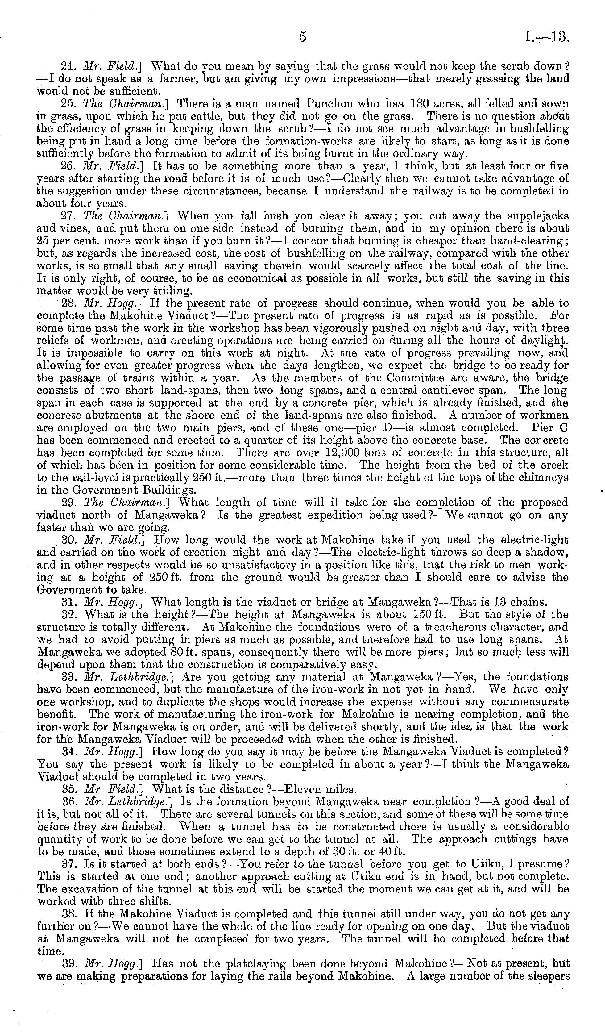 24. Mr. Field.] What do you mean by saying that the grass would not keep the scrub down? -—I do not speak as a farmer, but am giving my own impressions—that merely grassing the land would not be sufficient. 25. The Chairman.] There is a man named Punchon who has 180 acres, all felled and sown in grass, upon which he put cattle, but they did not go on the grass. There is no question about the efficiency of grass in keeping down the scrub ? : —I do not see much advantage in bushfelling being put in hand a long time before the formation-works are likely to start, as long as it is done sufficiently before the formation to admit of its being burnt in the ordinary way. 26. Mr. Field.] It has to be something more than a year, I think, but at least four or five years after starting the road before it is of much use?— Clearly then we cannot take advantage of the suggestion under these circumstances, because I understand the railway is to be completed in about four years. 27. The Chairman.] When you fall bush you clear it away; you cut away the supplejacks and vines, and put them on one side instead of burning them, and in my opinion there is about 25 per cent, more work than if you burn it ?—I concur that burning is cheaper than hand-clearing ; but, as regards the increased cost, the cost of bushfelling on the railway, compared with the other works, is so small that any small saving therein would scarcely affect the total cost of the line. It is only right, of course, to be as economical as possible in all works, but still the saving in this matter would be very trifling. 28. Mr. Hogg.] If the present rate of progress should continue, when would you be able to complete the Makohine Viaduct ?—The present rate of progress is as rapid as is possible. For some time past the work in the workshop has been vigorously pushed on night and day, with three reliefs of workmen, and erecting operations are being carried on during all the hours of daylight. It is impossible to carry on this work at night. At the rate of progress prevailing now, and allowing for even greater progress when the days lengthen, we expect the bridge to be ready for the passage of trains within a year. As the members of the Committee are aware, the bridge consists of two short land-spans, then two long spans, and a central cantilever span. The long span in each case is supported at the end by a concrete pier, which is already finished, and the concrete abutments at the shore end of the land-spans are also finished. A number of workmen are employed on the two main piers, and of these one—pier D—is almost completed. Pier C has been commenced and erected to a quarter of its height above the concrete base. The concrete has been completed for some time. There are over 12,000 tons of concrete in this structure, all of which has been in position for some considerable time. The height from the bed of the creek to the rail-level is practically 250 ft.—more than three times the height of the tops of the chimneys in the Government Buildings. 29. The Chairman.] What length of time will it take for the completion of the proposed viaduct north of Mangaweka ? Is the greatest expedition being used ?—We cannot go on any faster than we are going. 30. Mr. Field.] How long would the work at Makohine take if you used the electric-light and carried on the work of erection night and day ? —The electric-light throws so deep a shadow, and in other respects would be so unsatisfactory in a position like this, that the risk to men working at a height of 250 ft. from the ground would be greater than I should care to advise the Government to take. 31. Mr. Hogg.] What length is the viaduct or bridge at Mangaweka?—That is 13 chains. 32. What is the height?— The height at Mangaweka is about 150 ft. But the style of the structure is totally different. At Makohine the foundations were of a treacherous character, and we had to avoid putting in piers as much as possible, and therefore had to use long spans. At Mangaweka we adopted 80 ft. spans, consequently there will be more piers; but so much less will depend upon them that the construction is comparatively easy. 33. Mr. Lethbridge.] Are you getting any material at Mangaweka ?—Yes, the foundations have been commenced, but the manufacture of the iron-work in not yet in hand. We have only one workshop, and to duplicate the shops would increase the expense without any commensurate benefit. The work of manufacturing the iron-work for Makohine is nearing completion, and the iron-work for Mangaweka is on order, and will be delivered shortly, and the idea is that the work for the Mangaweka Viaduct will be proceeded with when the other is finished. 34. Mr. Hogg.] How long do you say it may be before the Mangaweka Viaduct is completed? You say the present work is likely to be completed in about a year ?—I think the Mangaweka Viaduct should be completed in two years. 35. Mr. Field.] What is the distance ? —Eleven miles. 36. Mr. Lethbridge.] Is the formation beyond Mangaweka near completion ?—A good deal of it is, but not all of it. There are several tunnels on this section, and some of these will be some time before they are finished. When a tunnel has to be constructed there is usually a considerable quantity of work to be done before we can get to the tunnel at all. The approach cuttings have to be made, and these sometimes extend to a depth of 30 ft. or 40 ft. 37. Is it started at both ends ? —You refer to the tunnel before you get to Utiku, I presume? This is started at one end; another approach cutting at Dtiku end is in hand, but not complete. The excavation of the tunnel at this end will be started the moment we can get at it, and will be worked with three shifts. 38. If the Makohine Viaduct is completed and this tunnel still under way, you do not get any further on ? —We cannot have the whole of the line ready for opening on one day. But the viaduct at Mangaweka will not be completed