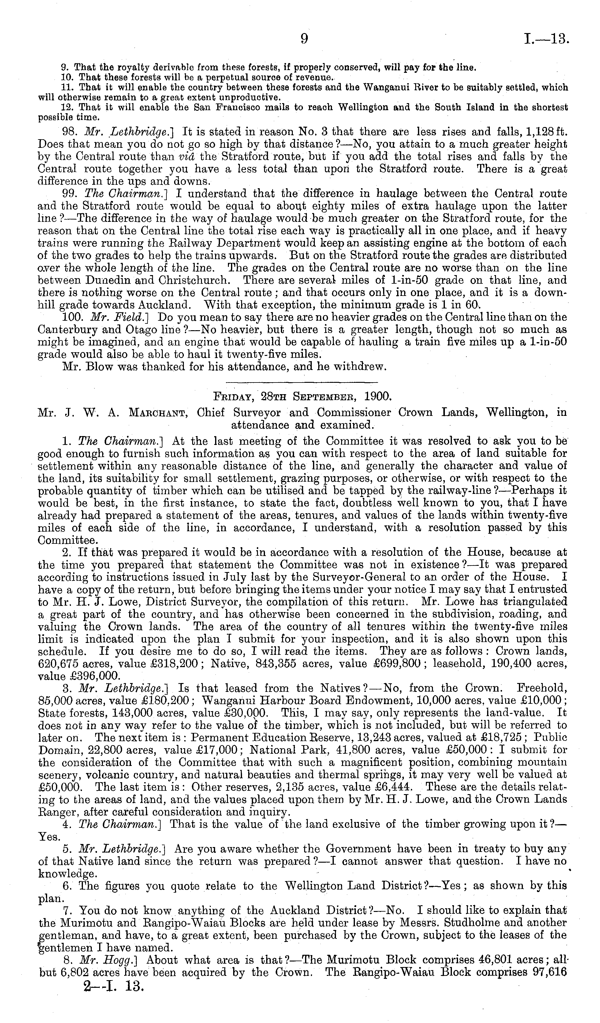 Fbiday, 28th September, 1900. Mr. J. W. A. Marchant, Chief Surveyor and Commissioner Crown Lands, Wellington, in attendance and examined. 1. The Chairman.] At the last meeting of the Committee it was resolved to ask you to be good enough to furnish such information as you can with respect to the area of land suitable for settlement within any reasonable distance of the line, and generally the character and value of the land, its suitability for small settlement, grazing purposes, or otherwise, or with respect to the probable quantity of timber which can be utilised and be tapped by the railway-line ?—Perhaps it would be best, in the first instance, to state the fact, doubtless well known to you, that I have already had prepared a statement of the areas, tenures, and values of the lands within twenty-five miles of each side of the line, in accordance, I understand, with a resolution passed by this Committee. 2. If that was prepared it would be in accordance with a resolution of the House, because at the time you prepared that statement the Committee was not in existence ? —lt was prepared according to instructions issued in July last by the Surveyor-General to an order of the House. I have a copy of the return, but before bringing the items under your notice I may say that I entrusted to Mr. H. J. Lowe, District Surveyor, the compilation of this return. Mr. Lowe has triangulated a great part of the country, and has otherwise been concerned in the subdivision, roading, and valuing the Crown lands. The area of the country of all tenures within the twenty-five miles limit is indicated upon the plan I submit for your inspection, and it is also shown upon this schedule. If you desire me to do so, I will read the items. They are as follows : Crown lands, 620,675 acres, value £318,200; Native, 843,355 acres, value £699,800; leasehold, 190,400 acres, value £396,000. 3. Mr. Lethbridge.] Is that leased from the Natives?—No, from the Crown. Freehold, 85,000 acres, value £180,200 ; Wanganui Harbour Board Endowment, 10,000 acres, value £10,000 ; State forests, 143,000 acres, value £30,000. This, I may say, only represents the land-value. It does not in any way refer to the value of the timber, which is not included, but will be referred to later on. The next item is : Permanent Education Eeserve, 13,243 acres, valued at £18,725; Public Domain, 22,800 acres, value £17,000; National Park, 41,800 acres, value £50,000: I submit for the consideration of the Committee that with such a magnificent position, combining mountain scenery, volcanic country, and natural beauties and thermal springs, it may very well be valued at £50,000. The last item is : Other reserves, 2,135 acres, value £6,444. These are the details relating to the areas of land, and the values placed upon them by Mr. H. J. Lowe, and the Crown Lands Eanger, after careful consideration and inquiry. 4. The Chairman.] That is the value of the land exclusive of the timber growing upon it?— Yes. 5. Mr. Lethbridge.] Are you aware whether the Government have been in treaty to buy any of that Native land since the return was prepared ?—I cannot answer that question. I have no knowledge. 6. The figures you quote relate to the Wellington Land District ?—Yes ; as shown by this plan. 7. You do not know anything of the Auckland District?— No. I should like to explain that the Murimotu and Eangipo-Waiau Blocks are held under lease by Messrs. Studholme and another gentleman, and have, to a great extent, been purchased by the Crown, subject to the leases of the gentlemen I have named. 8. Mr. Hogg.] About what area is that ?—The Murimotu Block comprises 46,801 acres; all but 6,802 acres have been acquired by the Crown. The Eangipo-Waiau Block comprises 97,616