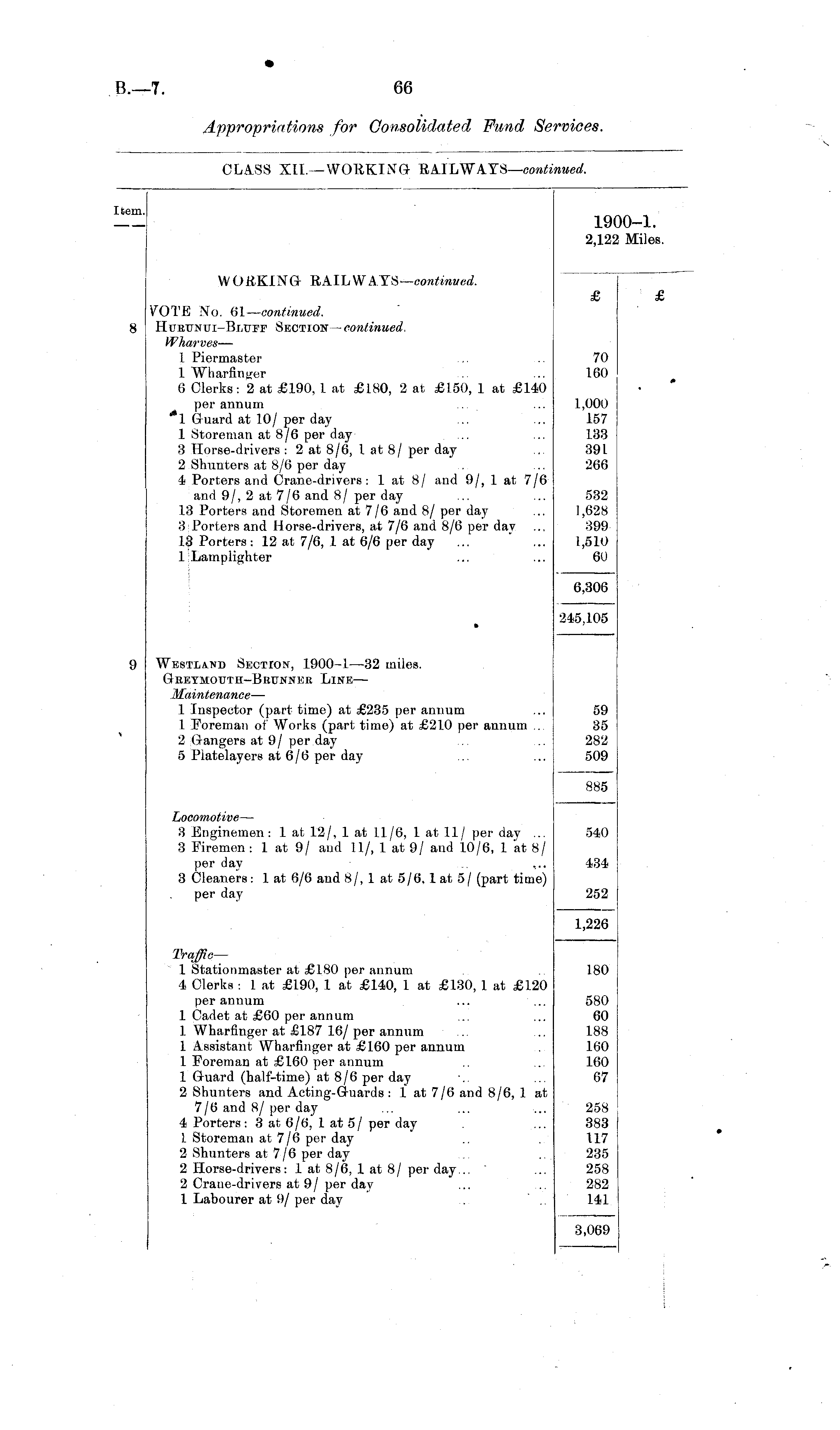 tern. 19 2,12: ►0—1. Miles. WORKING- RAILWAYS— continued. VOTE No. 61— continued. Hurtjniti-Bjyctf Section — continued. Wharves — 1 Piermaster 1 Wharfinger 6 Clerks: 2 at £190, 1 at £L80, 2 at £150, 1 at £140 £ 70 160 0 per annum 1 Guard at 10/ per day 1 Storeman at 8/6 per day 3 Horse-drivers : 2 at 8/6, 1 at 8/ per day 2 Shunters at 8/6 per day 4 Porters and Crane-drivers : 1 at 8/ and 9/, 1 at 7/6 and 9/, 2 at 7/6 and 8/ per day 13 Porters and Storemen at 7/6 and 8/ per day 3 Porters and Horse-drivers, at 7/6 and 8/6 per day 13 Porters: 12 at 7/6, 1 at 6/6 per day 1 Lamplighter 1,000 157 133 39 L 266 532 1,628 399 1,510 60 6,306 • 245,105 Westland Section, 1900-1 —32 miles. Greymouth-Brunner Line— Maintenance— 1 Inspector (part time) at £235 per annum 1 Foreman of Works (part time) at £210 per annum ... 2 Gangers at 9/ per day 5 Platelayers at 6/6 per day 59 35 282 509 885 Locomotive — 3 Enginemen : 1 at 12/, 1 at 11/6, 1 at 11/ per day ... 3 Firemen : 1 at 9/ and 11/, 1 at 9/ and 10/6, 1 at 8/ per day ... ... 3 Cleaners: 1 at 6/6 and 8/, 1 at 5/6,1 at 5/ (part time) per day 540 434 252 1,226 Ih-qffic— 1 Stationmaster at £180 per annum 4 Clerks : 1 at £190, 1 at £140, 1 at £130, 1 at £120 180 per annum 1 Cadet at £60 per annum 1 Wharfinger at £187 16/per annum ... 1 Assistant Wharfinger at £160 per annum 1 Foreman at £160 per annum 1 Ghiard (half-time) at 8/6 per day 2 Shunters and Acting-Guards: 1 at 7/6 and 8/6, 1 at 7/6 and 8/ per day 4 Porters: 3 at 6/(5, 1 at 5/ per day 1 Storeman at 7/6 per day 2 Shunters at 7/6 per day 2 Horse-drivers: 1 at 8/6, 1 at 8/ per day... 2 Crane-drivers at 9/ per day 1 Labourer at 9/ per day . 580 60 188 160 160 67 258 383 117 235 258 282 141 3,069