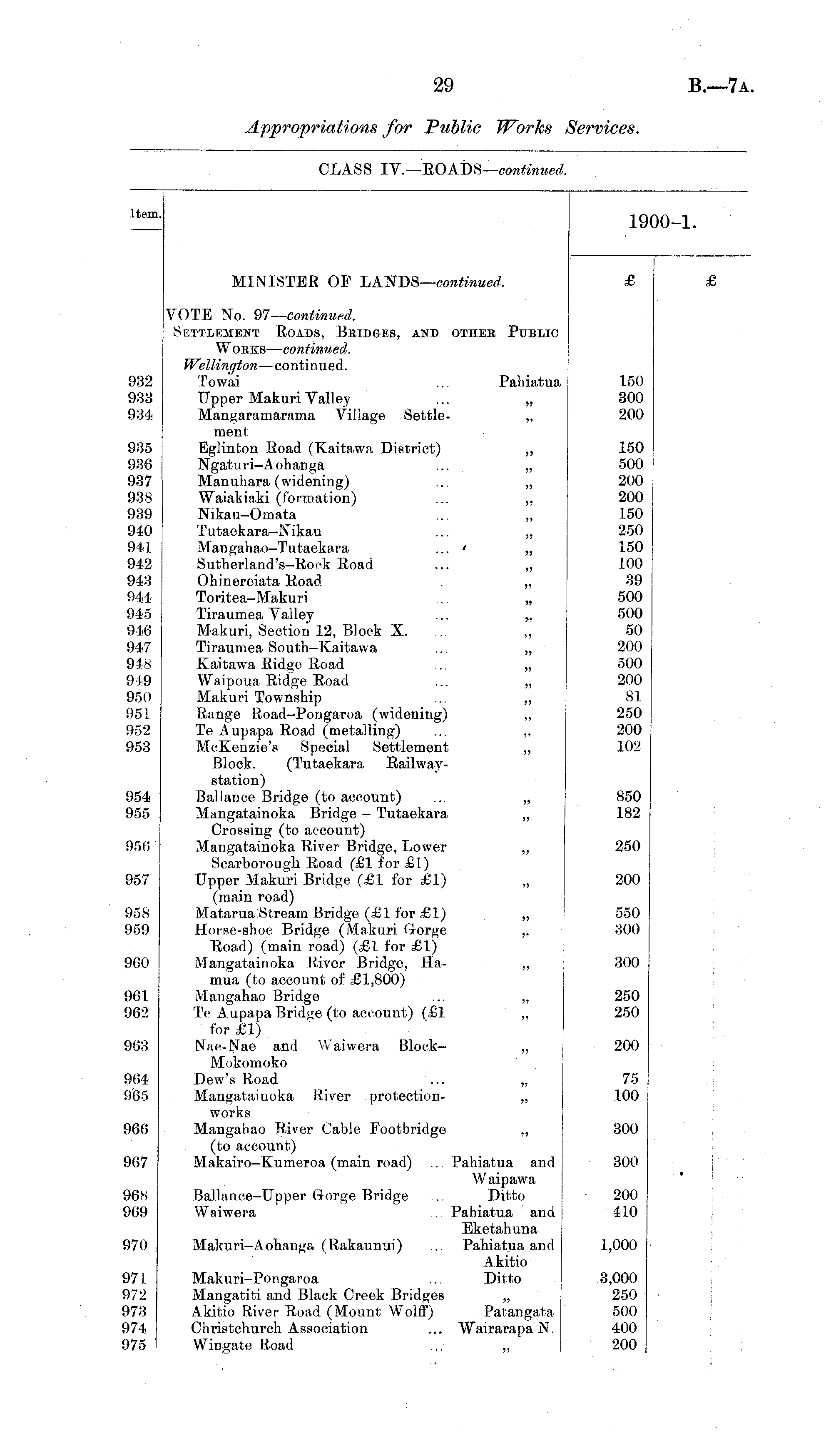 Item. 19 •0-1. MINISTER OF LANDS— continued. £ 954 955 932 933 934 935 936 937 938 939 940 94.1 942 943 944 945 946 947 948 949 950 951 952 953 VOTE No. 97— continued. Settlement Roads, Bridges, and other Public Works— continued. Wellington —continued. Towai ... Pahiatua Upper Makuri Valley ... „ Mangaramarama Village Settle- „ merit Eglinton Road (Kaitawa District) ,, Ngaturi-Aohanga ... „ Manubara (widening) ... „ Waiakiaki (formation) ... ,, Nikau-Omata ... „ Tutaekara-N"ikau ... „ Mangahao—Tutaekara ... ' „ Sutherland's-Rock Road ... „ Ohinereiata Eoad . ,, Toritea- Makuri ... „ Tiraumea Valley ... „ Makuri, Section 12, Block X. ... „ Tiraumea South-Kaitawa ... „ Kaitawa Ridge Road ... „ Waipoua Ridge Road ... „ Makuri Township ... ,, Range Road—Pongaroa (widening) ,, Te Aupapa Road (metalling) ... ,. McKenzie's Special Settlement „ Block. (Tutaekara Railwaystation) Baliance Bridge (to account) ... „ Mangatainoka Bridge - Tutaekara „ Crossing (to account) Mangata,inoka River Bridge, Lower ,, Scarborough Road (£1 for £1) Upper Makuri Bridge (£1 for £1) „ (main road) Matarua Stream Bridge (£1 for £1) „ Horse-shoe Bridge (Makuri Gorge ,, Road) (main road) (£1 for £1) Mangatainoka Eiver Bridge, Ha- ,, mua (to account of £1,800) Mangahao Bridge ... ,, T<? Aupapa Bridge (to account) (£1 ,, for £1) Nae-Nae and Waiwera Block- ,, Mokomoko Dew's Road ... „ Mangatainoka River protection- ,, works Mangahao River Cable Footbridge „ (to account) Makairo-Kumeroa (main road) ... Pahiatua and Waipawa Ballanoe-Upper Gorge Bridge ... Ditto Waiwera .. Pahiatua and Eketahuna Makuri-Aohanga (Rakaunui) ... Pahiatua and Akitio Makuri-Pongaroa ... Ditto Mangatiti and Black Creek Bridges „ Akitio River Road (Mount Wolff) Patangata Christchurch Association ... Wairarapa N. Win gate Road ,,, ,, 150 300 200 150 500 200 200 150 250 150 100 39 500 500 50 200 500 200 81 250 200 102 850 182 956 250 957 200 958 959 550 300 960 300 961 962 250 250 963 200 964 965 75 100 966 300 967 300 I 968 969 200 410 970 1,000 971 972 973 974 975 3,000 250 500 400 200