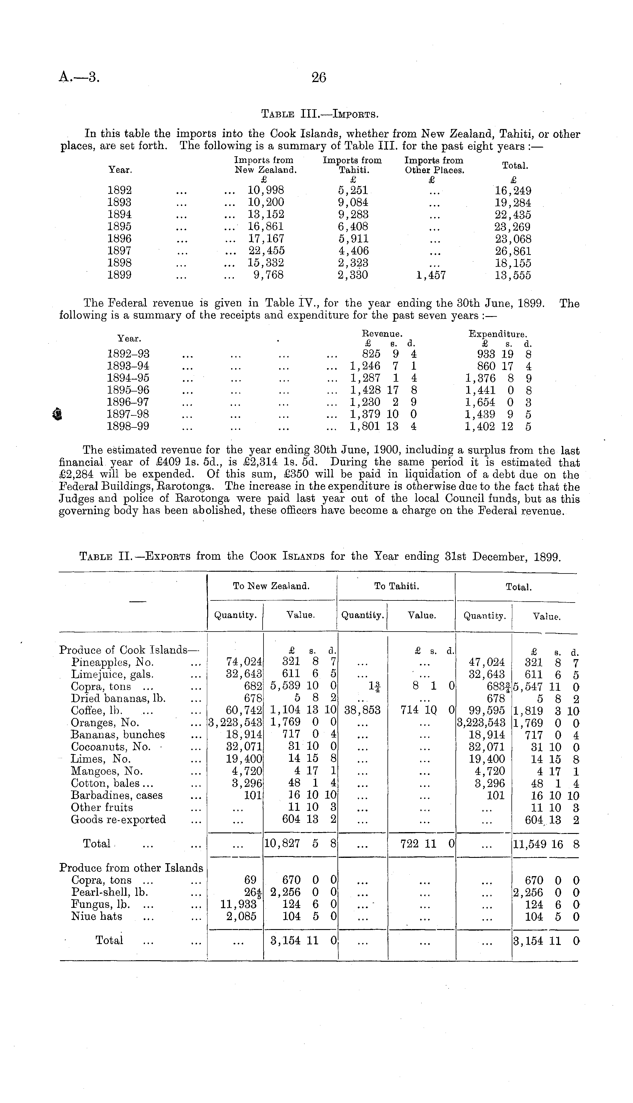 Table III.—Imports. In this table the imports into the Cook Islands, whether from New Zealand, Tahiti, or other places, are set forth. The following is a summary of Table III. for the past eight years:—