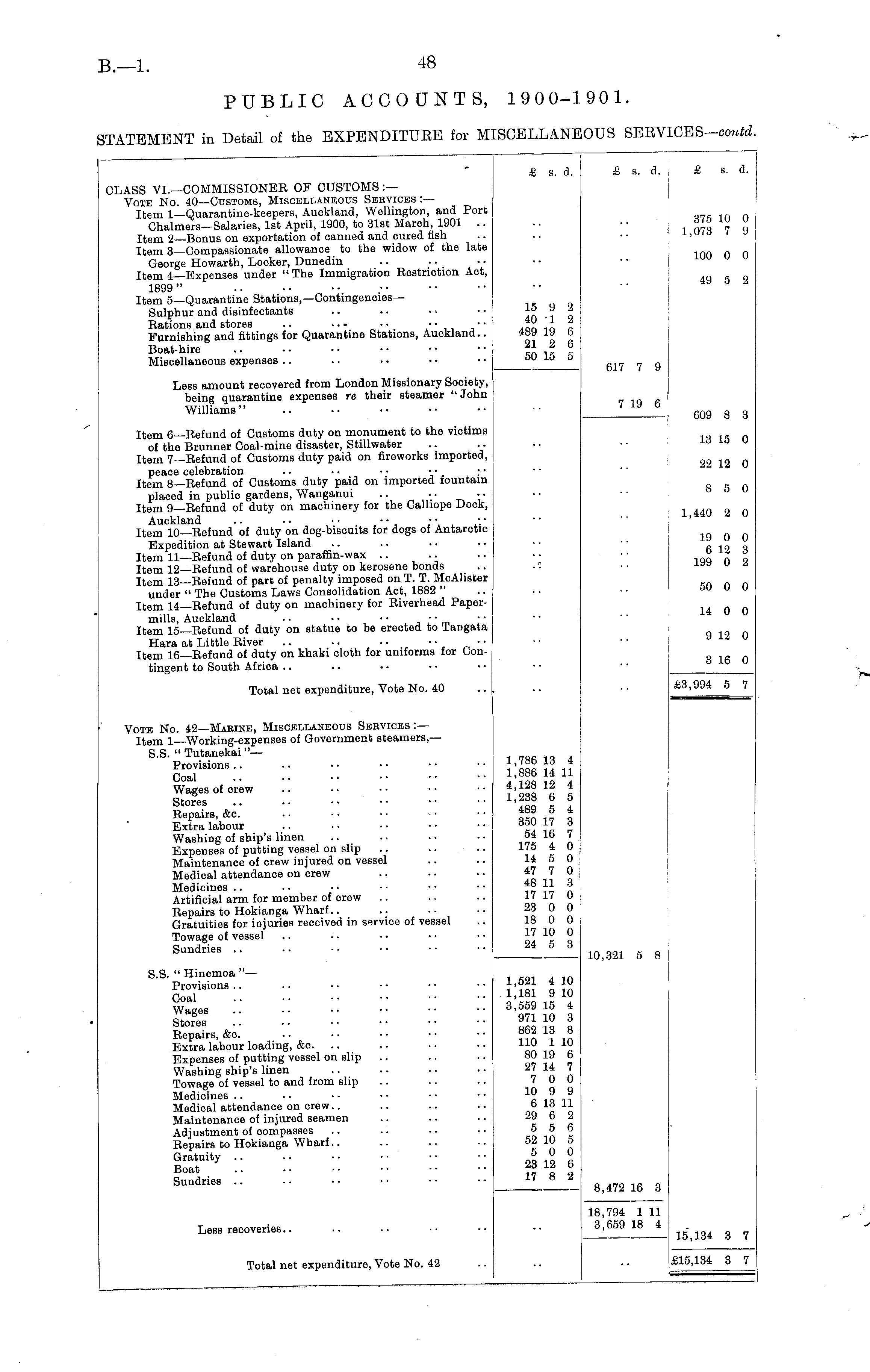 CLASS VI.—COMMISSIONER OF CUSTOMS :— Vote No. 40—Customs, Miscellaneous Services :— Item 1—Quarantine-keepers, Auckland, Wellington, and Port Chalmers—Salaries, 1st April, 1900, to 31st March, 1901 .. Item 2—Bonus on exportation of canned and cured fish Item 3—Compassionate allowance to the widow of the late George Howarth, Locker, Dunedin Item 4—Expenses under "The Immigration Restriction Act, 1899" Item 5—Quarantine Stations,— ContingenciesSulphur and disinfectants Rations and stores .. • ■ • • • • • Furnishing and fittings for Quarantine Stations, Auckland.. Boat-hire Miscellaneous expenses £ s. d. £ s. d. £ s. d. 375 10 0 1,073 7 9 100 0 0 49 5 2 15 9 2 40 1 2 489 19 6 21 2 6 50 15 5 617 7 9 Less amount recovered from London Missionary Society, being quarantine expenses re their steamer " John Williams" 7 19 6 609 8 3 Item 6—Refund of Customs duty on monument to the victims of the Brunner Coal-mine disaster, Stillwater Item 7—Refund of Customs duty paid on fireworks imported, peace celebration Item 8—Refund of Customs duty paid on imported fountain placed in public gardens, Wanganui .. .. • • Item 9—Refund of duty on machinery for the Calliope Dock, Auckland .. • ■ ■ ■ Item 10—Refund of duty on dog-biscuits for dogs of Antarctic Expedition at Stewart Island Item 11—Refund of duty on paraffin-wax Item 12—Refund of warehouse duty on kerosene bonds Item 13—Refund of part of penalty imposed on T. T. McAhster under " The Customs Laws Consolidation Act, 1882 " Item 14—Refund of duty on machinery for Riverhead Papermills, Auckland .. • • • • • • Item 15—Refund of duty on statue to be erected to Tangata Hara at Little River .. .. • ■ • • • • Item 16—Refund of duty on khaki cloth for uniforms for Contingent to South Africa 13 15 0 22 12 0 8 5 0 1,440 2 0 19 0 0 6 12 3 199 0 2 50 0 0 14 0 0 9 12 0 3 16 0 Total net expenditure, Vote No. 40 £3,994 5 7 Vote No. 42—Marine, Miscellaneous Services :— Item 1—Working-expenses of Government steamers — S.S. " Tutanekai "— Provisions Coal Wages of orew Stores Repairs, &c. Extra labour Washing of ship's linen Expenses of putting vessel on slip Maintenance of crew injured on vessel Medical attendance on crew Medicines Artificial arm for member of crew Repairs to Hokianga Wharf.. Gratuities for injuries received in service of vessel Towage of vessel Sundries 1,786 13 4 1,886 14 11 4,128 12 4 1,238 6 5 489 5 4 350 17 3 54 16 7 175 4 0 14 5 0 47 7 0 48 11 3 17 17 0 2.3 0 0 18 0 0 17 10 0 24 5 3 10,321 5 8 S.S. " Hinemoa " — Provisions Coal Wages Stores Repairs, &c. Extra labour loading, &o. .. Expenses of putting vessel on slip Washing ship's linen Towage of vessel to and from slip Medicines Medical attendance on crew.. Maintenance of injured seamen Adjustment of compasses Repairs to Hokianga Wharf.. Gratuity Boat Sundries 1,521 4 10 1,181 9 10 3,559 15 4 971 10 3 862 13 8 110 1 10 80 19 6 27 14 7 7 0 0 10 9 9 6 13 11 29 6 2 5 5 6 52 10 5 5 0 0 23 12 6 17 8 2 8,472 16 3 Less recoveries.. 18,794 1 11 3,659 18 4 15", 134 3 7 Total net expenditure, Vote No. 42 £15,134 3 7