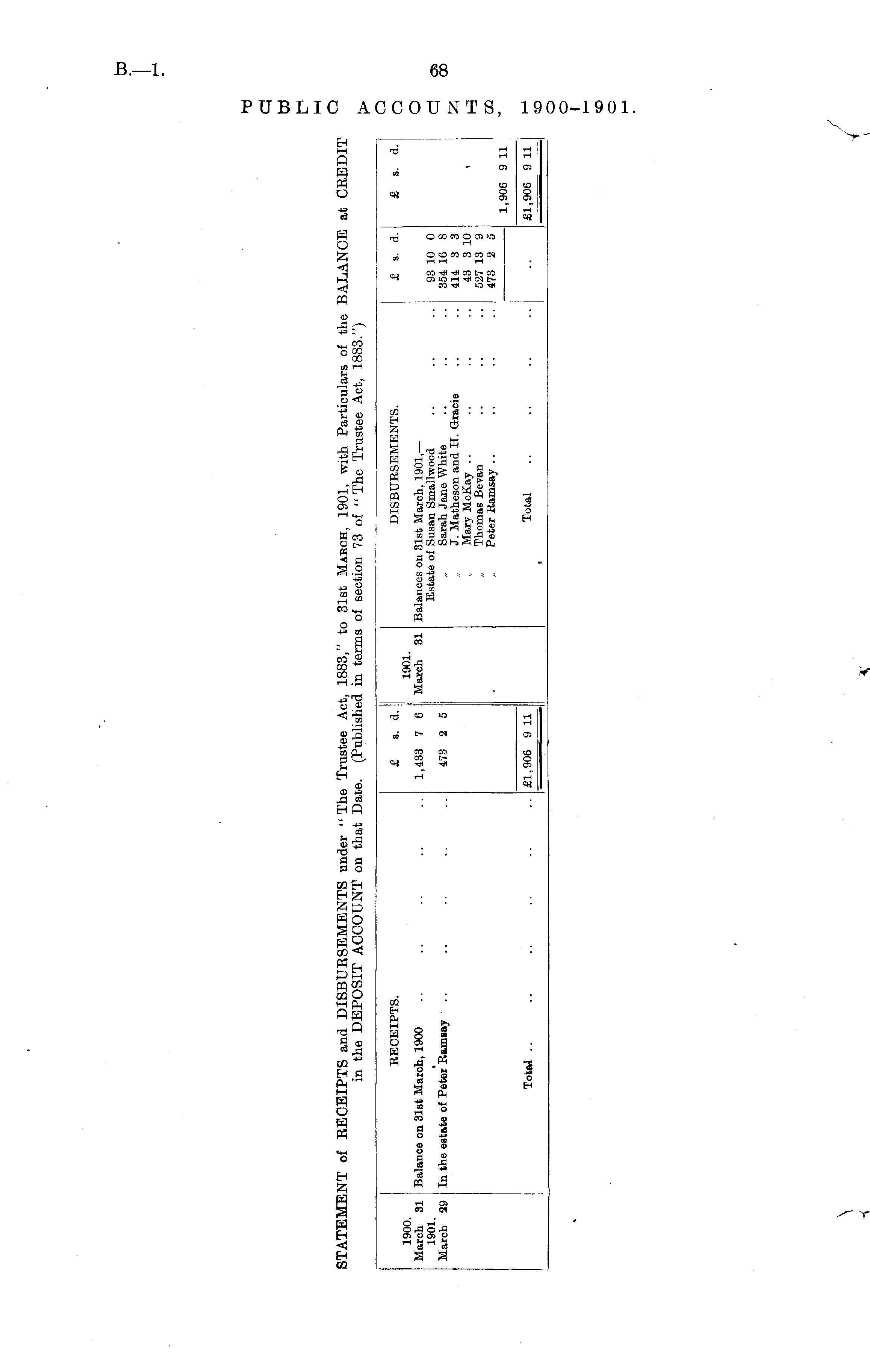 RECEIPTS. £ s. d. DISBURSEMENTS. £ s. d. £ s. d. 1900. March 31 1901. March 29 Balance on 31st March, 1900 1,433 7 6 1901. March 31 Balances on 31st March, 1901, — Estate of Susan Smallwood Sarah Jane White J. Matheson and H. Gracie Mary McKay Thomas Bevan Peter Ramsay 93 10 0 354 16 8 414 3 3 43 3 10 527 13 9 473 2 5 In the estate of Peter Ramsay 473 2 5 t Total .. £1,906 9 11 Total 1,906 9 11 £1,906 9 11 •■ I