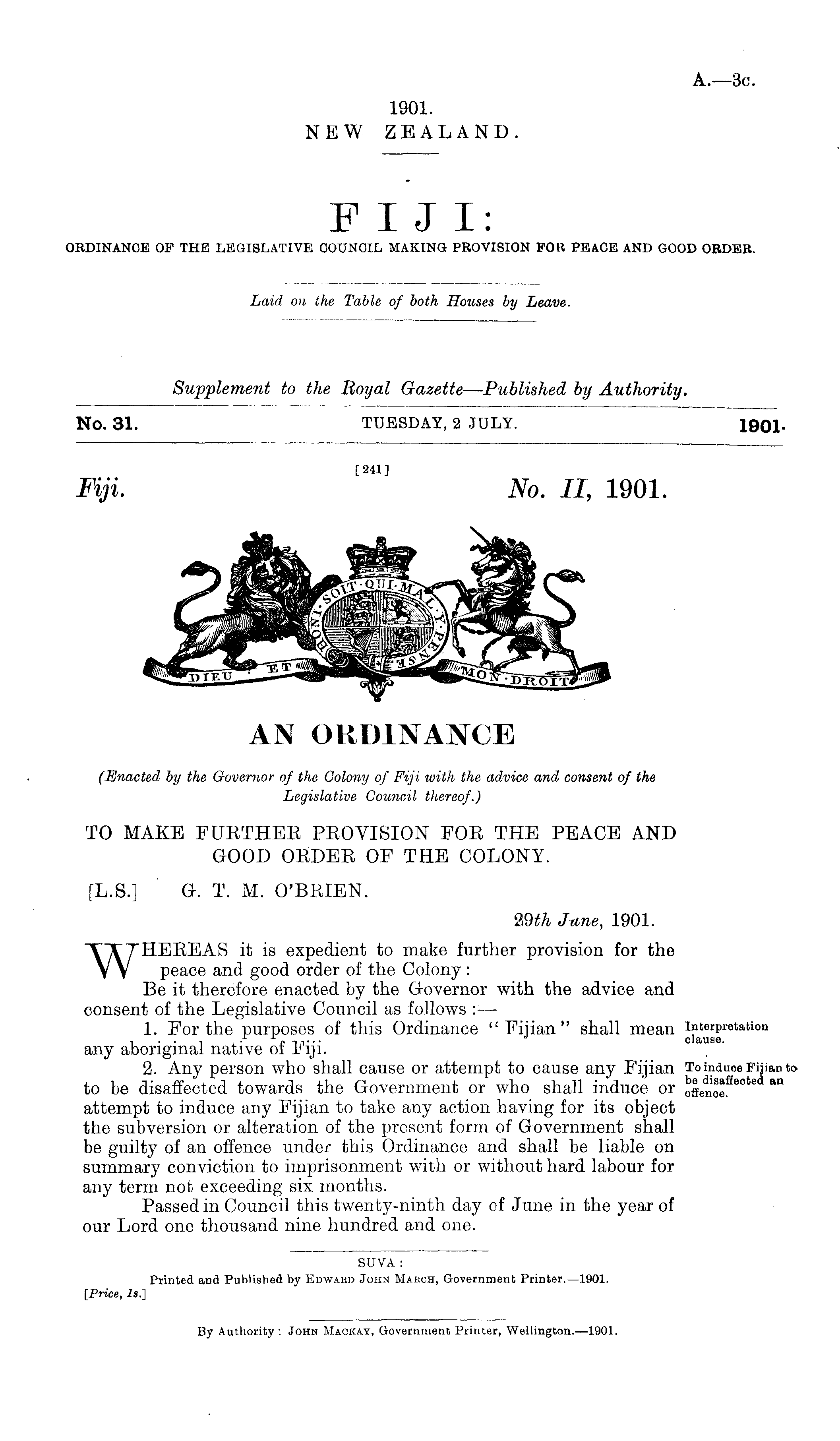 FIJI: ORDINANCE OF THE LEGISLATIVE COUNCIL MAKING PROVISION FOR PEACE AND GOOD ORDER.
