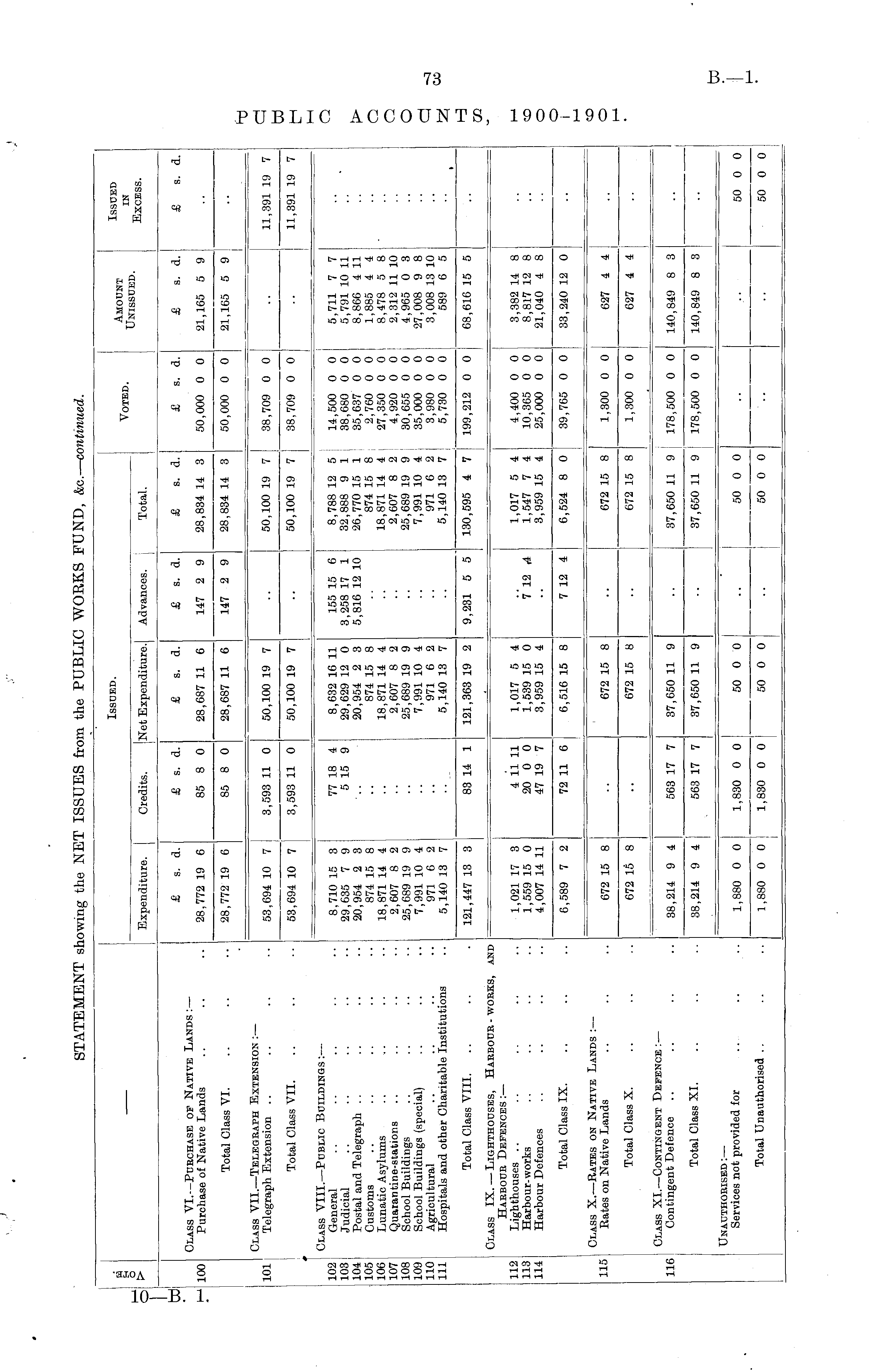 Issued. Issued in Excess. fH o > Voted. Amount Unissued. Expenditure. Credits. Net Expenditure. Advances. Total. £ s. d. £ s. d. £ s. d. £ s. d. £ s. d. £ s. d. £ s. d. £ s. d. 100 Class VI. —Purchase of Native Lands :— Purchase of Native Lands 28,772 19 6 85 8 0 28,687 11 6 147 2 9 28,834 14 3 50,000 0 0 21,165 5 9 Total Class VI. 28,772 19 6 85 8 0 28,687 11 6 147 2 9 28,834 14 3 50,000 0 0 21,105 5 9 Class VII. —Telegraph Extension :— Telegraph Extension 3,593 11 0 3,593 11 0 50,100 19 7 50,100 19 7 38,709 0 0 11,391 19 7 101 53,694 10 7 Total Class VII. 53,694 10 7 50,100 19 7 50,100 19 7 38,709 0 0 11,391 19 7 102 103 104 105 106 107 108 109 110 111 Class VIII. —Public Buildings :— General Judicial Postal and Telegraph Customs Lunatic Asylums Quarantine-stations School Buildings School Buildings (special) Agricultural Hospitals and other Charitable Institutions 8,710 15 3 29,635 7 9 20,954 2 3 874 15 8 18,871 14 4 2,607 8 2 25,689 19 9 7,991 10 4 971 6 2 5,140 13 7 77 18 4 5 15 9 8,632 16 11 29,629 12 0 20,954 2 3 874 15 8 18,871 14 4 2,607 8 2 25,689 19 9 7,991 10 4 971 6 2 5,140 13 7 155 15 6 3,258 17 1 5,816 12 10 8,788 12 5 32,888 9 1 26,770 15 1 874 15 8 18,871 14 4 2,607 8 2 25,689 19 9 7,991 10 4 971 6 2 5,140 13 7 14,500 0 0 38,680 0 0 35,637 0 0 2,760 0 0 27,350 0 0 4,920 0 0 30,655 0 0 35,000 0 0 3,980 0 0 5,730 0 0 5,711 7 7 5,791 10 11 8,866 4 11 1,885 4 4 8,478 5 8 2,312 11 10 4,965 0 3 27,008 9 8 3,008 13 10 589 6 5 Total Class VIII. 121,447 13 3 83 14 1 121,363 19 2 9,231 5 5 130,595 4 7 199,212 0 0 68,616 15 5 112 113 114 Class IX. — Lighthouses, Harbour - works, Harbour Defences :— Lighthouses Harbour-works Harbour Defences AND 1,021 17 3 1,559 15 0 4,007 14 11 4 11 11 20 0 0 47 19 7 1,017 5 4 1,539 15 0 3,959 15 4 1,017 5 4 1,547 7 4 3,959 15 4 4,400 0 0 10,365 0 0 25,000 0 0 3,382 14 8 8,817 12 8 21,040 4 8 7* 12 ,4 Total Class IX. 6,589 7 2 72 11 6 6,516 15 8 7 12 4 6,524 8 0 39,765 0 0 33,240 12 0 Class X. —Rates on Native Lands :— Rates on Native Lands 115 672 15 8 672 15 8 672 15 8 1,300 0 0 627 4 4 Total Class X. 672 15 8 672 15 8 672 15 8 1,300 0 0 627 4 4 Class XI, —Contingent Defence :— Contingent Defence 116 38,214 9 4 563 17 7 37,650 11 9 37,650 11 9 178,500 0 0 140,849 8 3 Total Class XI. 38,214 9 4 563 17 7 37,650 11 9 37,650 11 9 178,500 0 0 140,849 8 3 Unauthorised :— Services not provided for I ' I 1,880 0 0 1,830 0 0 50 0 0 50 0 0 50 0 0 Total Unauthorised 1 50 0 0 50 0 0 1,880 0 0 1,830 0 0 50 0 0